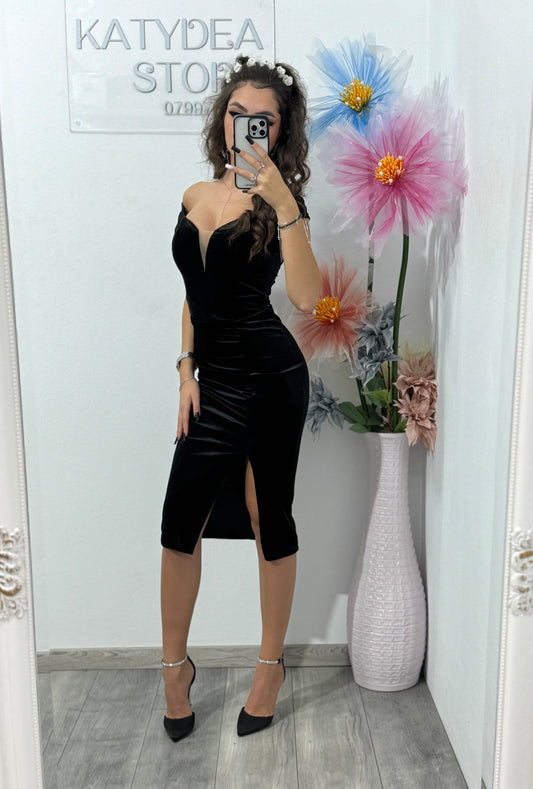 Rochie elegantă neagra din catifea, cu umeri goi și despicătură pe picior Lolita