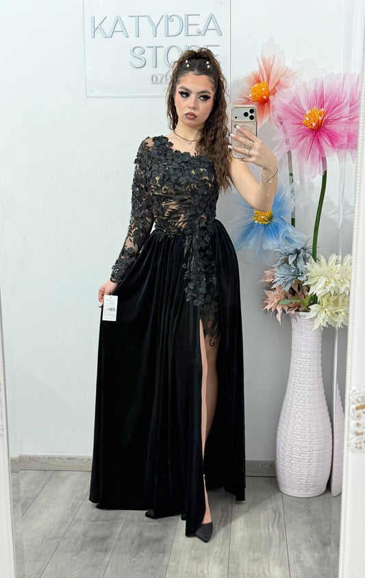 Rochie neagră spectaculoasă cu catifea și dantelă DELUX