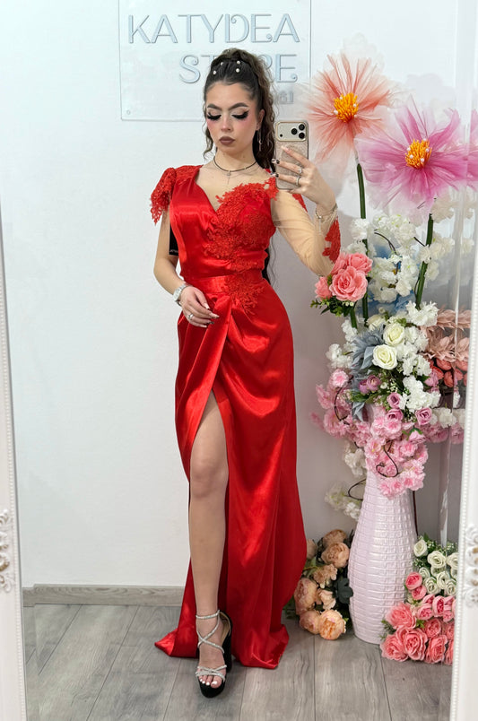 Rochie elegantă off-shoulder cu slit și detalii luxury