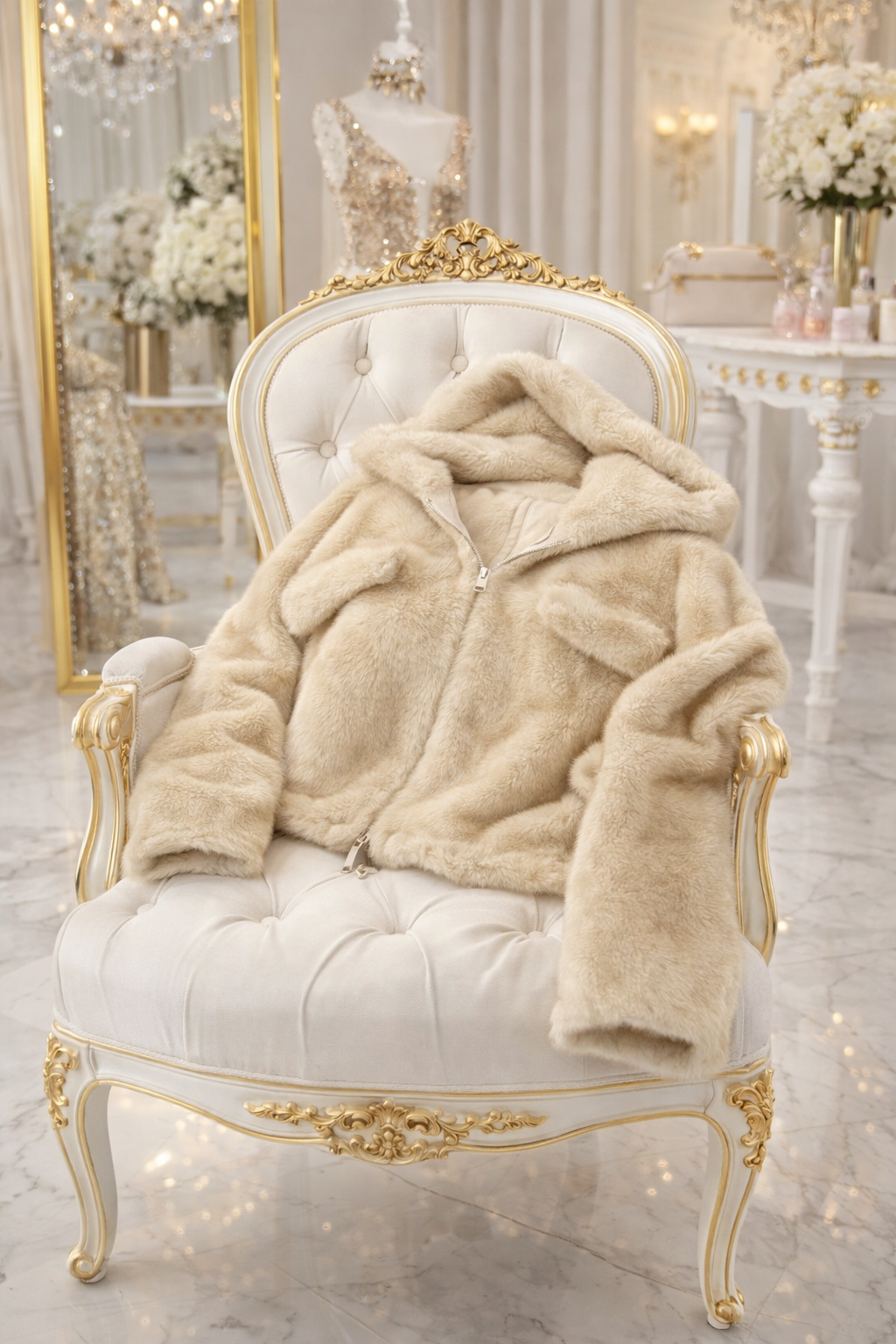 Materialul imită blana naturală, fiind dens, moale la atingere și cu un luciu discret, specific pieselor premium.
