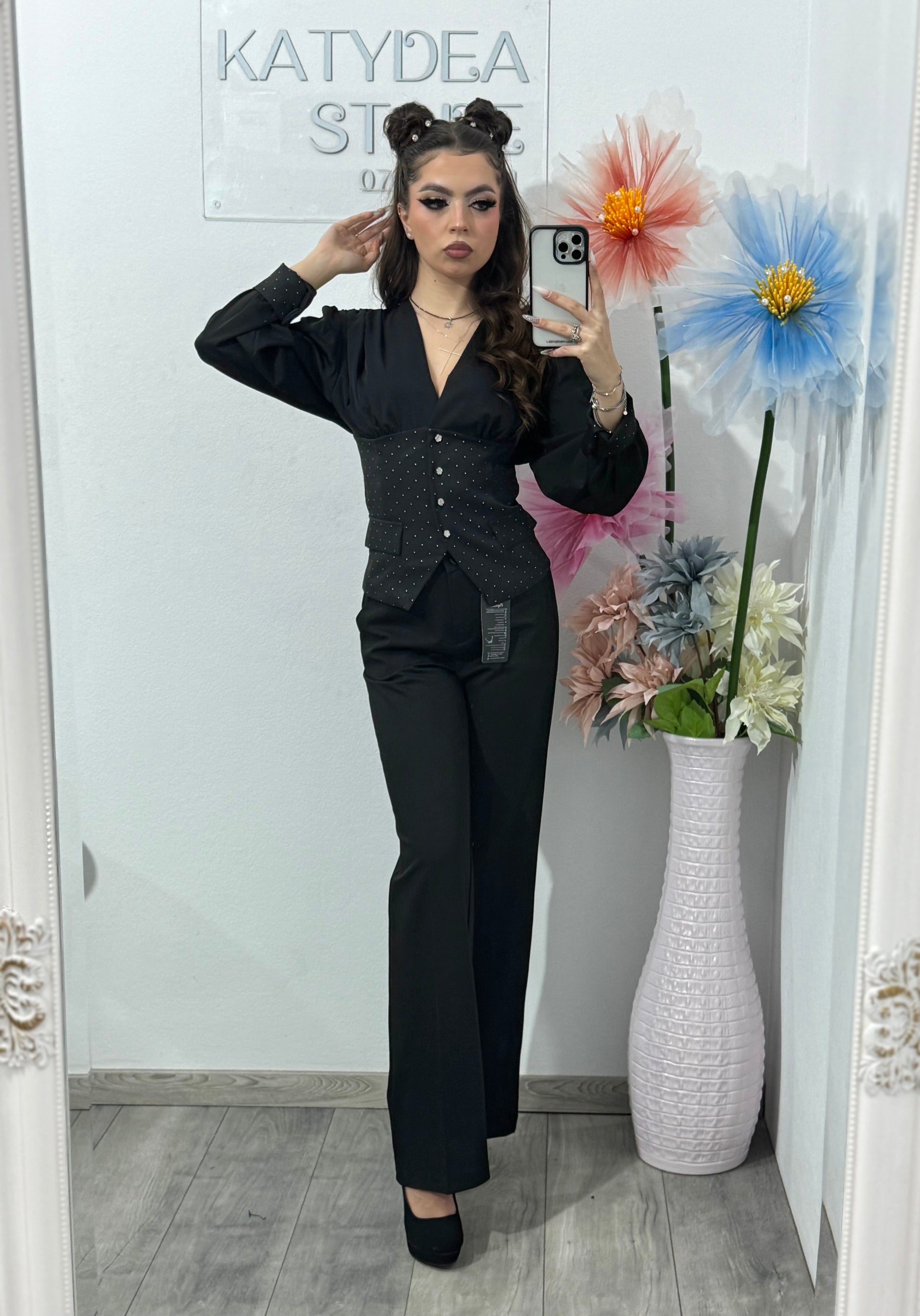 În zona frontală, bluza se închide cu nasturi-bijuterie în formă de floare, detalii strălucitoare care transformă piesa într-un element de efect, perfect pentru o ținută cu accente prețioase.