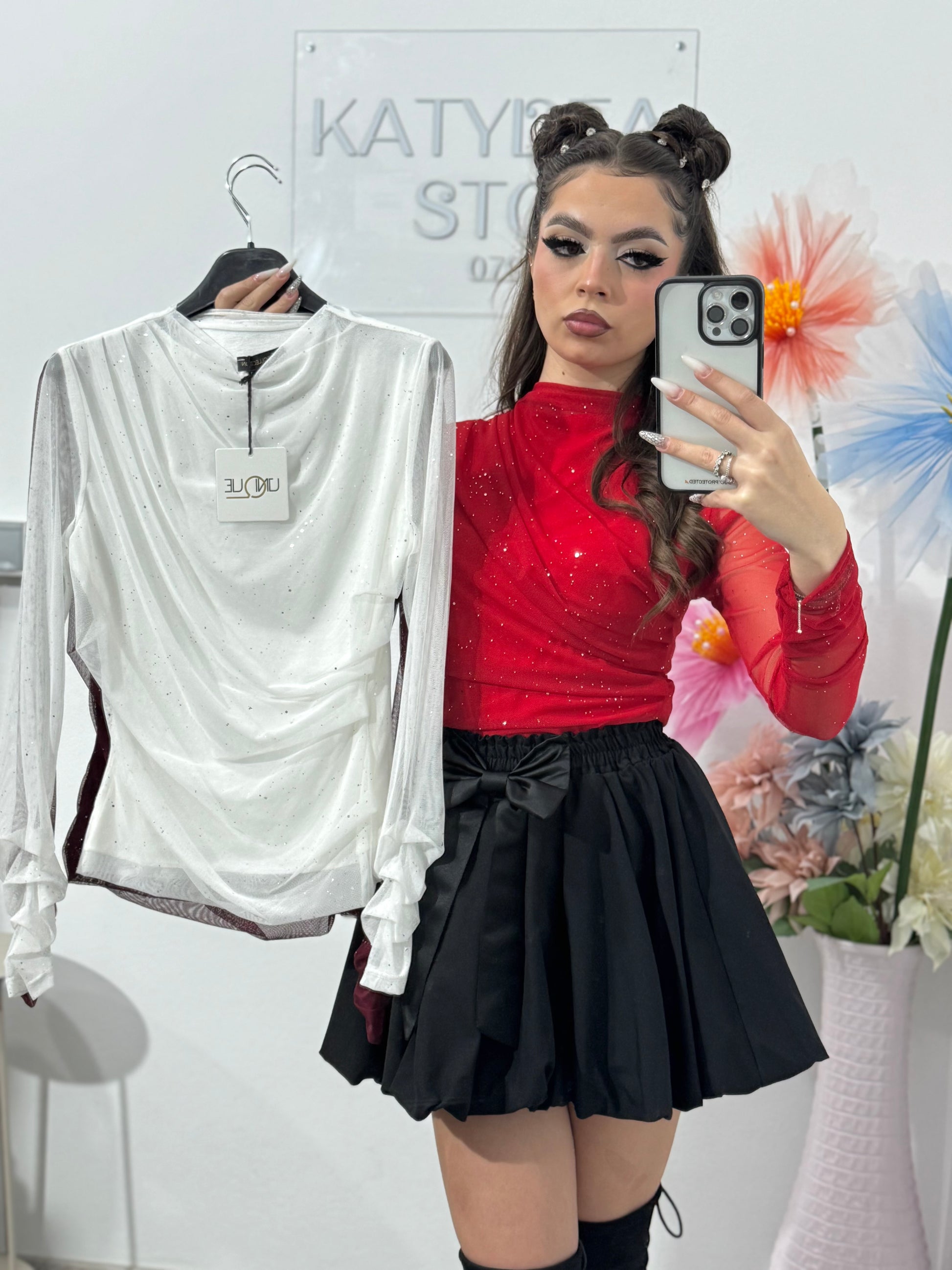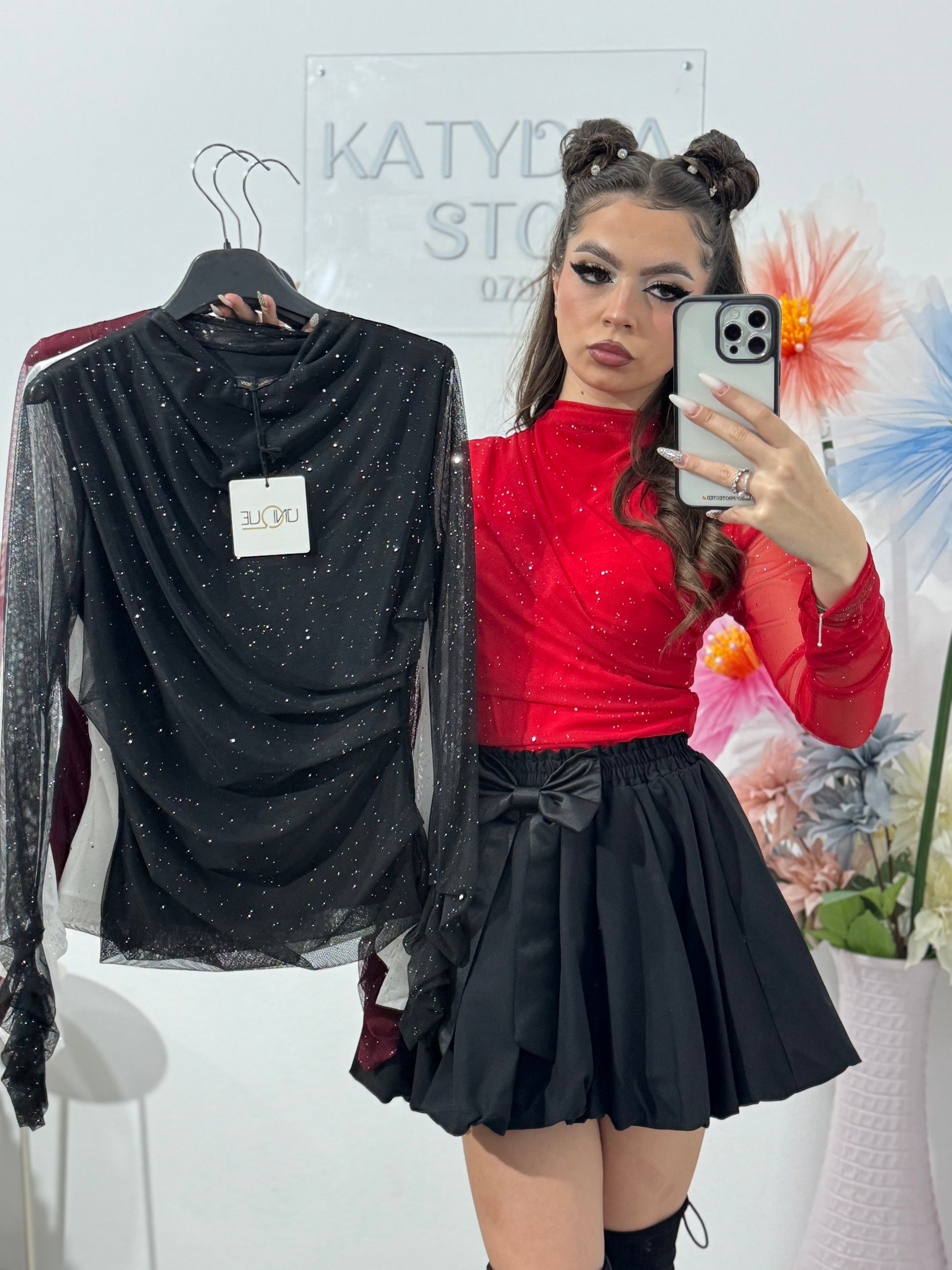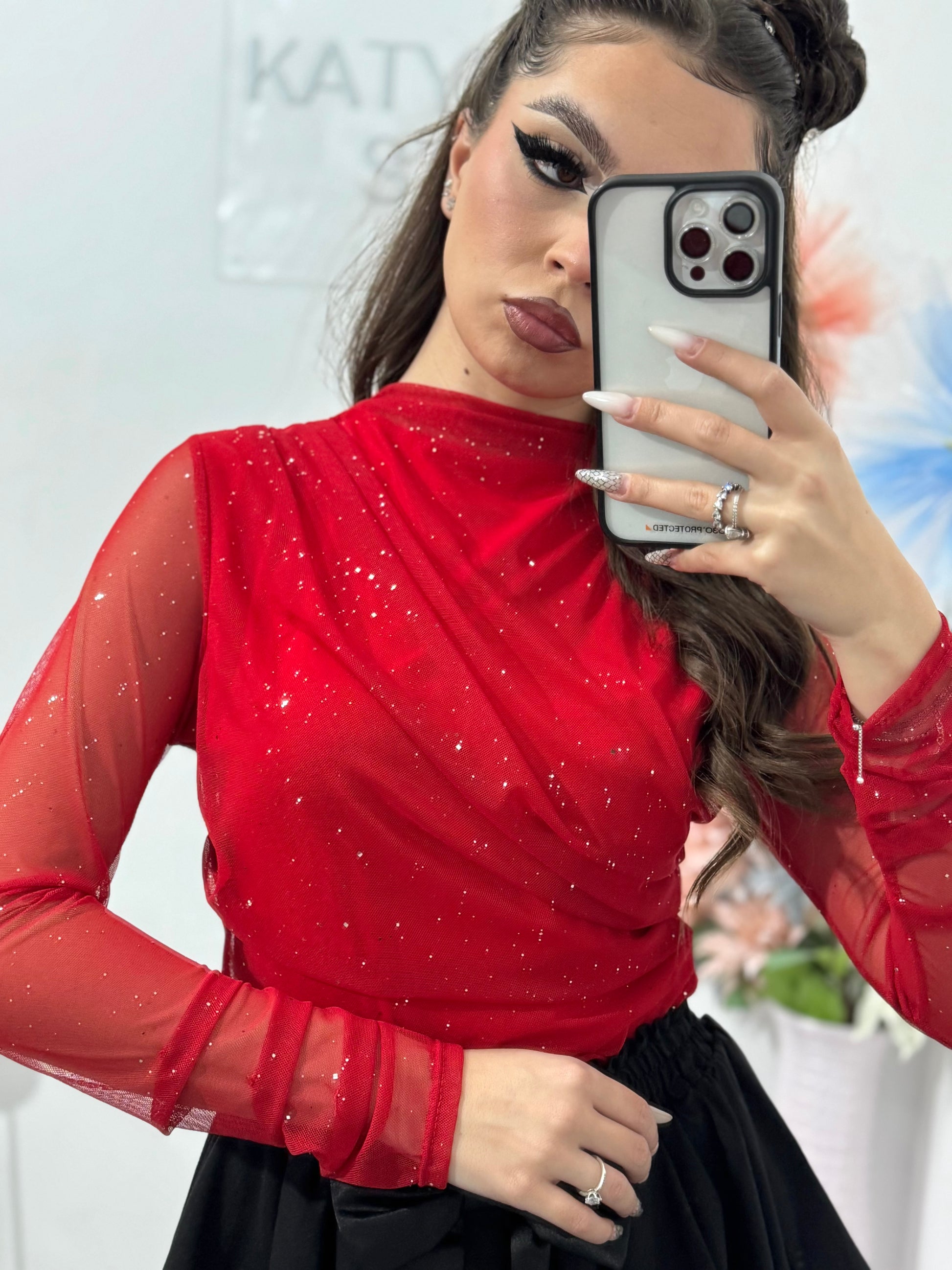 Această bluză sofisticată îmbină perfect eleganța cu un strop de strălucire. Confectionată dintr-un material fin, cu mâneci lungi din tulle transparent decorat cu accente subtile de sclipici, bluza oferă un aspect rafinat și feminin.Croiala mulată și decolteul în V avantajează silueta, iar textura ușor elastică asigură confort pe tot parcursul purtării.