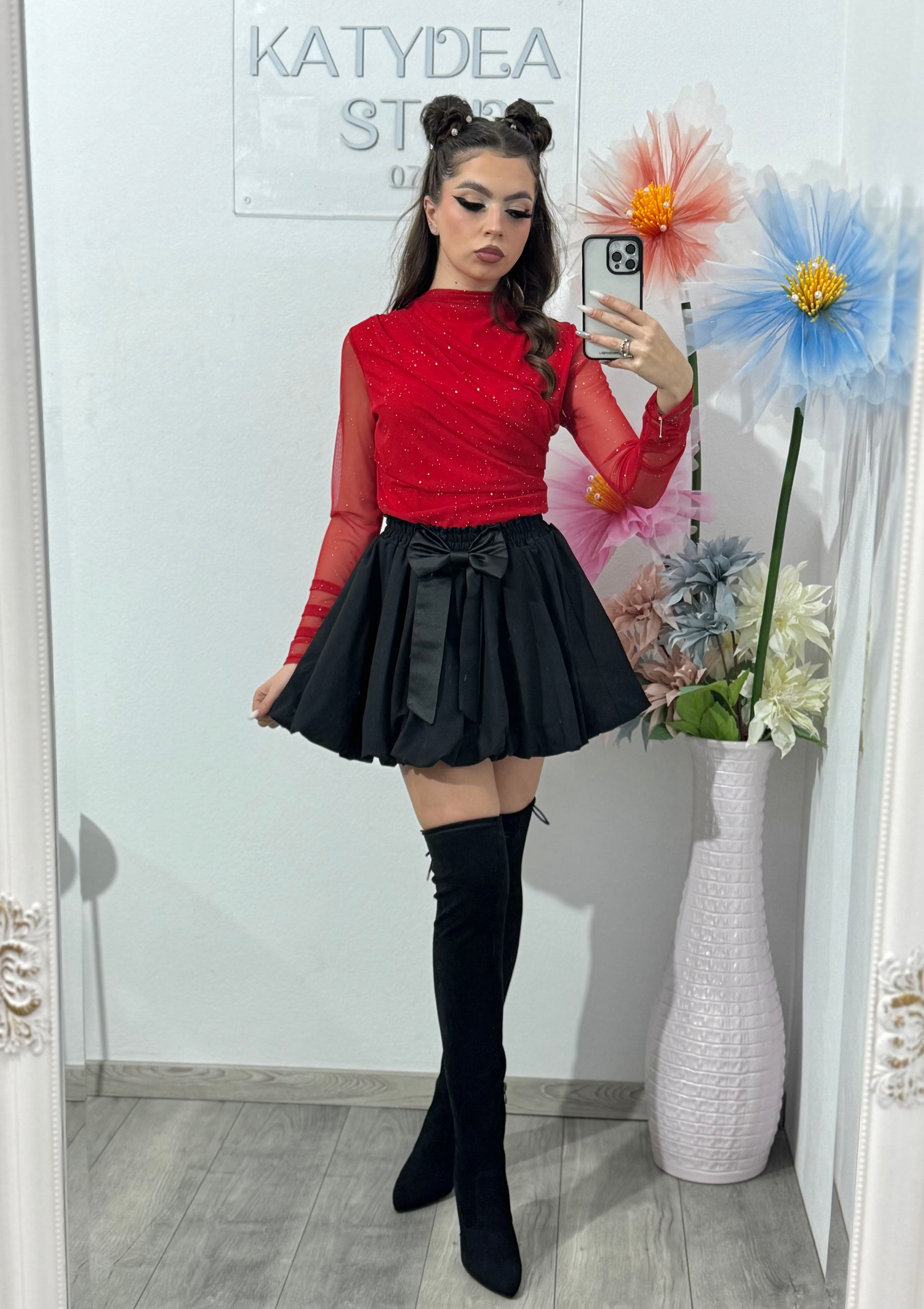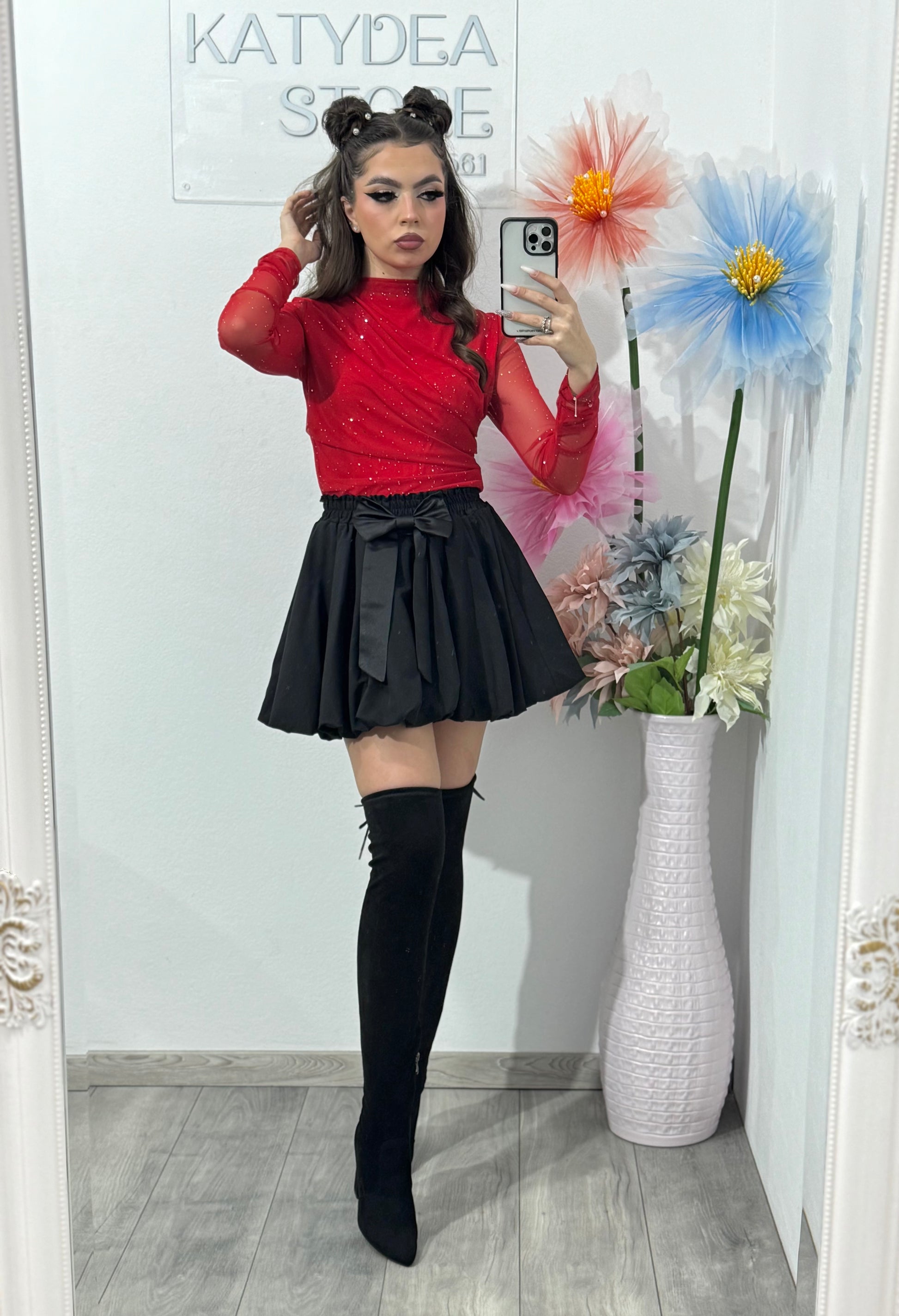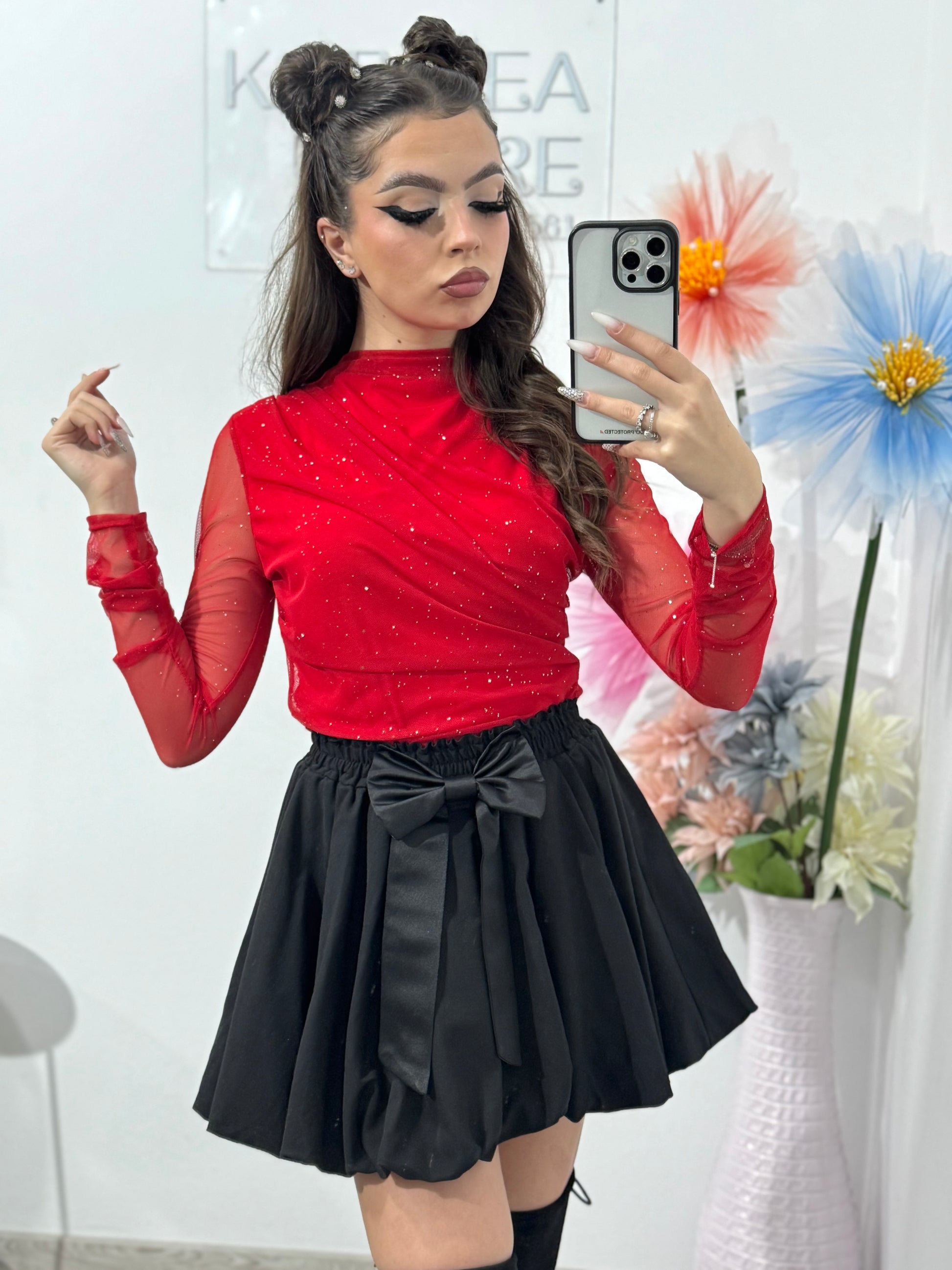 Această bluză sofisticată îmbină perfect eleganța cu un strop de strălucire. Confectionată dintr-un material fin, cu mâneci lungi din tulle transparent decorat cu accente subtile de sclipici, bluza oferă un aspect rafinat și feminin.Croiala mulată și decolteul în V avantajează silueta, iar textura ușor elastică asigură confort pe tot parcursul purtării.