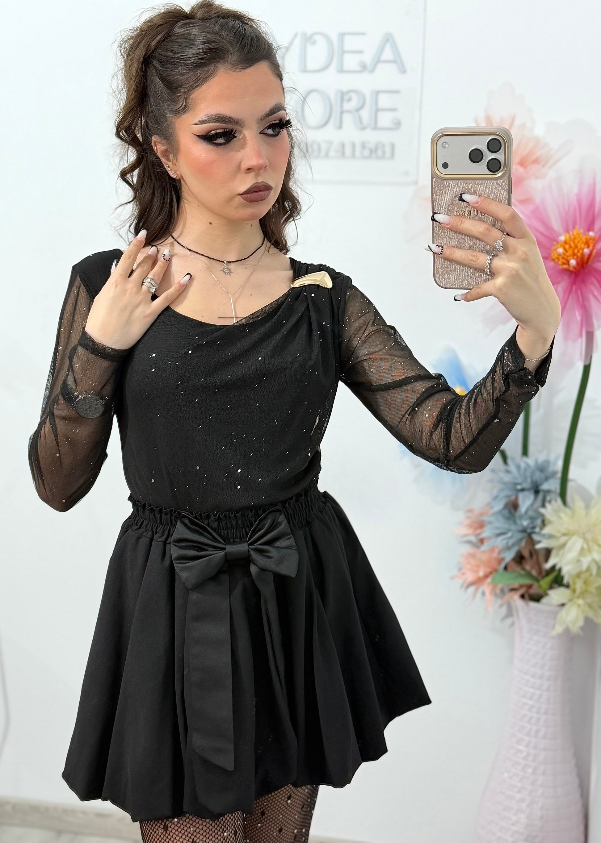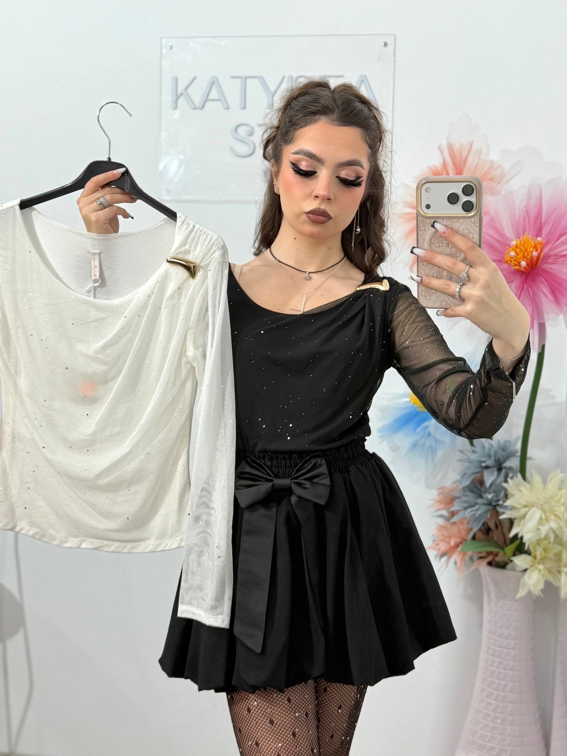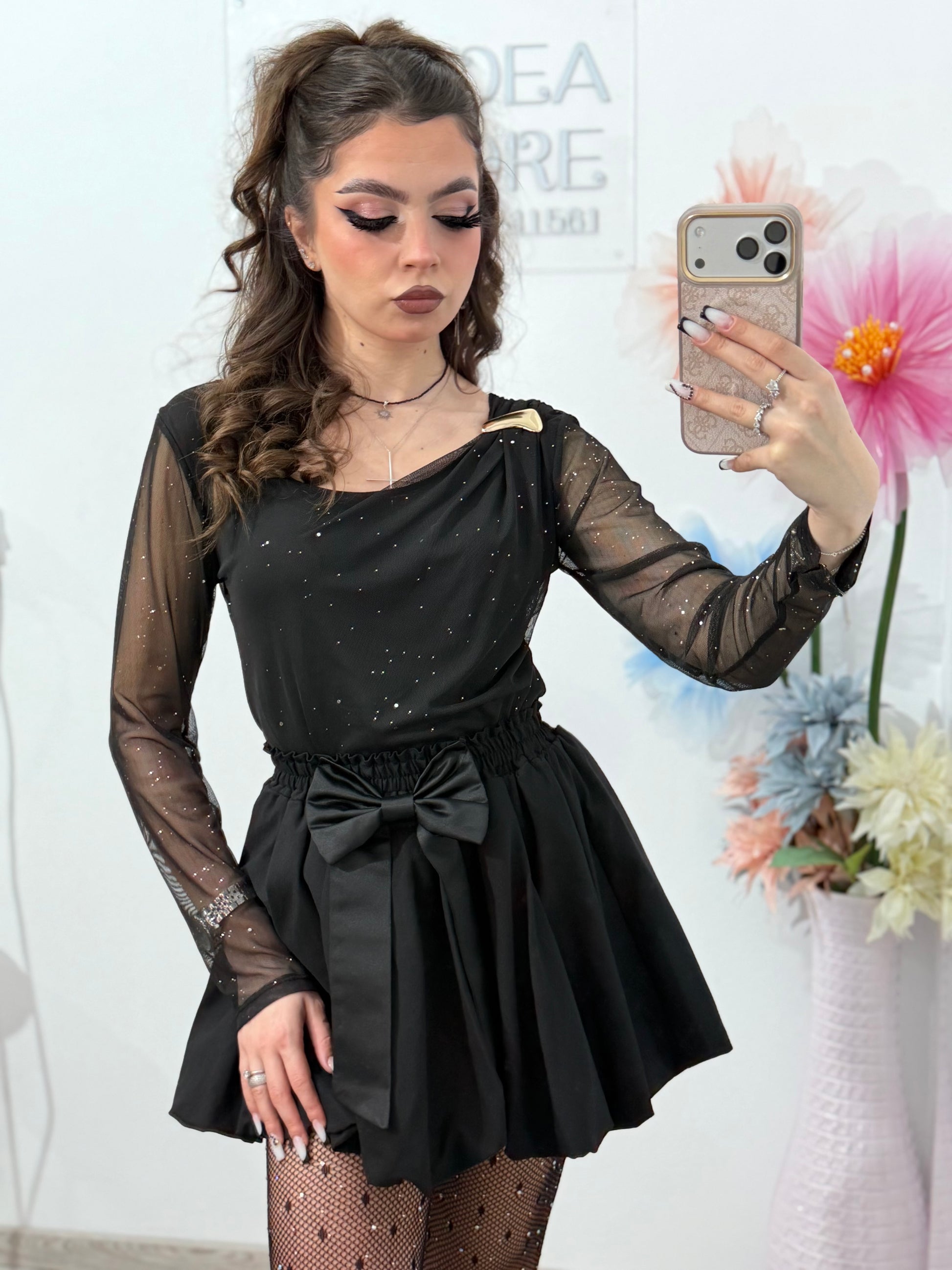 Această bluză sofisticată îmbină perfect eleganța cu un strop de strălucire. Confectionată dintr-un material fin, cu mâneci lungi din tulle transparent decorat cu accente subtile de sclipici, bluza oferă un aspect rafinat și feminin.Croiala mulată și decolteul în U avantajează silueta, iar textura ușor elastică asigură confort pe tot parcursul purtării.