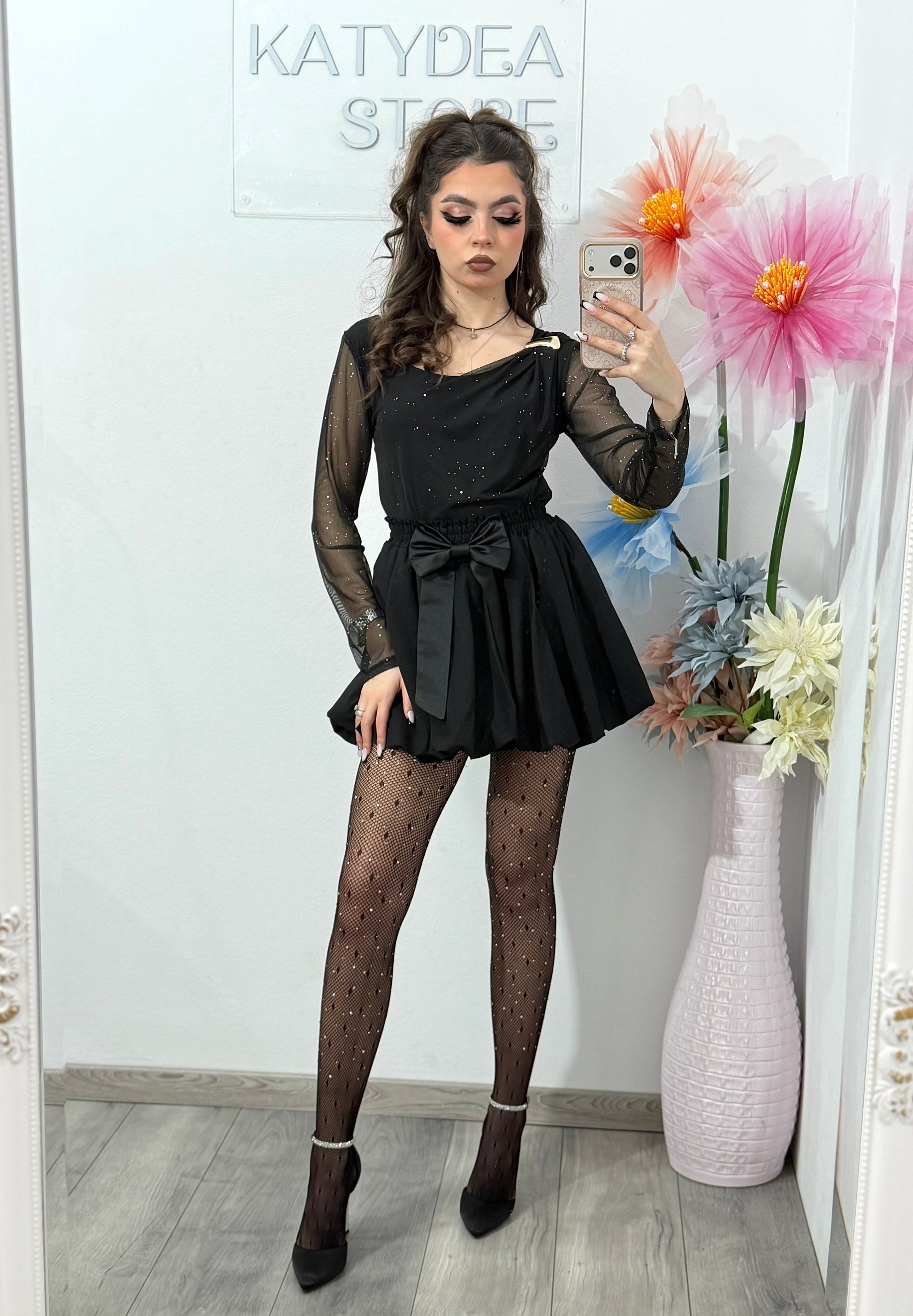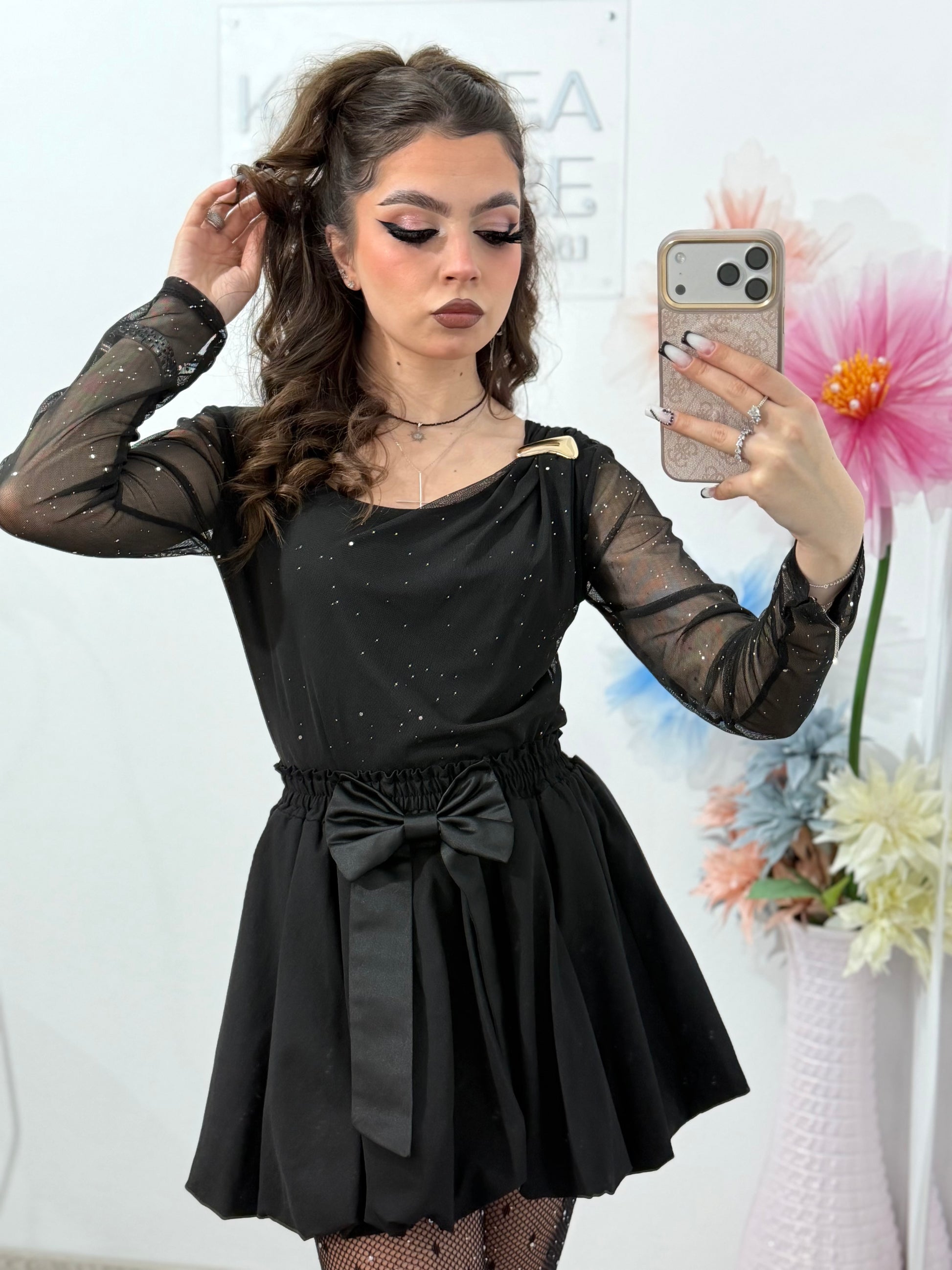 - Mâneci: lungi, din tulle transparent