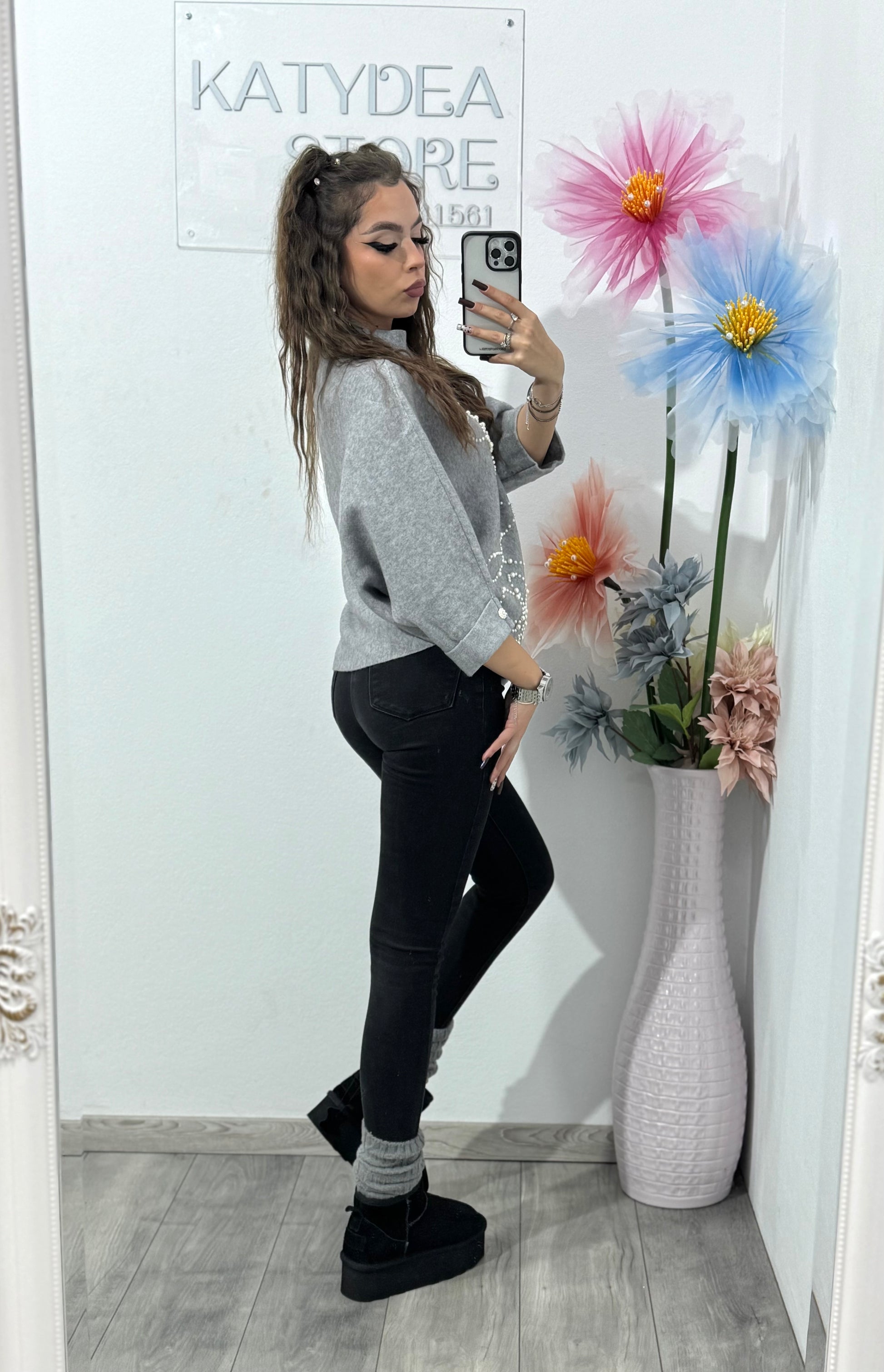 Bluză din tricot accesorizata cu un desen realizat din perlute si cristale care îi oferă un aer elegant și deosebit.
