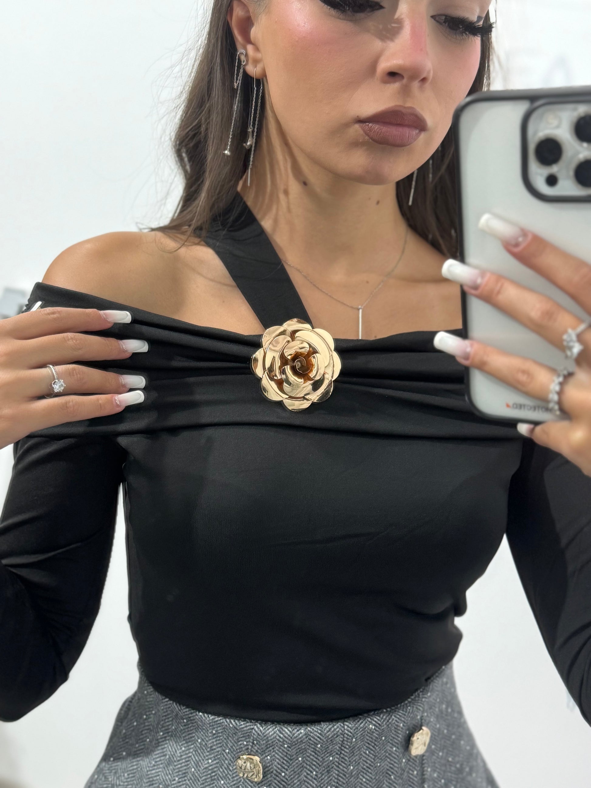 Decolteu tip „bardot” (pe umeri), accesorizat cu bretea decorativă și floare 3D aplicată, care adaugă un accent sofisticat.
