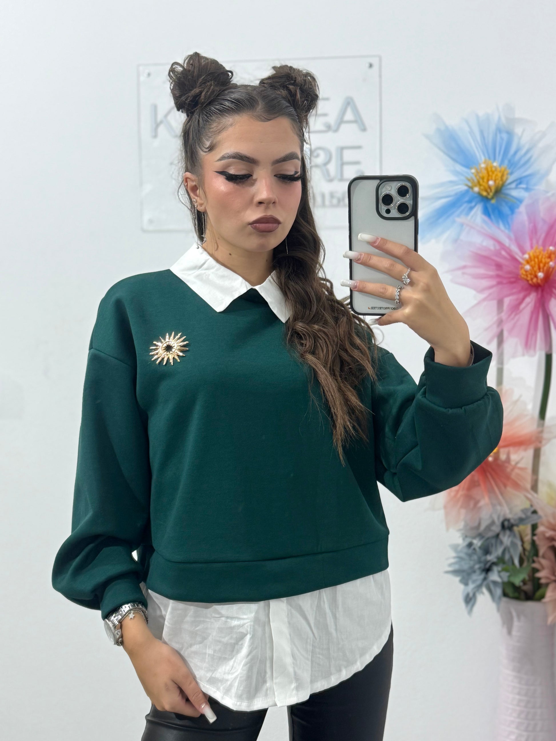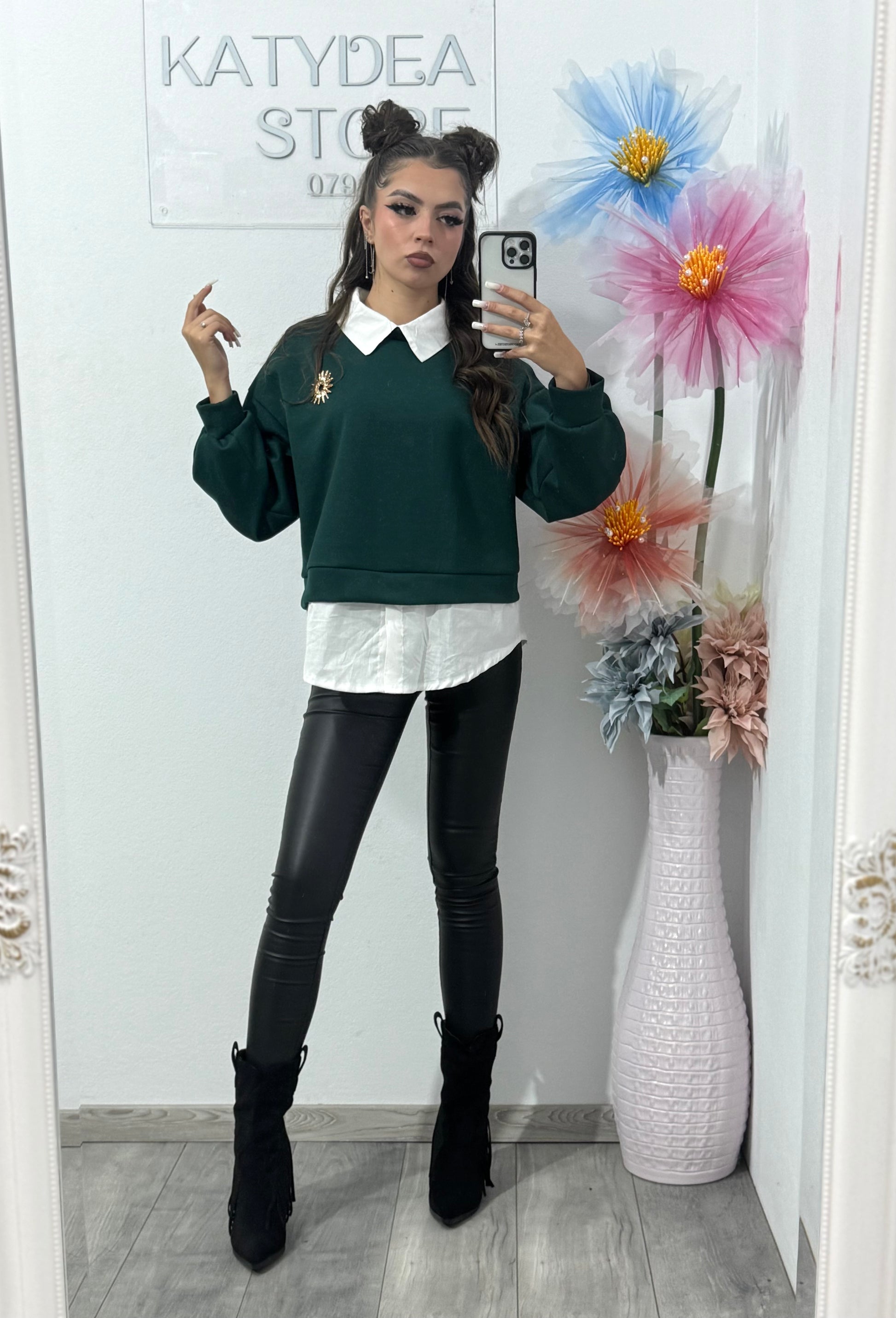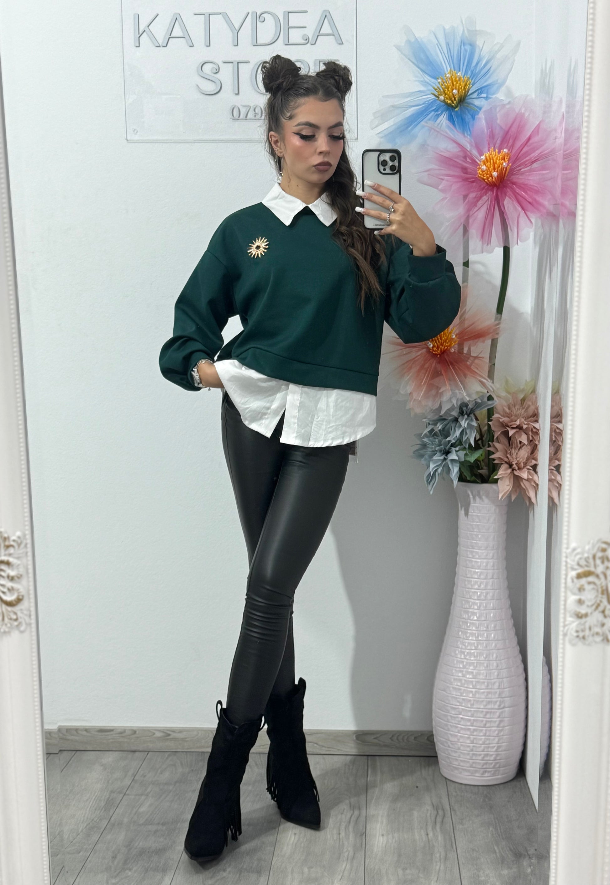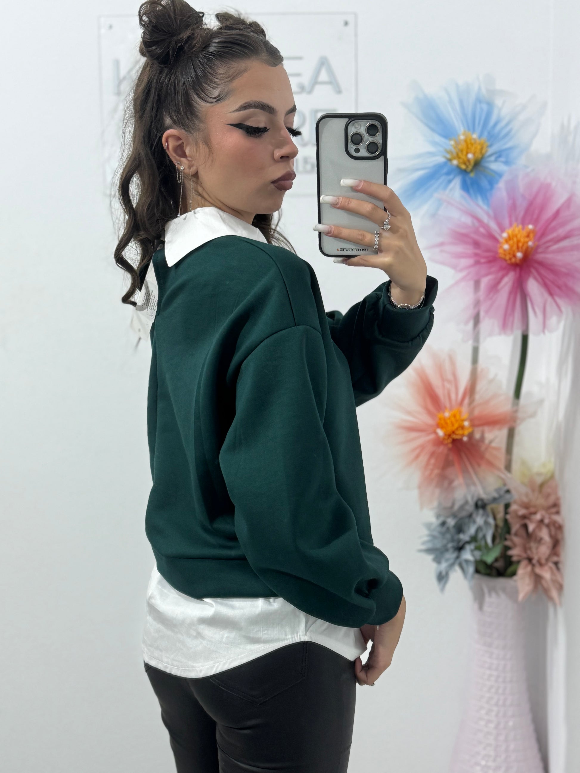 Bluza are un design modern și versatil, perfectă pentru ținute de zi cu zi sau pentru birou. Este confecționată dintr-un material moale și plăcut la purtare, de culoare verde închis, cu inserție tip cămașă albă la guler și la tiv, oferind un efect de suprapunere foarte chic.