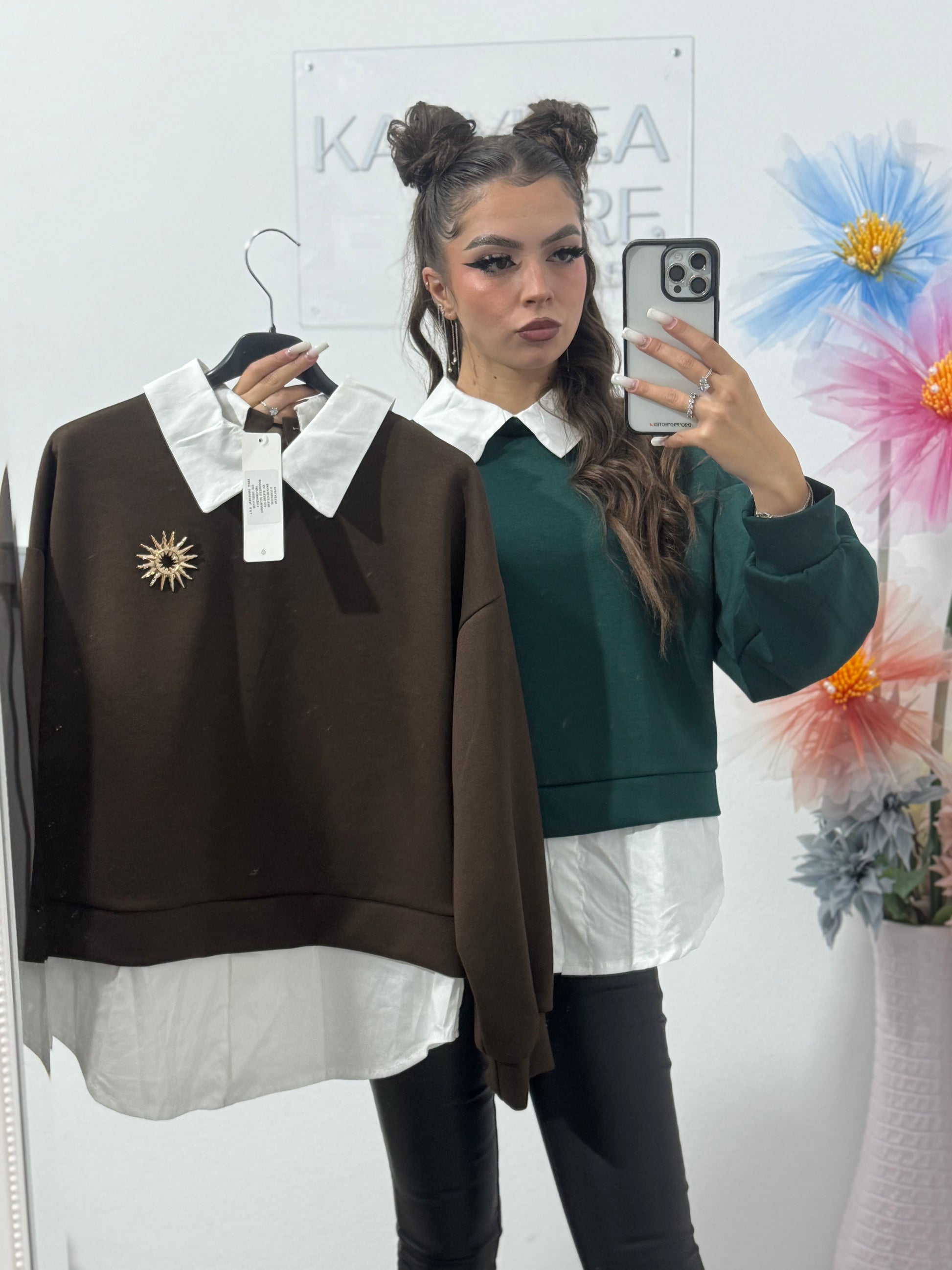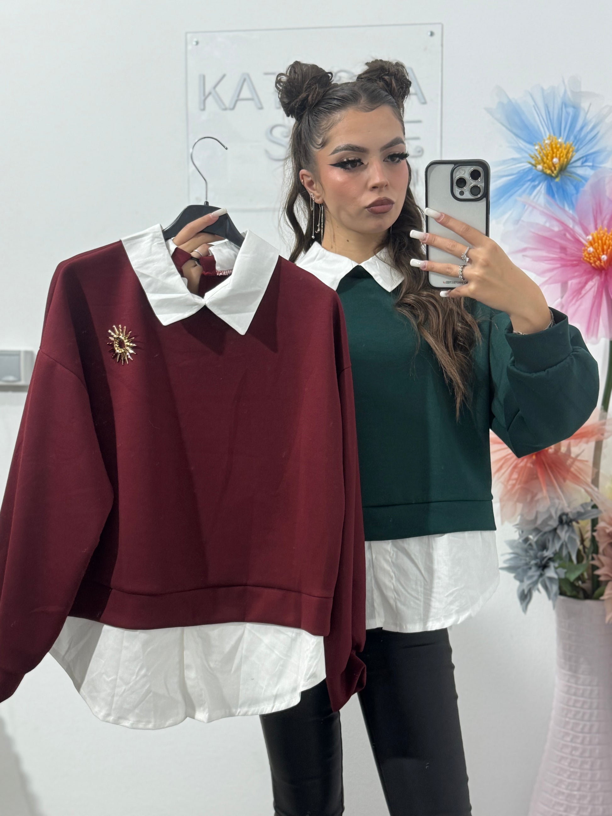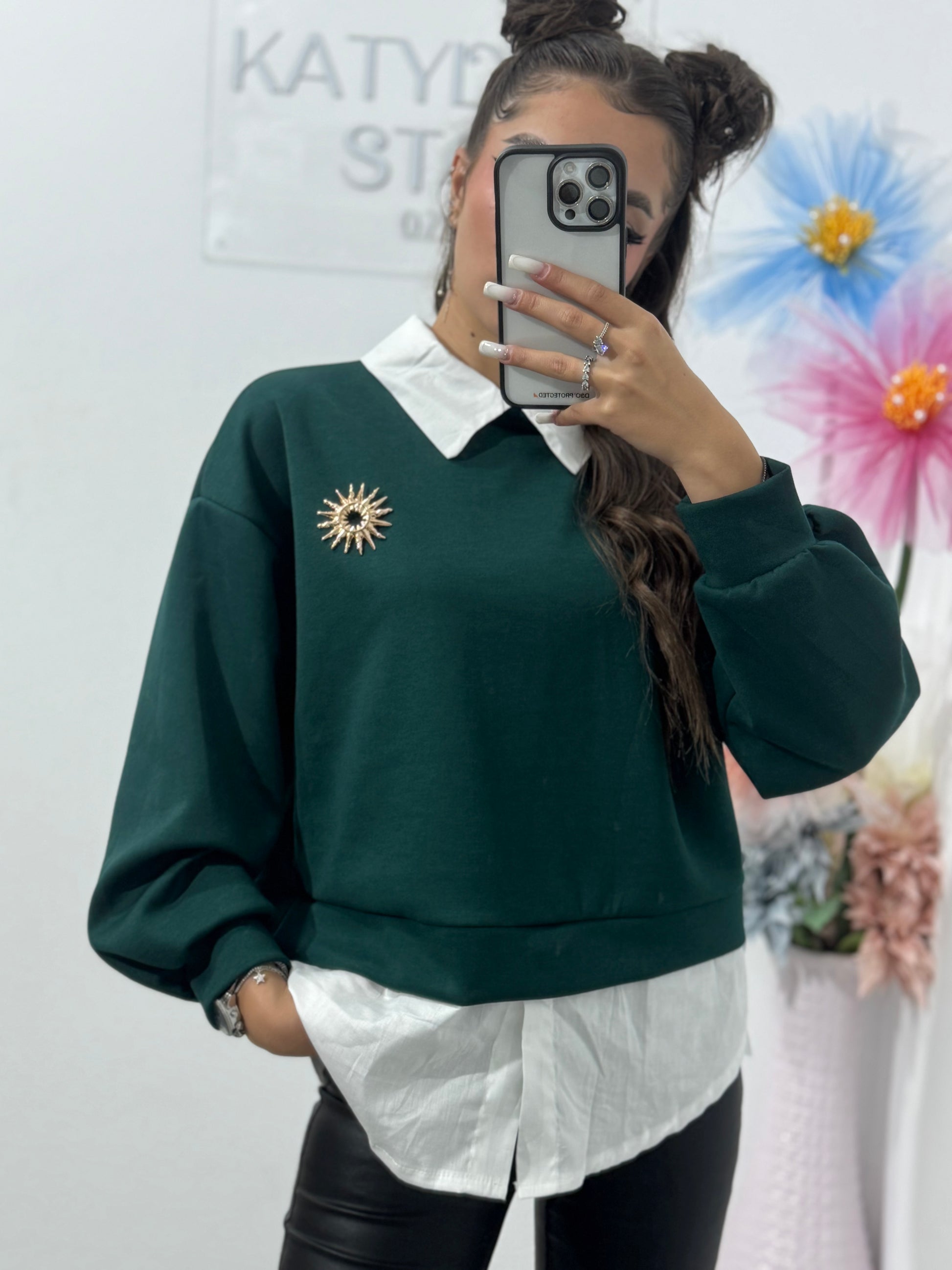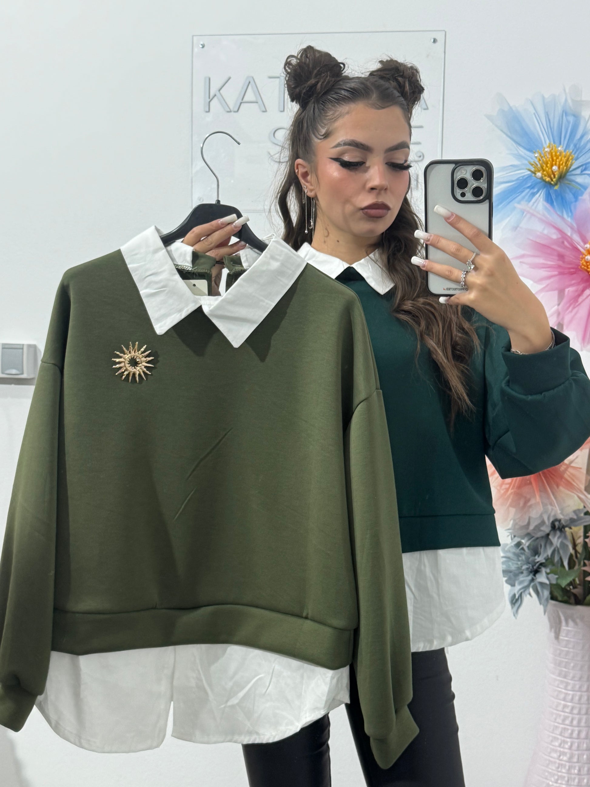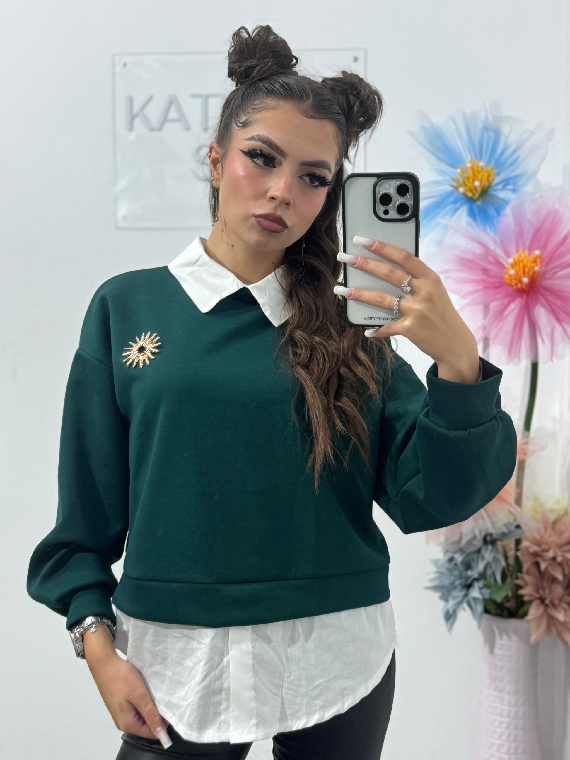 Bluza are un design modern și versatil, perfectă pentru ținute de zi cu zi sau pentru birou. Este confecționată dintr-un material moale și plăcut la purtare, de culoare verde închis, cu inserție tip cămașă albă la guler și la tiv, oferind un efect de suprapunere foarte chic.