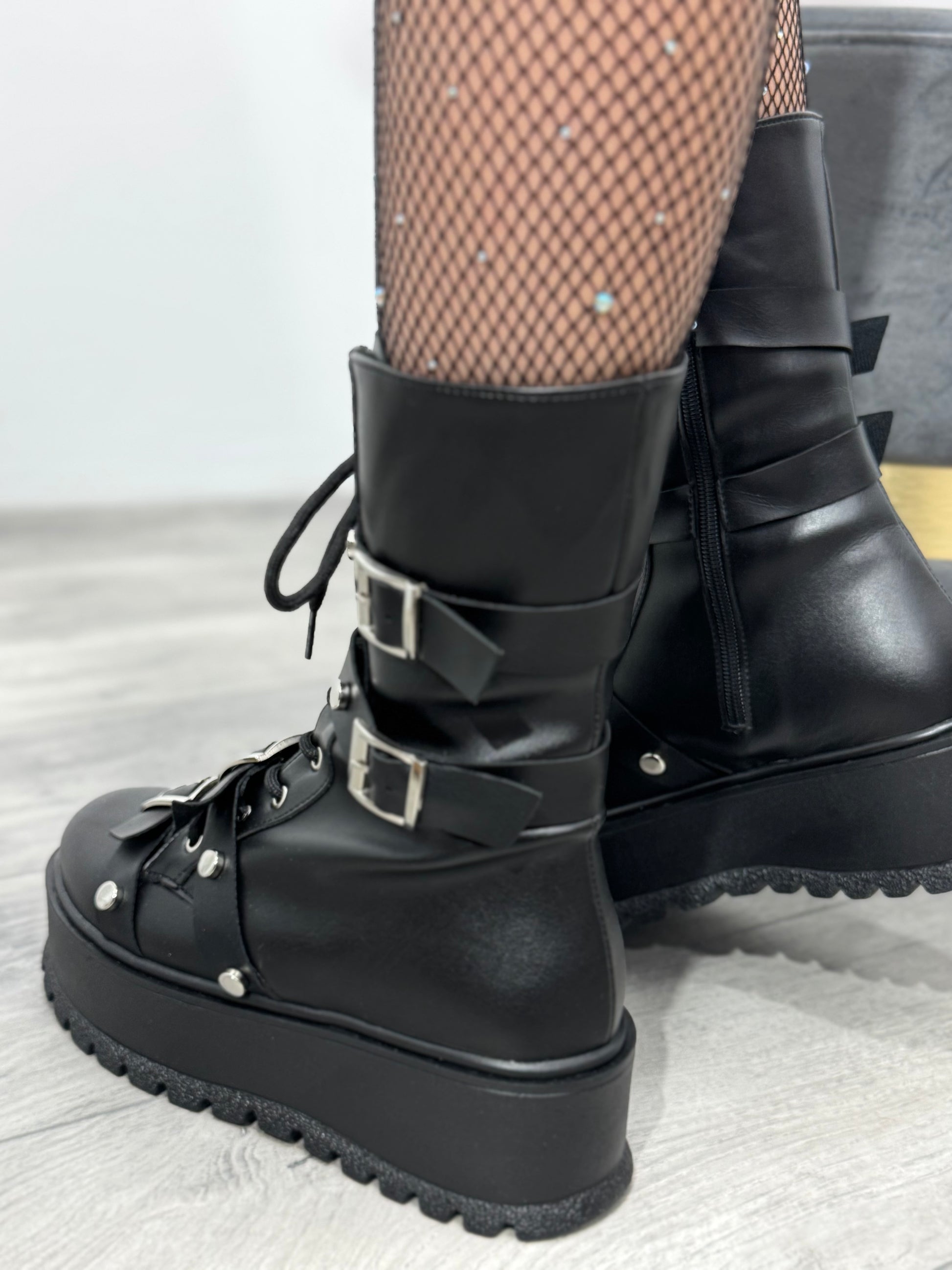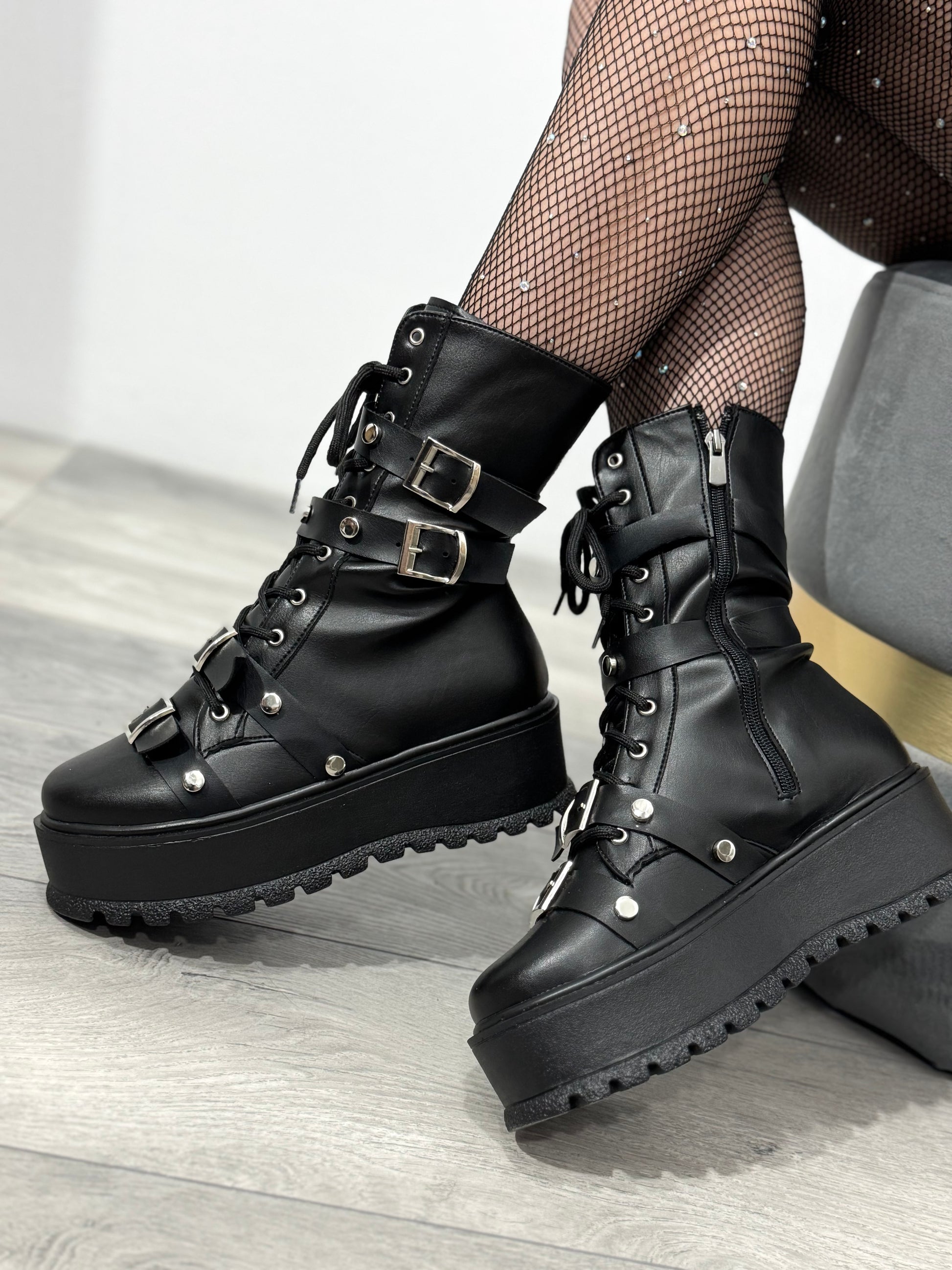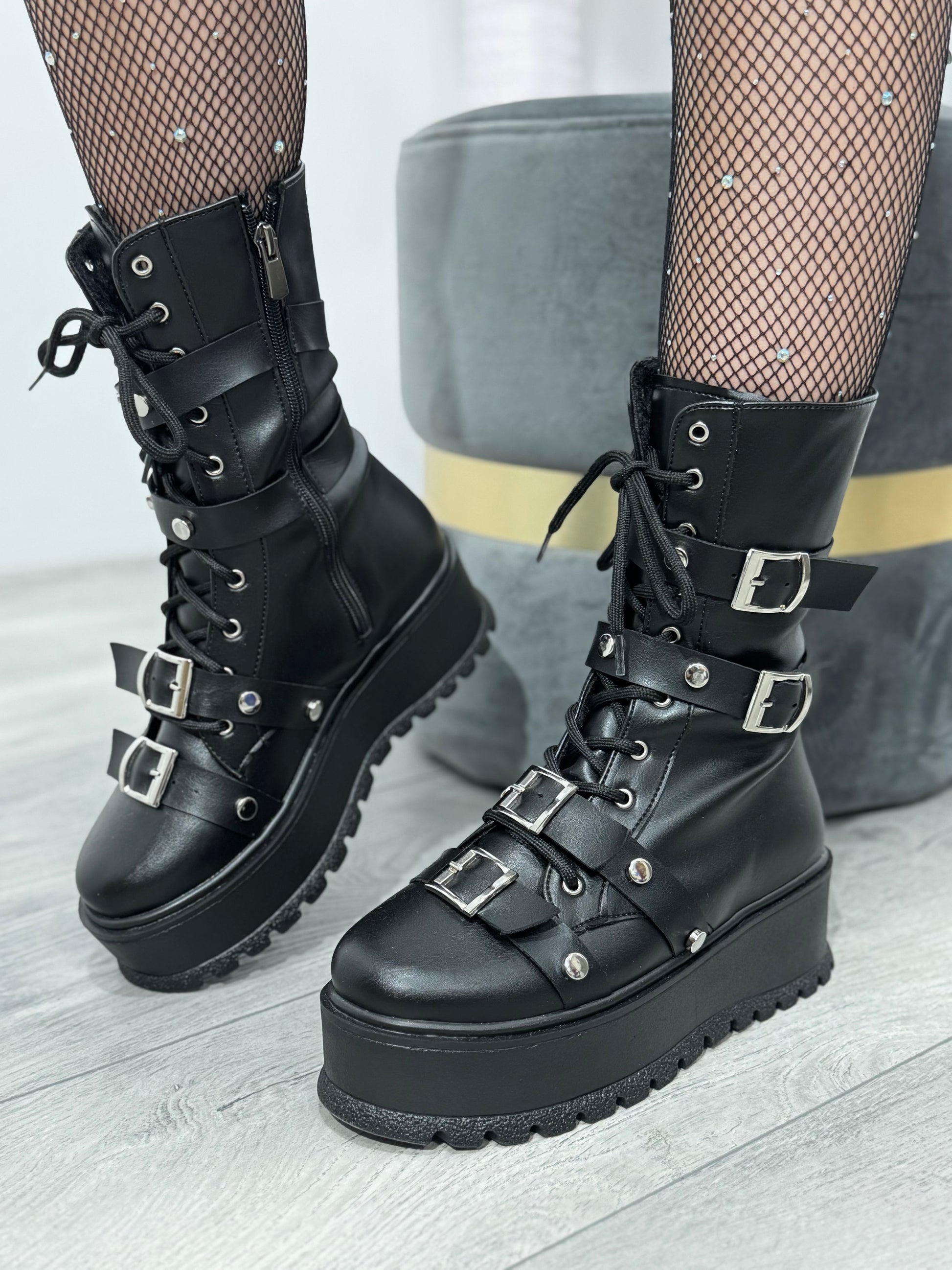 Modelul este accentuat de șireturi frontale, capse metalice și curele decorative cu catarame argintii, oferind un aspect edgy și foarte actual. În lateral dispun de fermoar pentru încălțare rapidă și confort sporit.