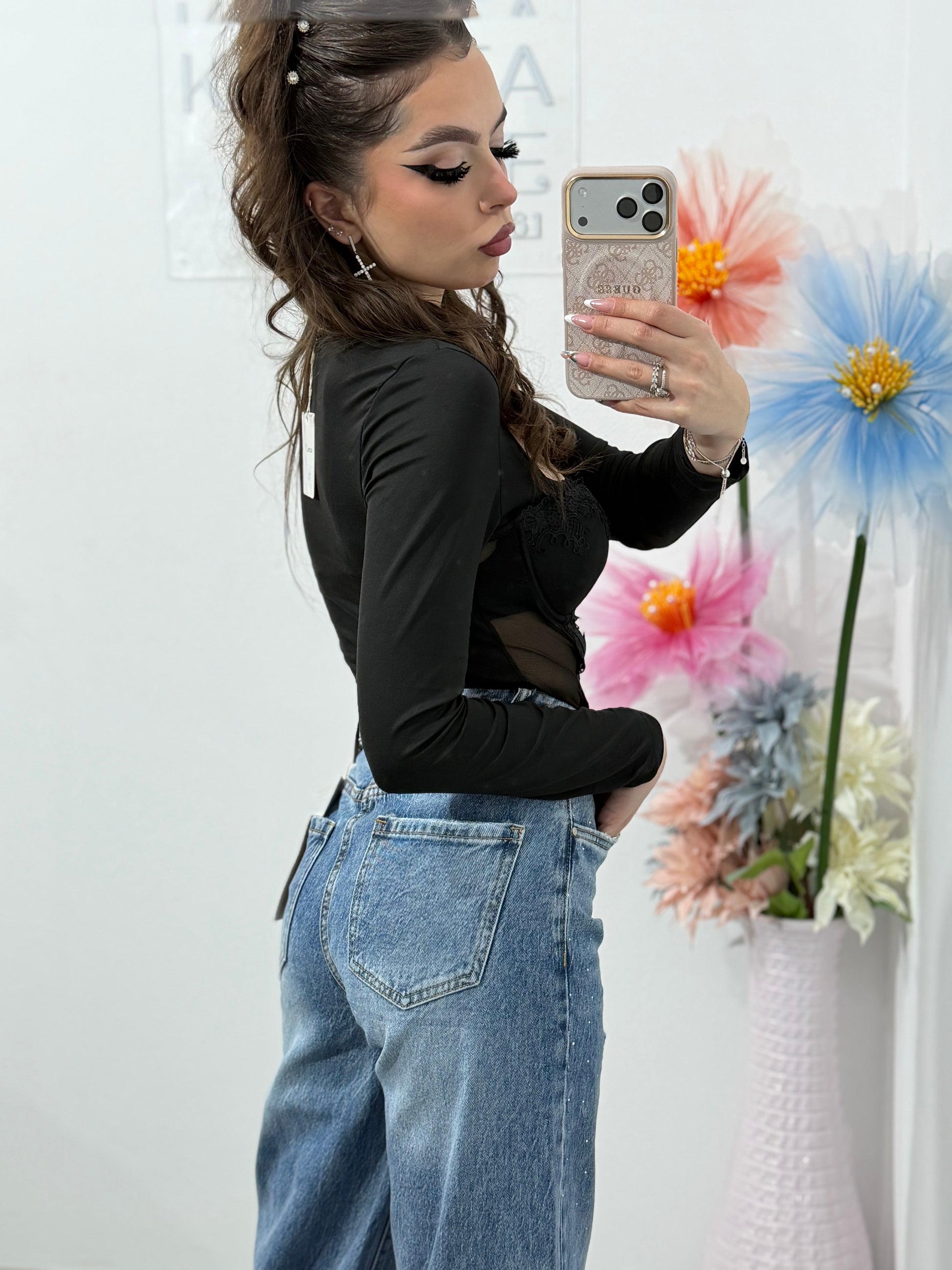 Body sofisticat, realizat din material elastic de calitate, cu mâneci lungi. Partea din față este prevăzută cu cupe structurate tip corset, evidențiate de inserții din dantelă delicată și plasă fină, pentru un efect feminin și senzual. Se mulează frumos pe corp, oferind susținere și un look elegant, perfect pentru evenimente speciale, petreceri sau ținute de seară.