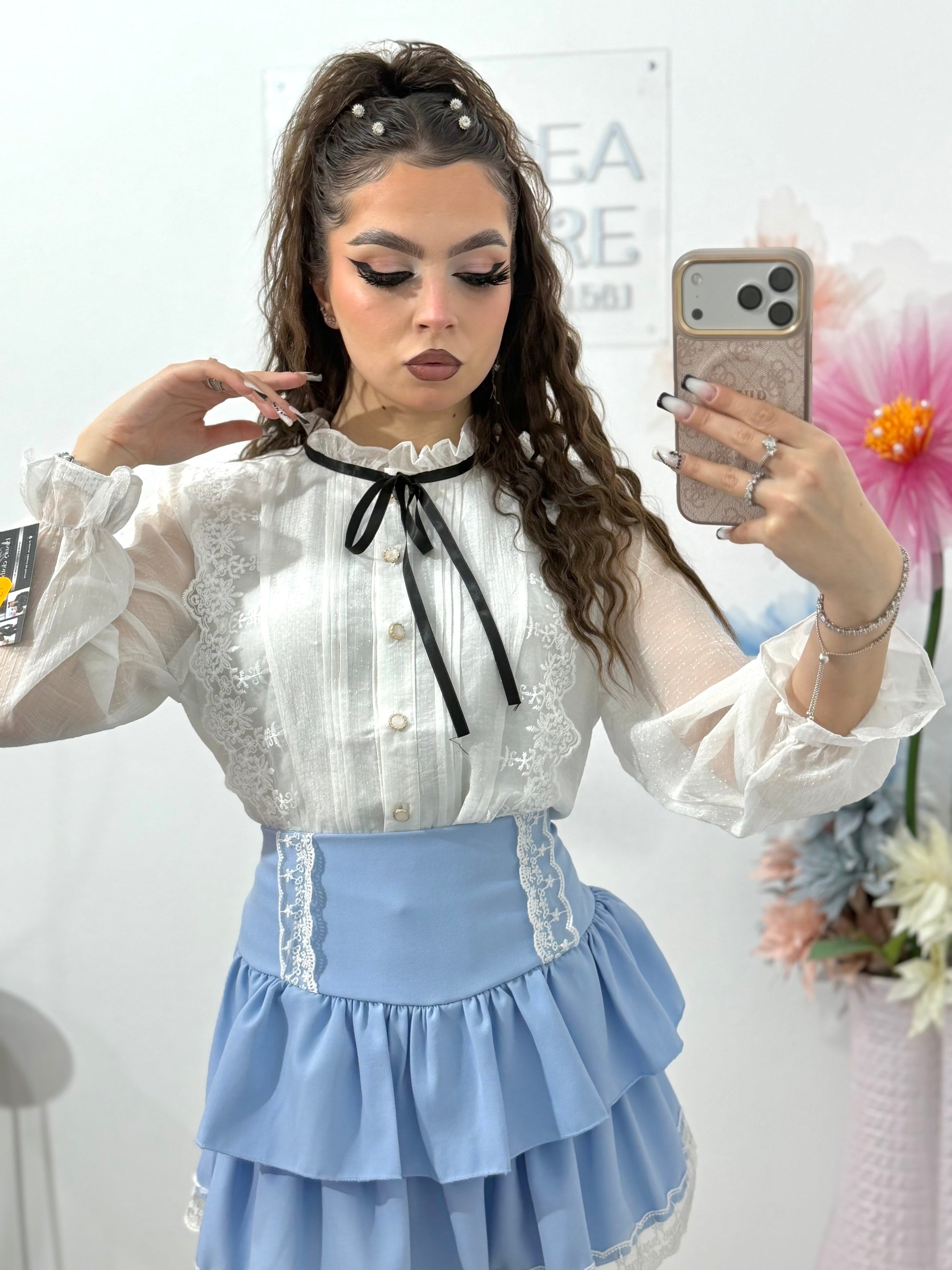 Cămașă elegantă din voal fin, într-o nuanță delicată de alb-ivory, perfectă pentru ținute feminine și rafinate. Modelul impresionează prin detaliile romantice: volane discrete pe partea frontală, inserții din dantelă fină și fundițe negre decorative care creează un contrast sofisticat.