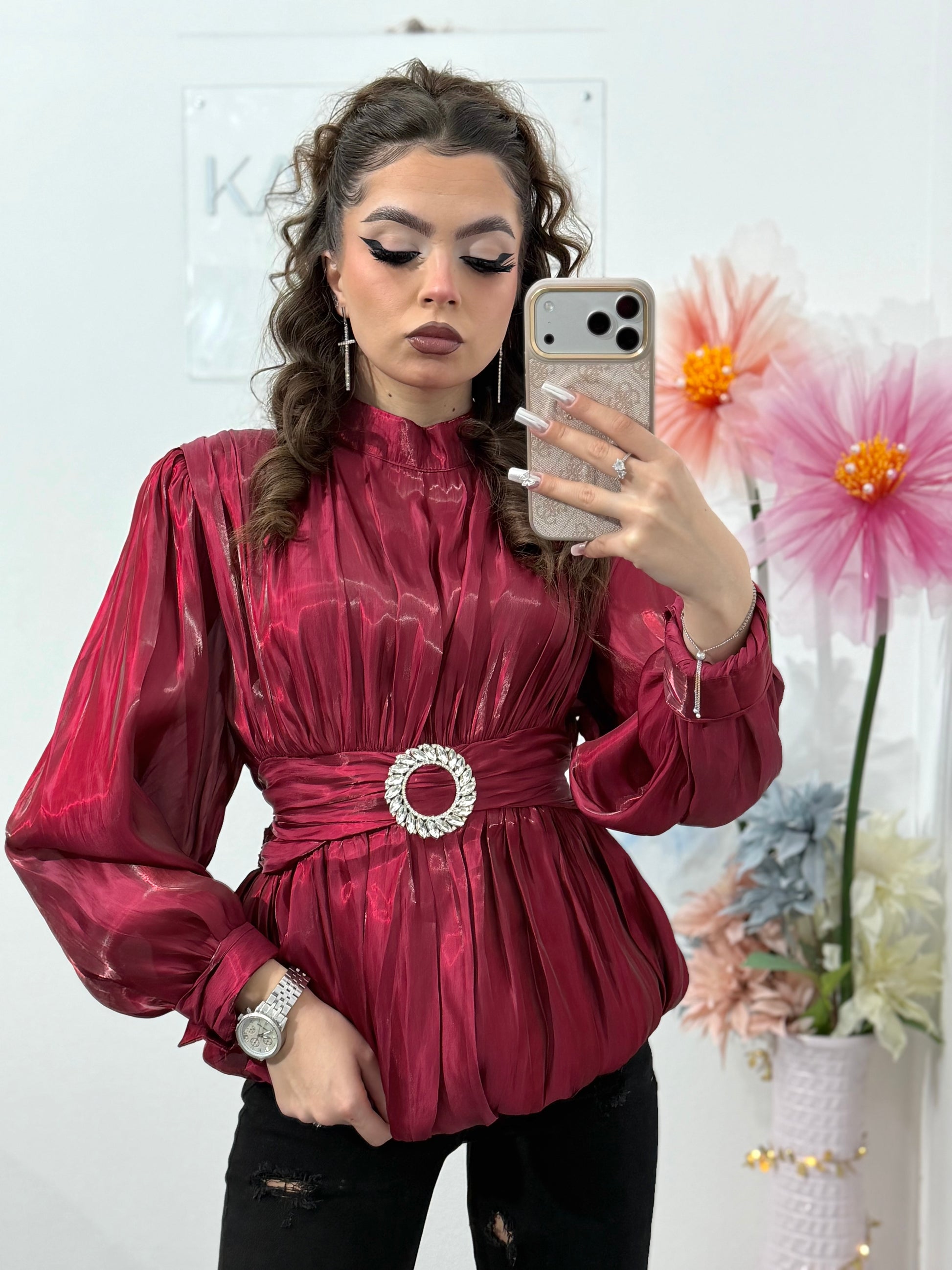 Cămașă elegantă din satin pentru femei, cu mâneci lungi și talie marcată BURGUNY
