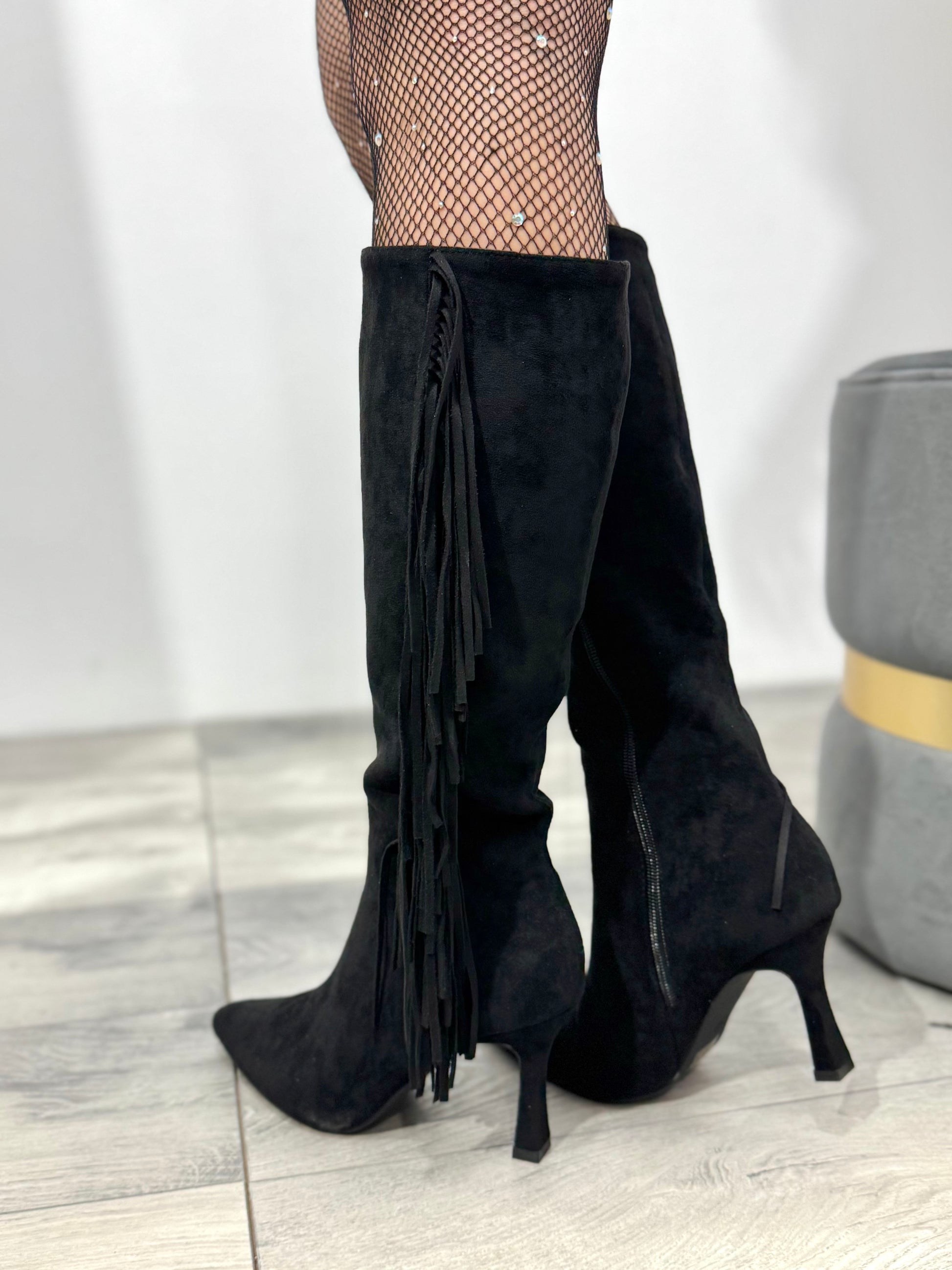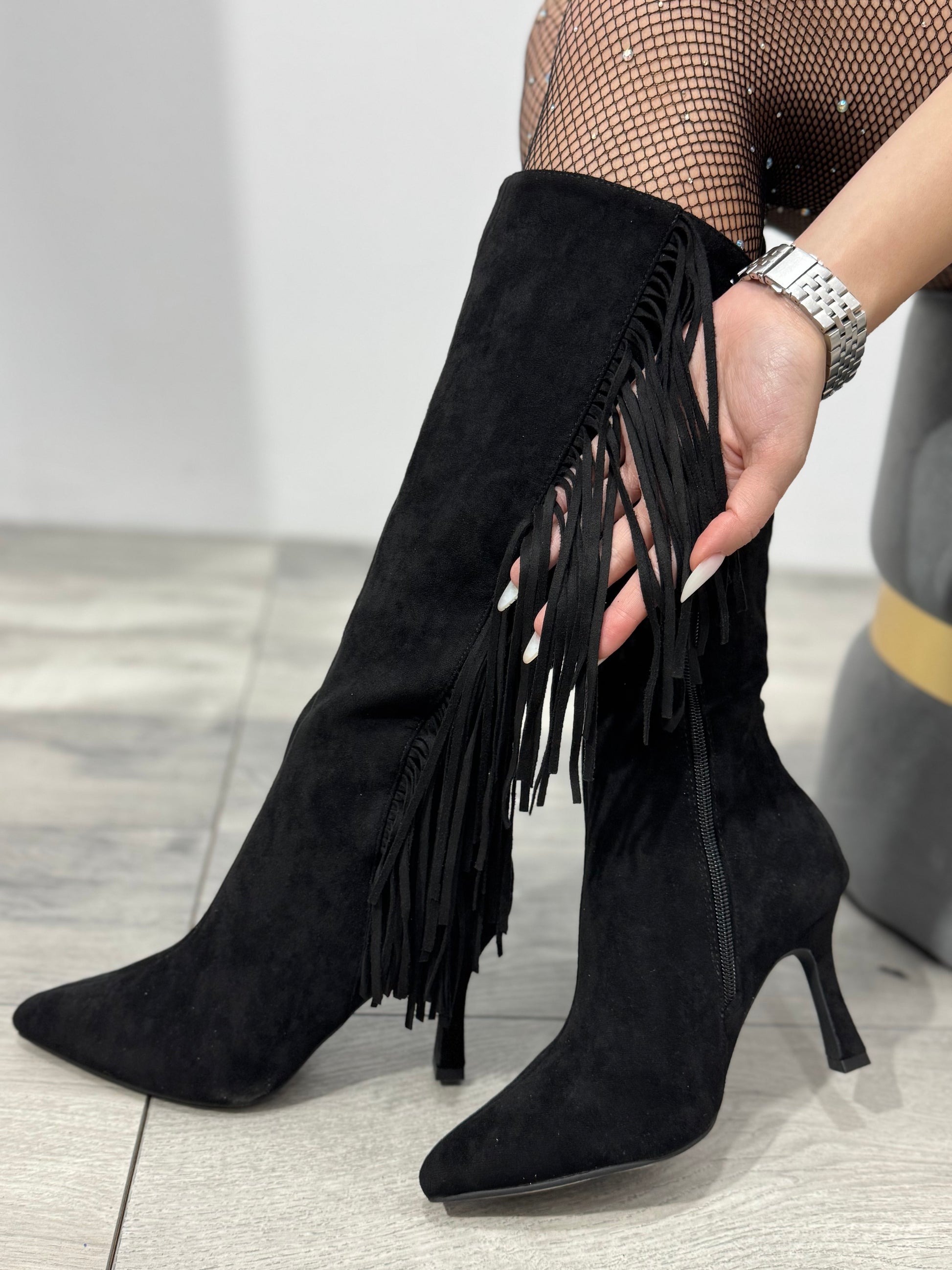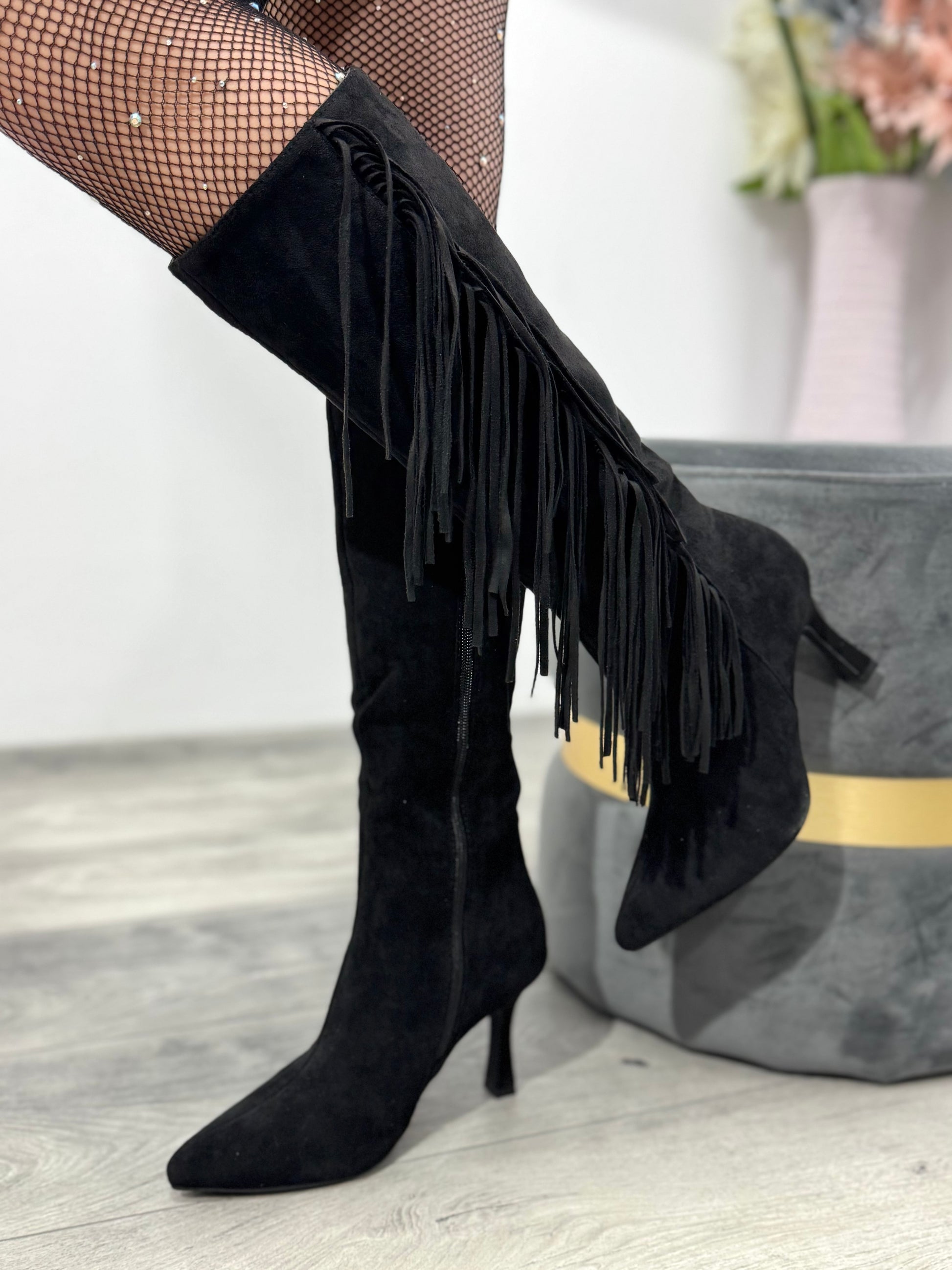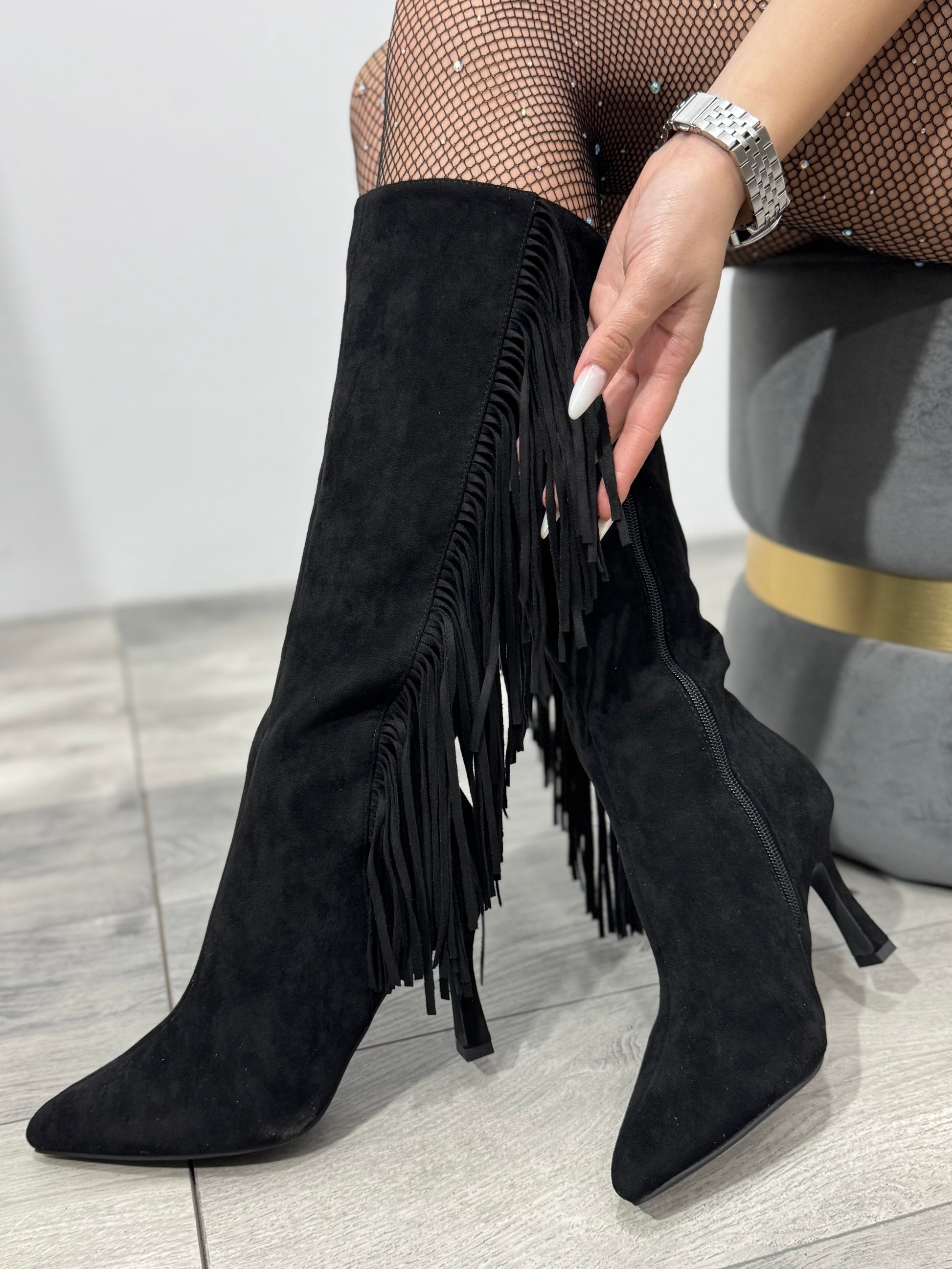 ✨ Cizme damă din piele întoarsă – cu franjuri și toc subțire ✨