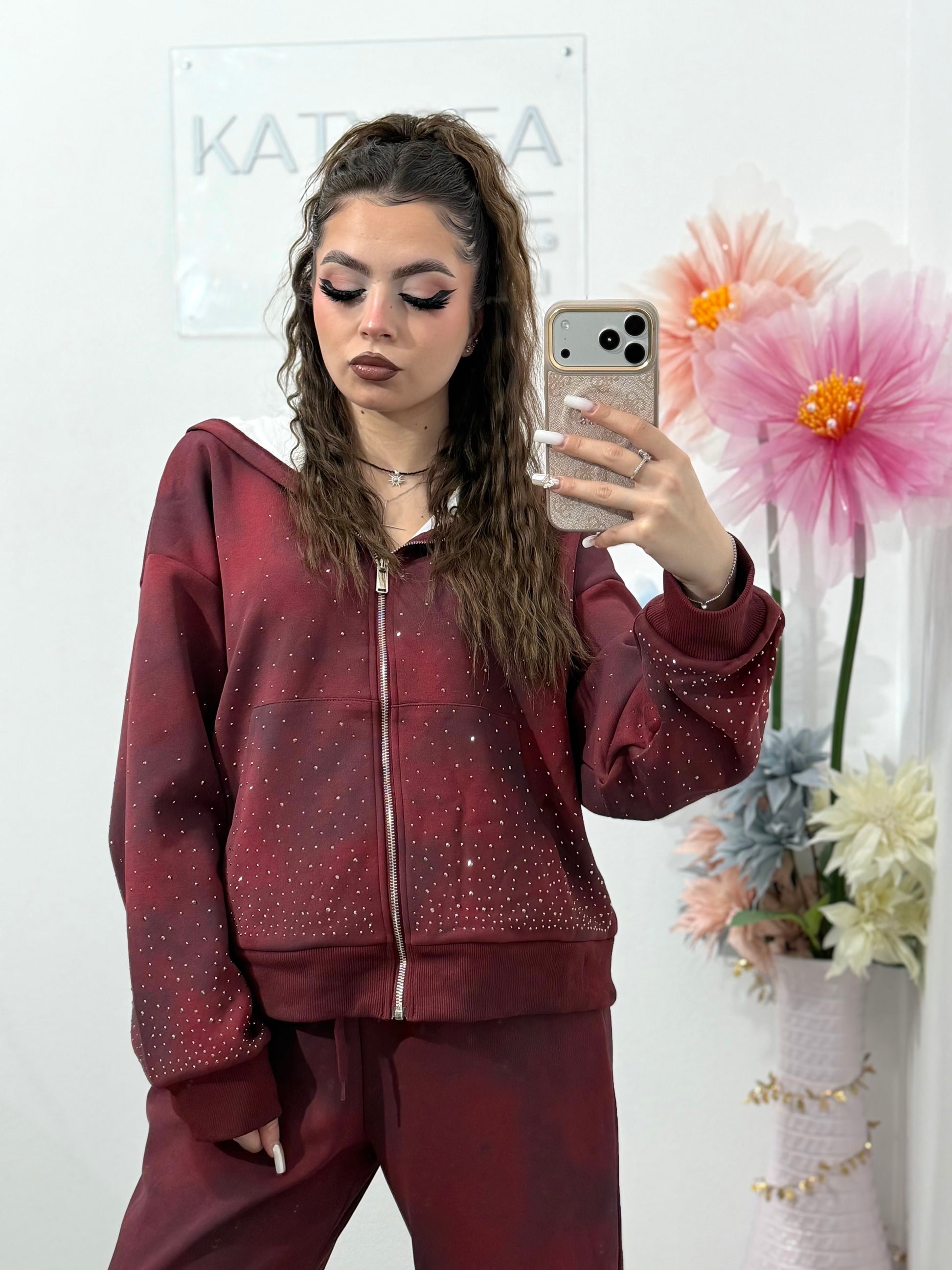 Compleu modern și rafinat, realizat într-o nuanță intensă de burgundy, evidențiat de inserții negre contrastante, pentru un look sofisticat și actual. Setul este compus din pantaloni Wide Leg și bluză ușor oversize, oferind un echilibru perfect între confort și stil.