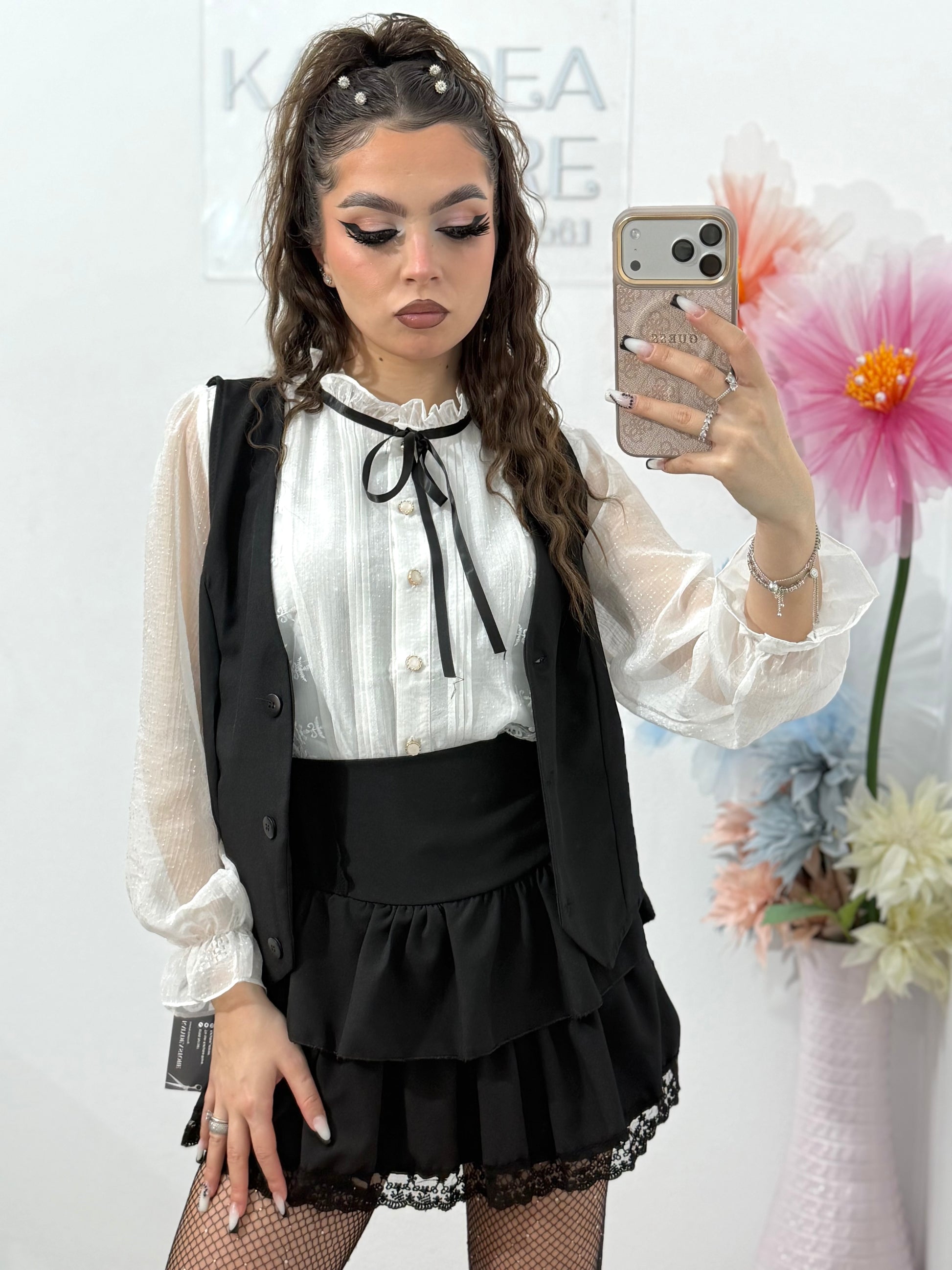 Compleu damă elegant cu vestă și fustă cu volane – ținută feminină casual