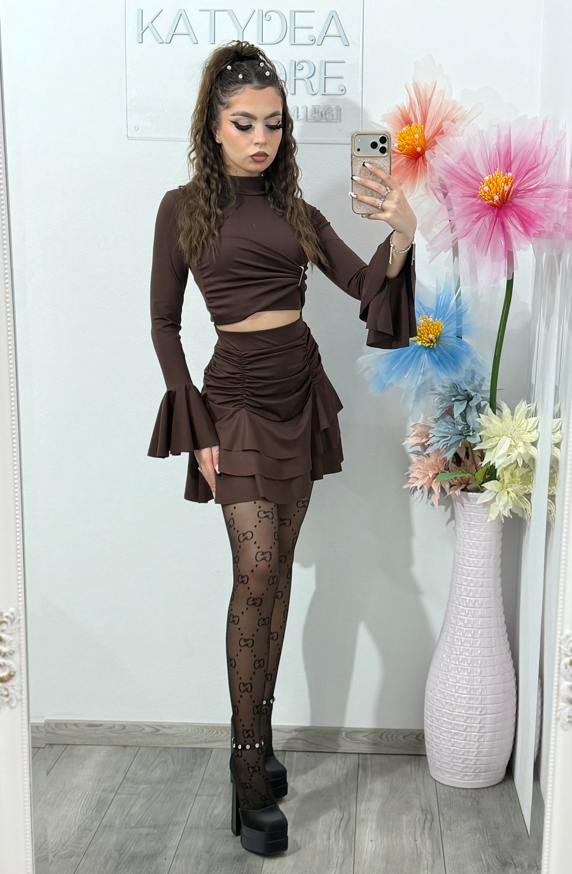 • Fustă mini cu talie înaltă – model cambrat, cu fronseuri laterale ce avantajează silueta și volănașe suprapuse pentru un efect chic și feminin.