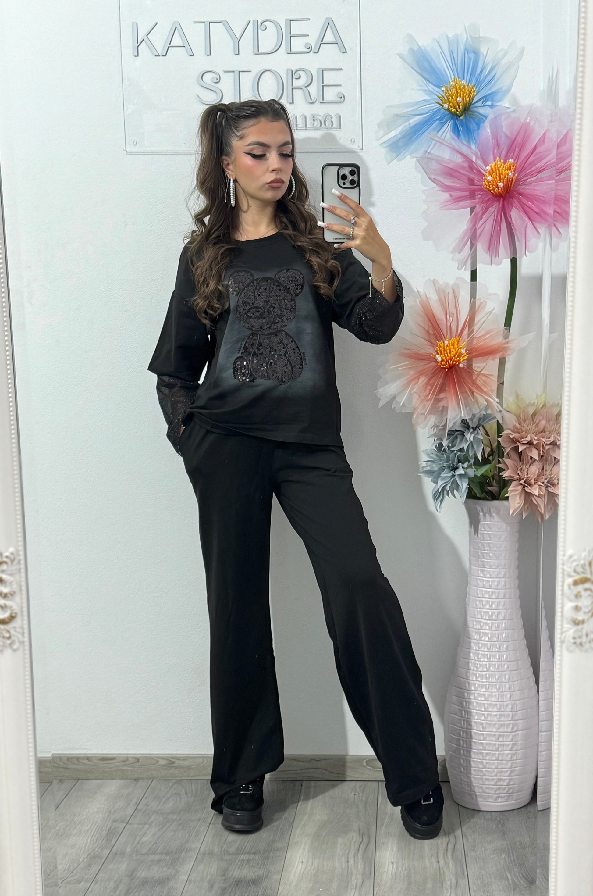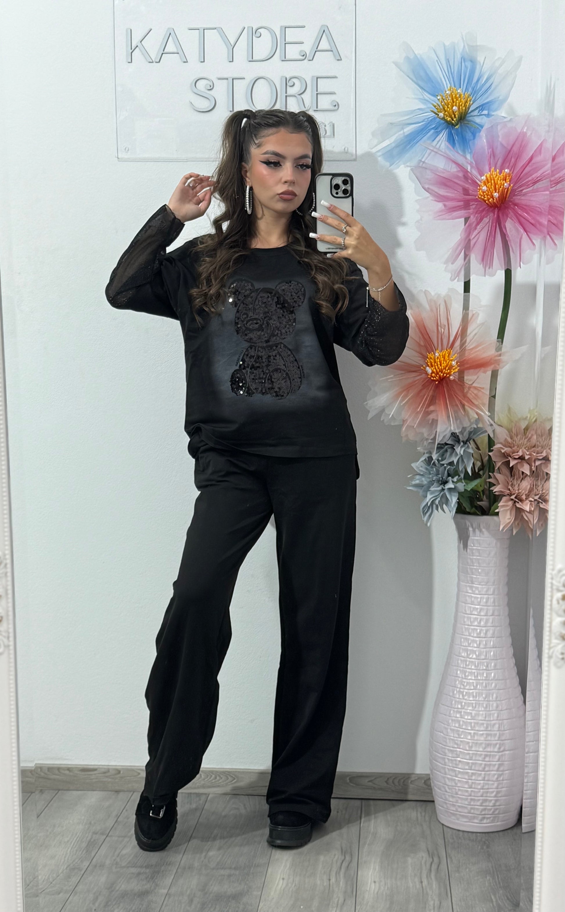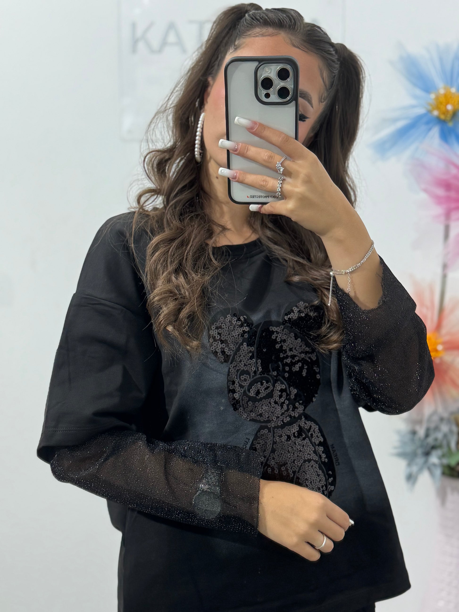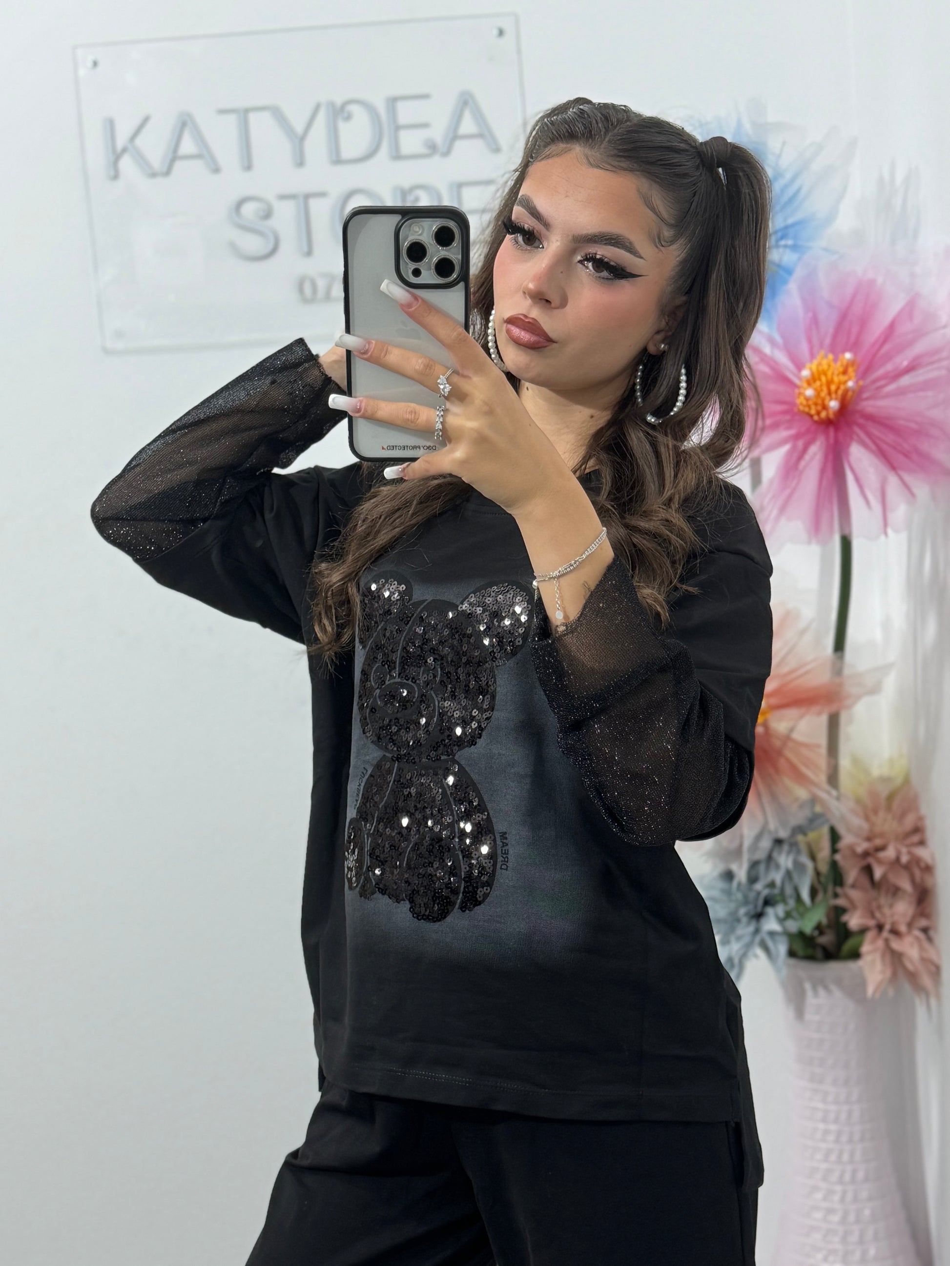 Bluză accesorizata cu un ursuleț primat din paietă si mânecă ușor transparentă
