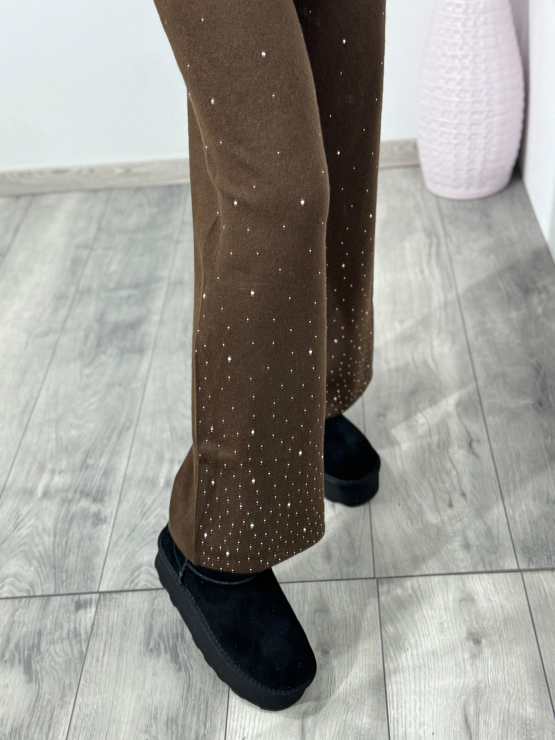 Pantalonii au talie înaltă, șnur,buzunare laterale și cristale ștanțate.