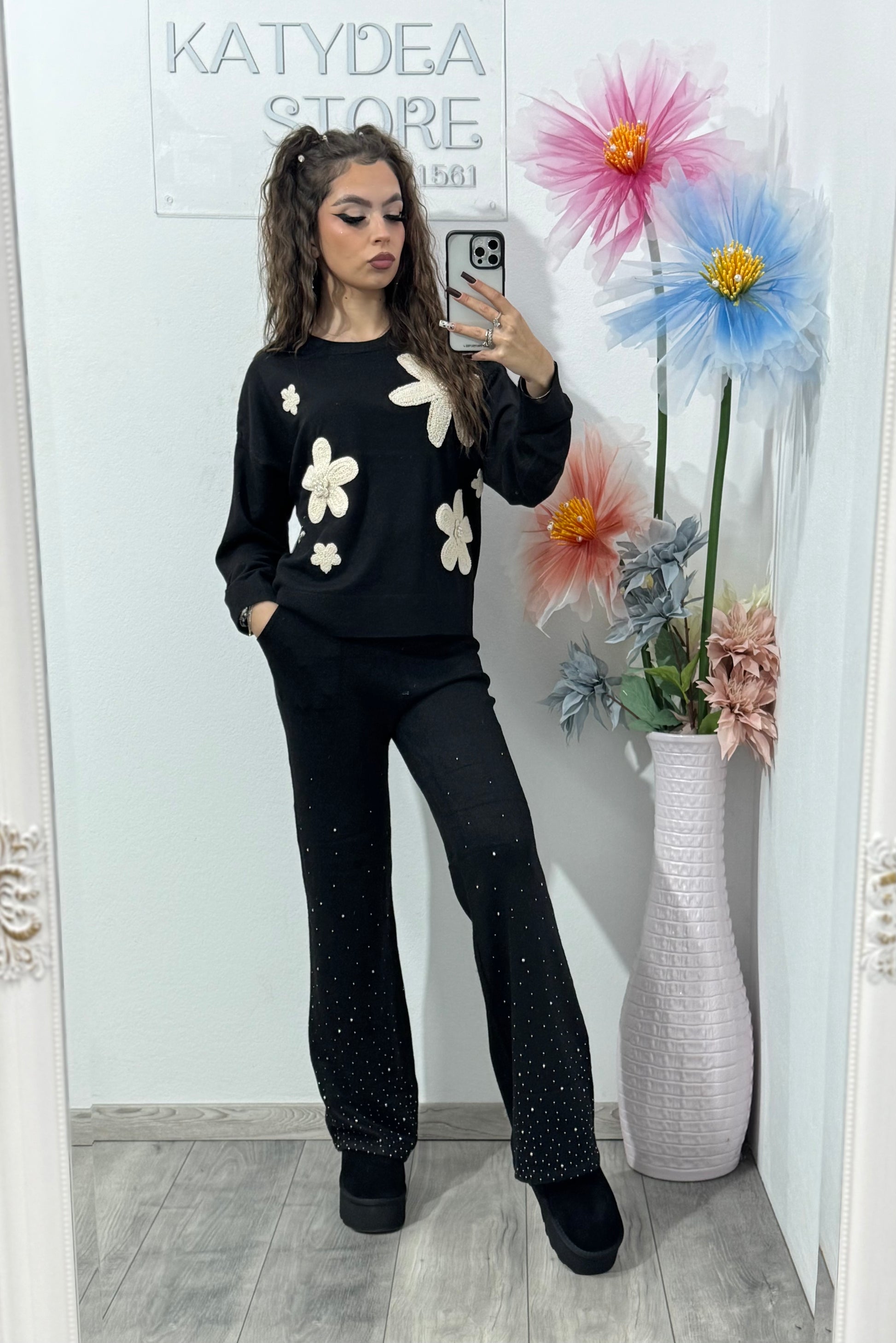 Compleu din tricot format din bluză cu flori tricotate și pantaloni evazați cu cristale argintii.