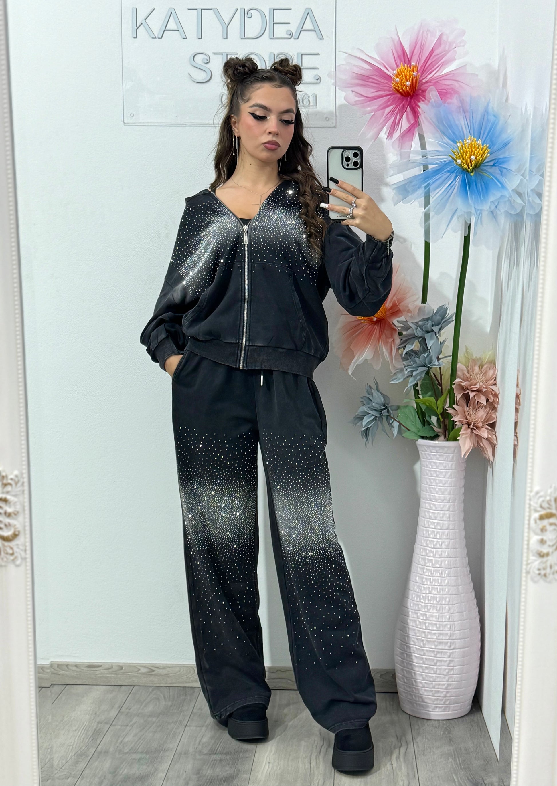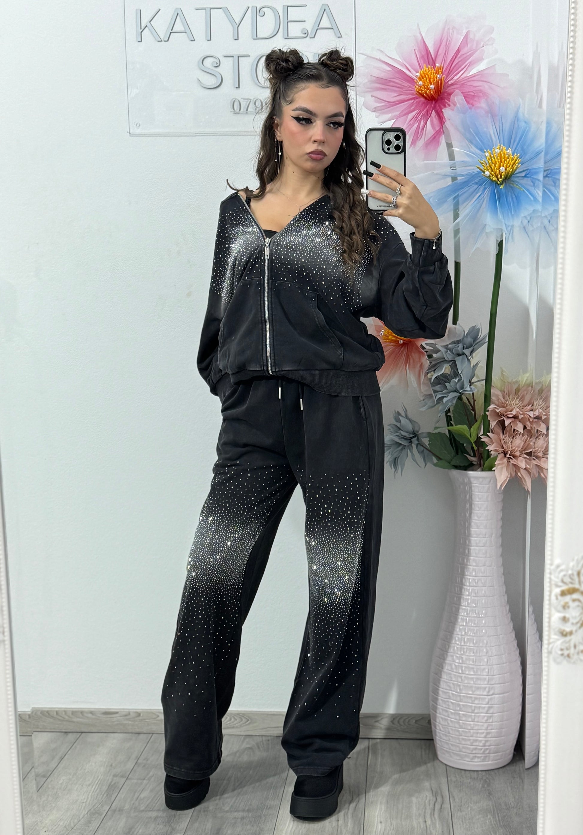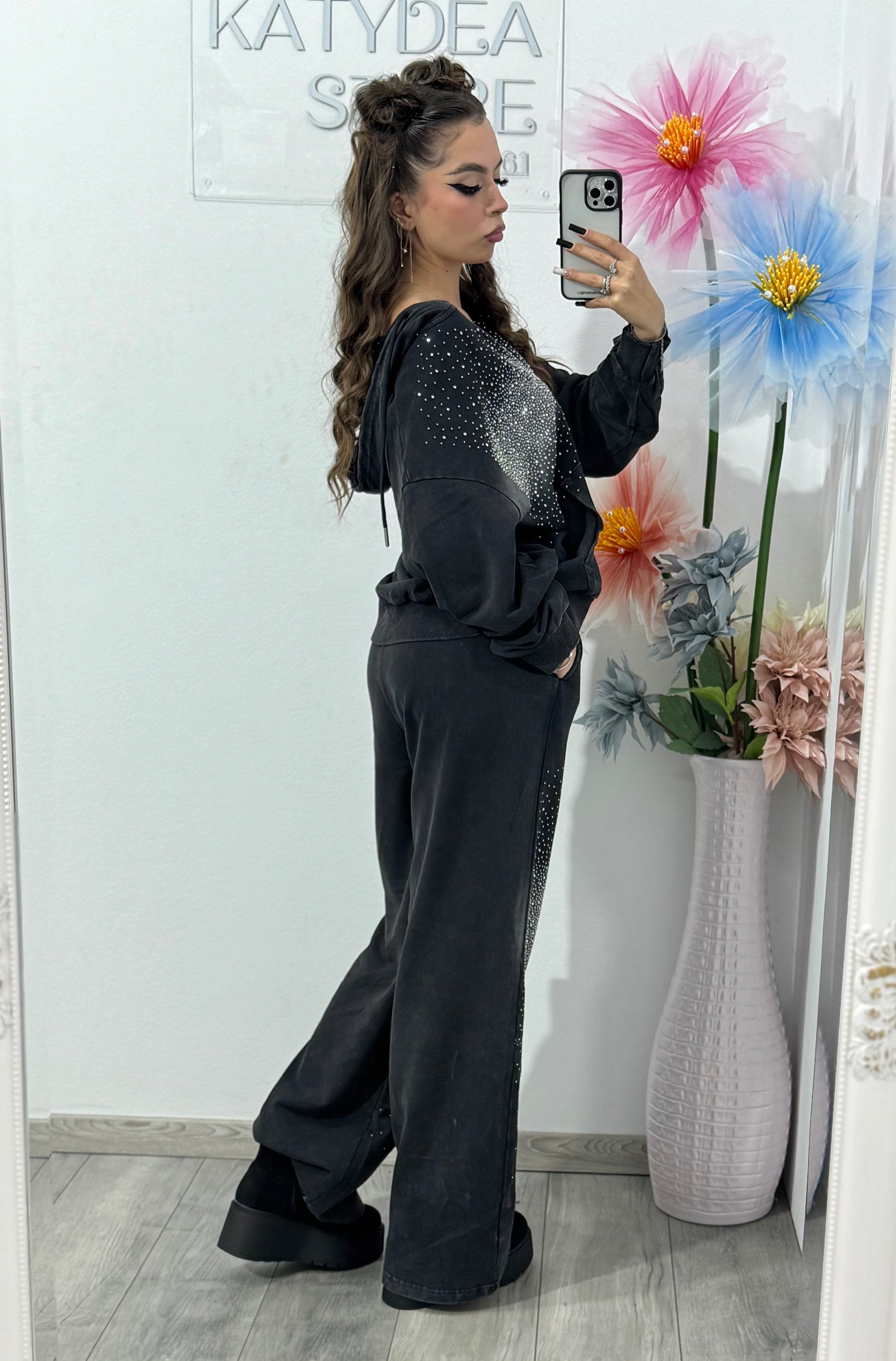 Un outfit sofisticat și modern, acest compleu prespălat în nuanțe de negru și gri îmbină perfect stilul urban cu accente glam. Setul este compus din pantaloni Wide Leg și bluză cu fermoar frontal, ambele decorate cu cristale argintii ce adaugă un plus de rafinament și strălucire discretă.