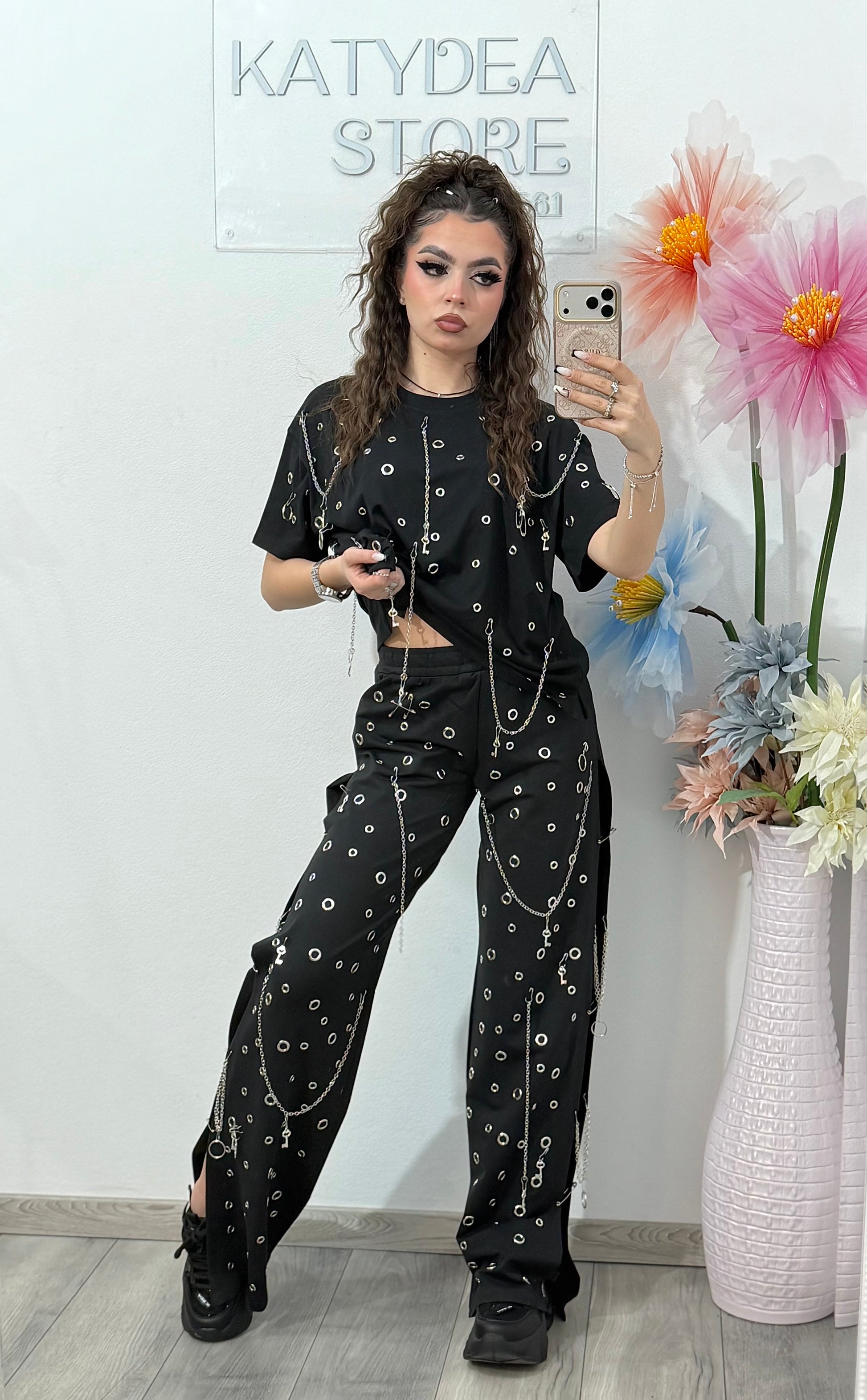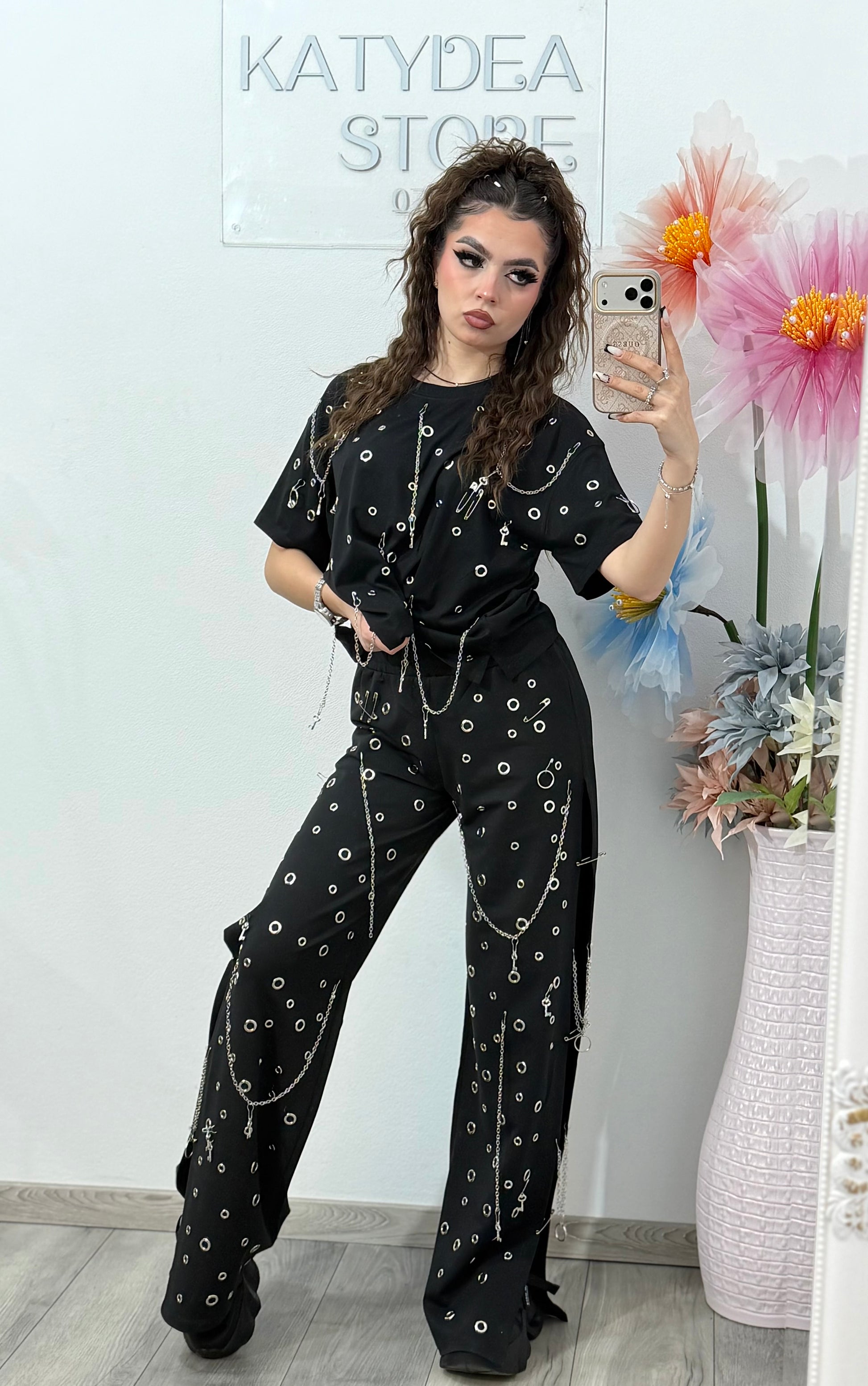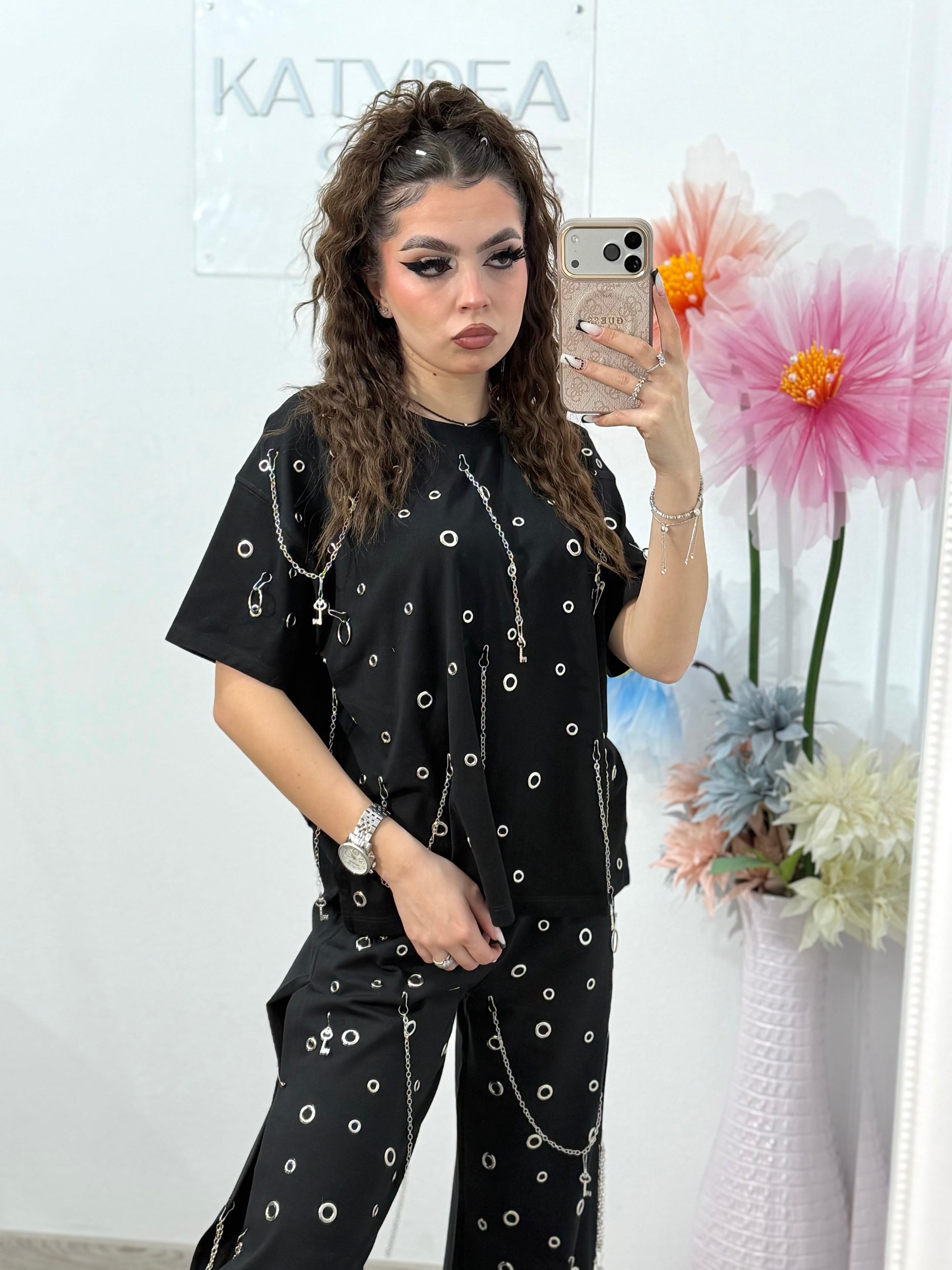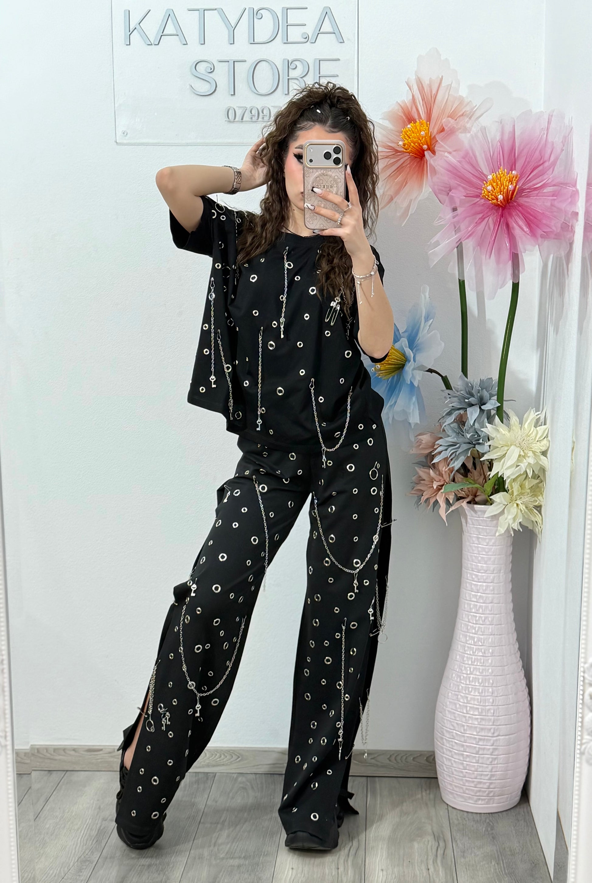 Compleu modern format din tricou lejer și pantaloni lungi, realizat într-o nuanță elegantă de negru, ideal pentru un look statement. Materialul este fluid și confortabil, cu o cădere frumoasă pe corp.