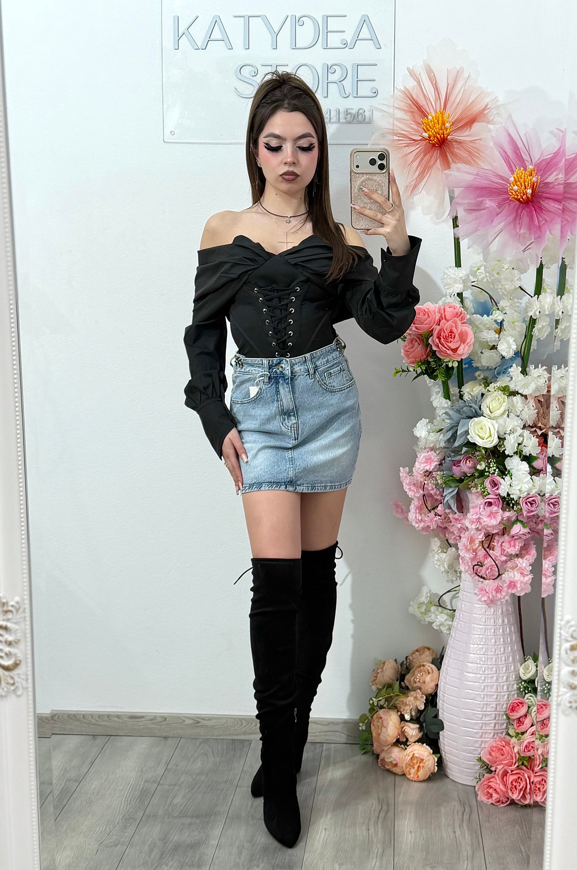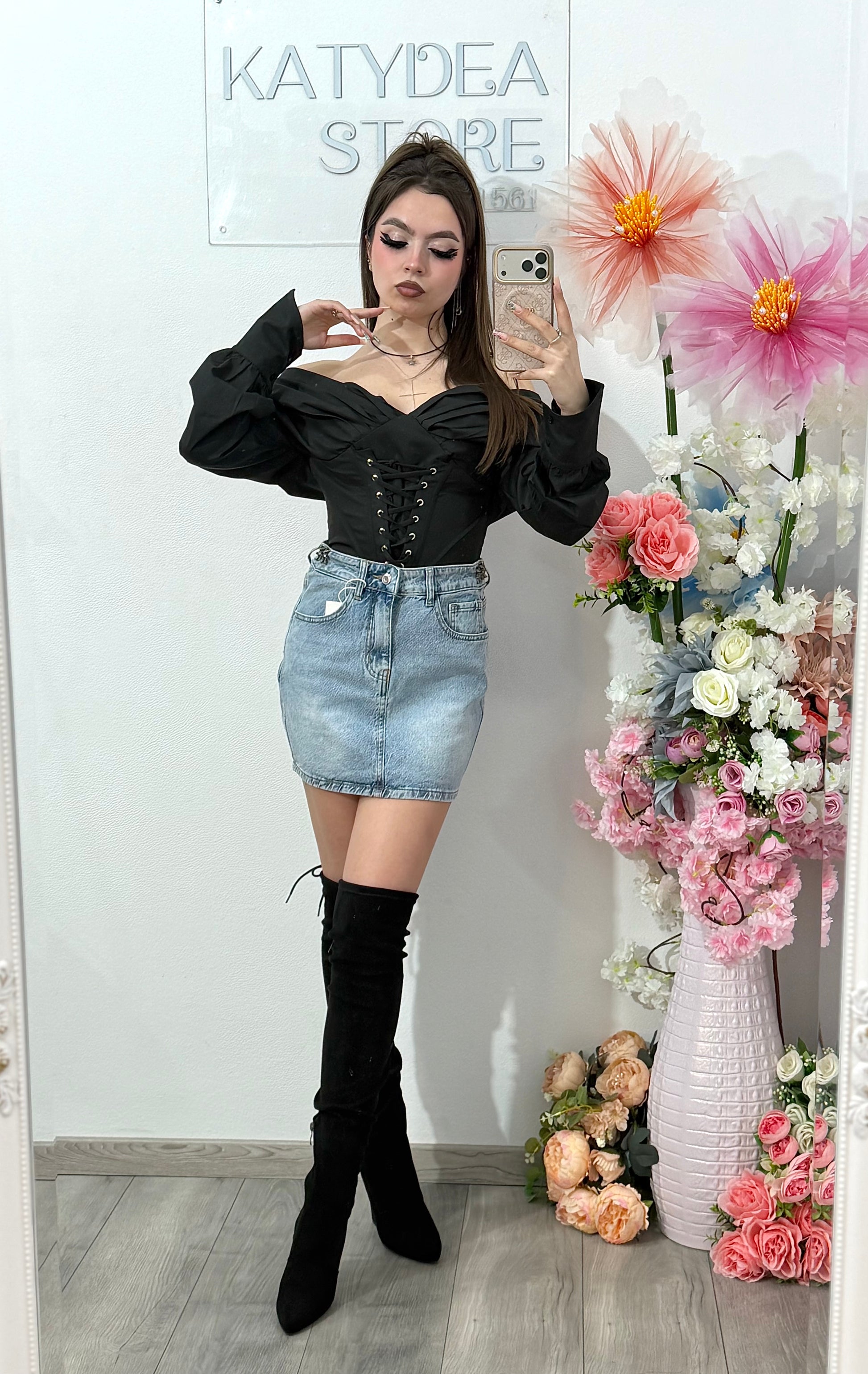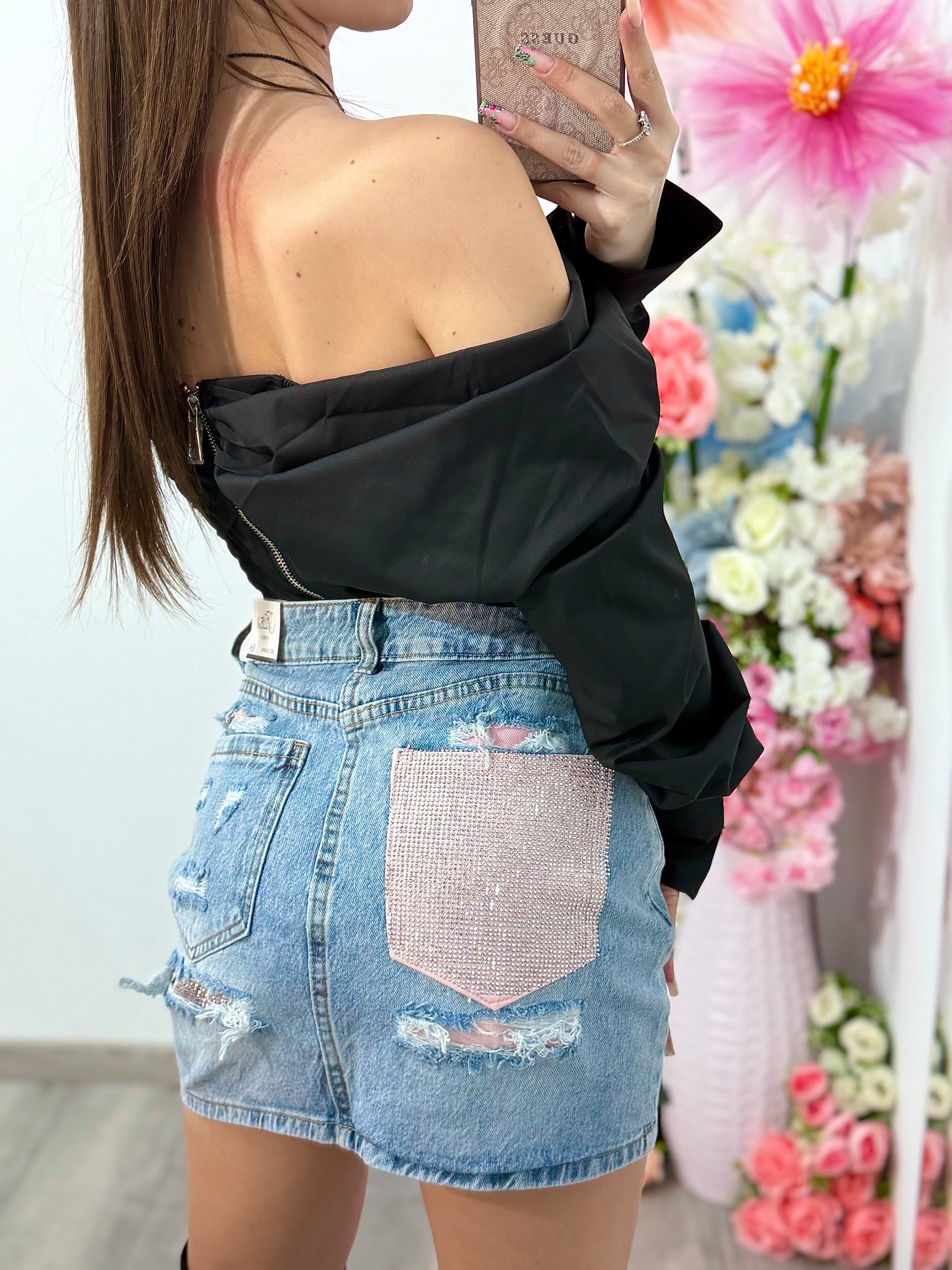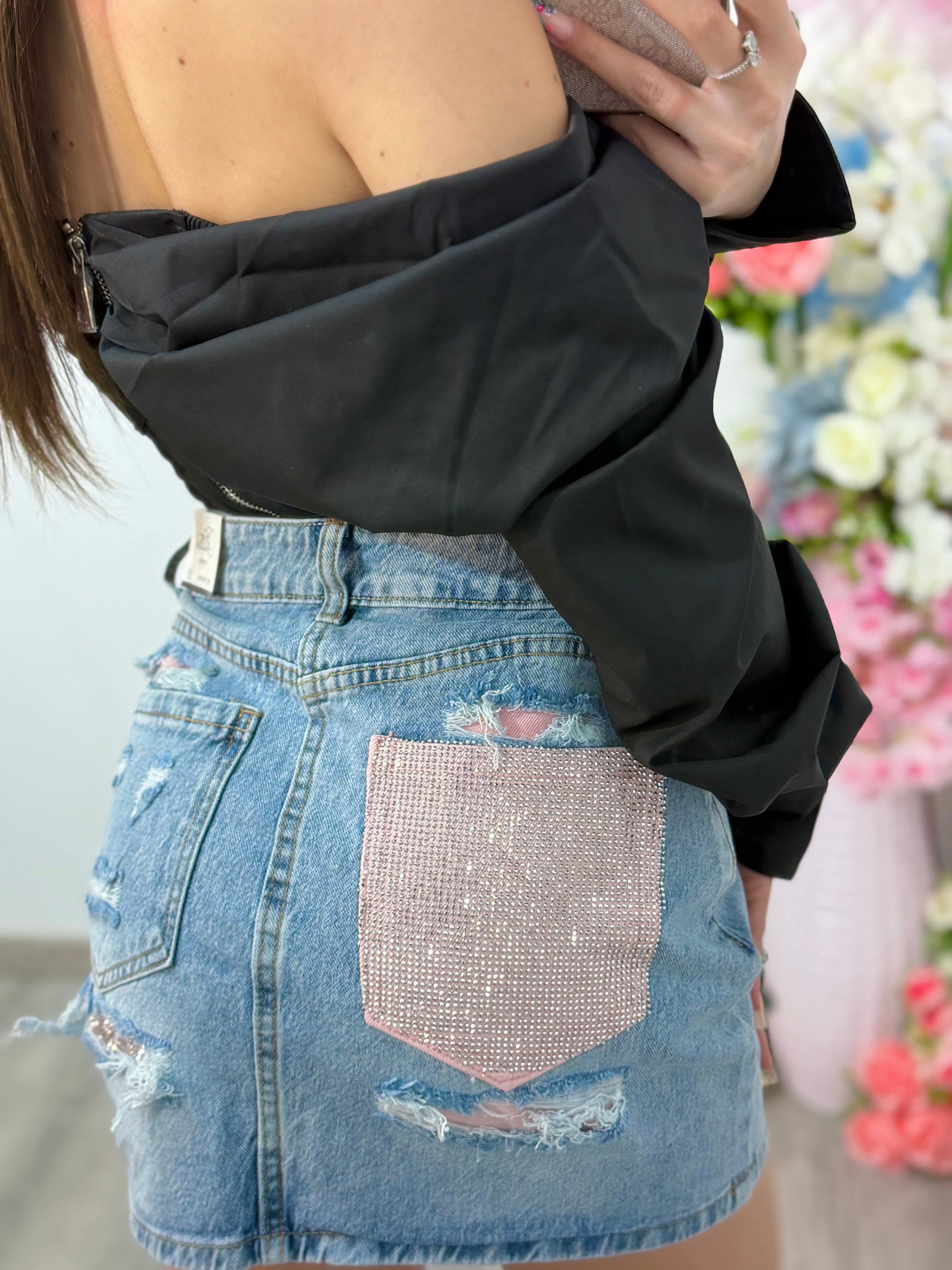 Fustă din denim cu buzunar roz cu cristale RAMONA