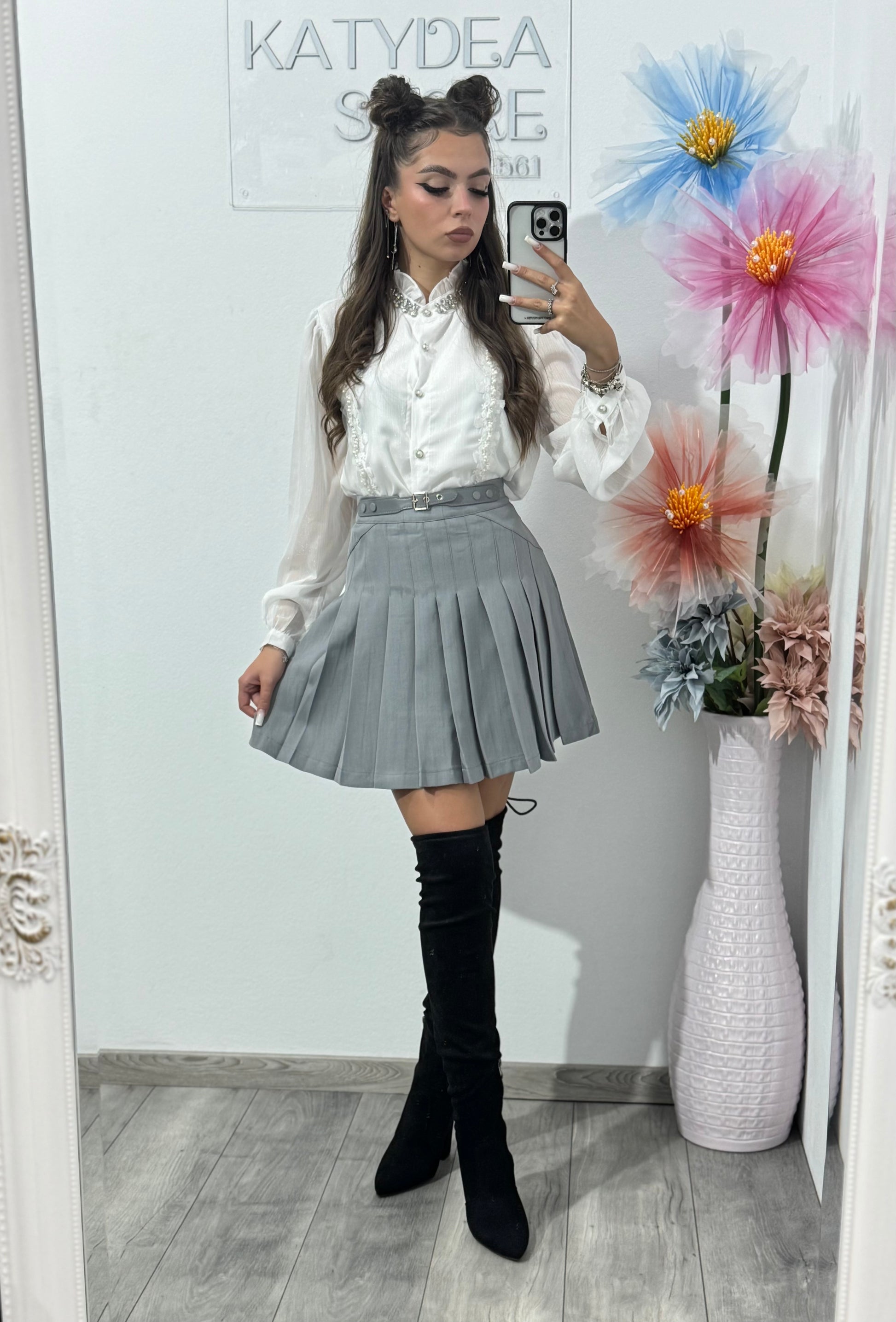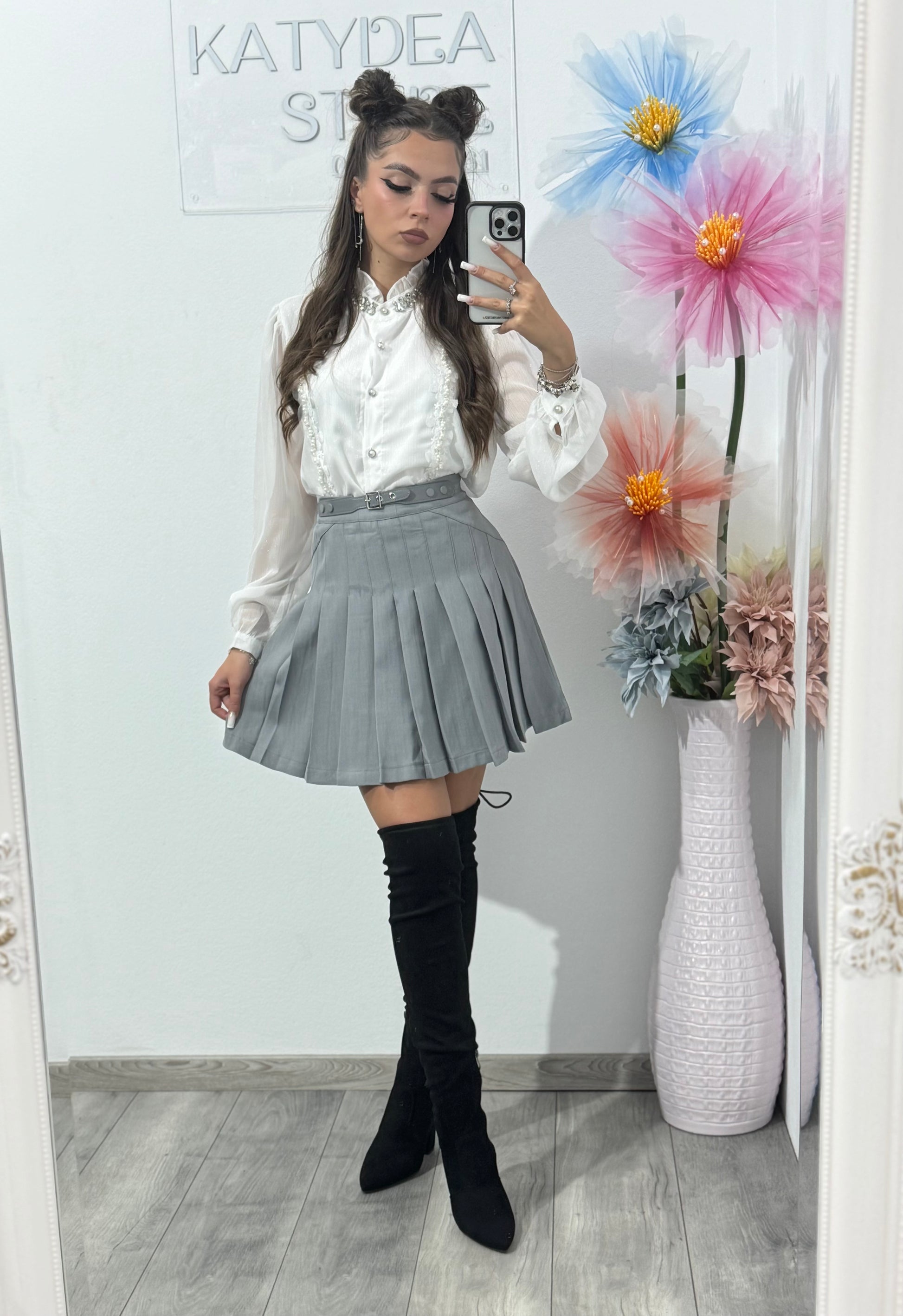 Fustă gri plisată cu catarame Sorina