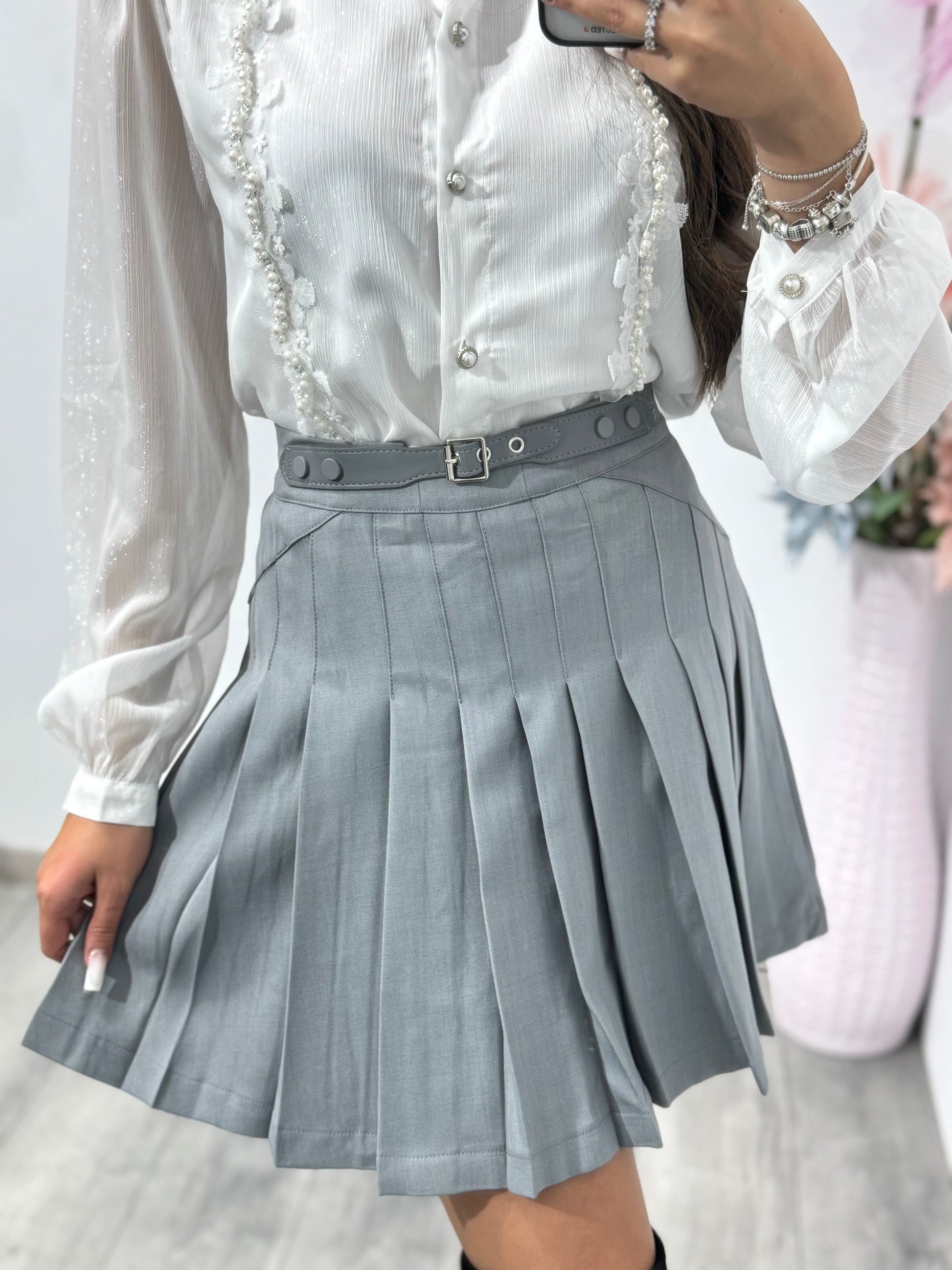 Fustă scurtă plisată gri cu cataramă în talie