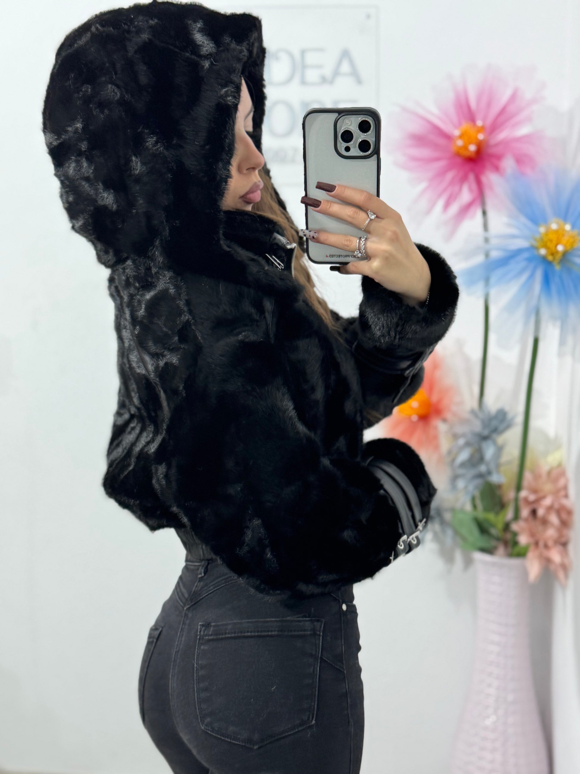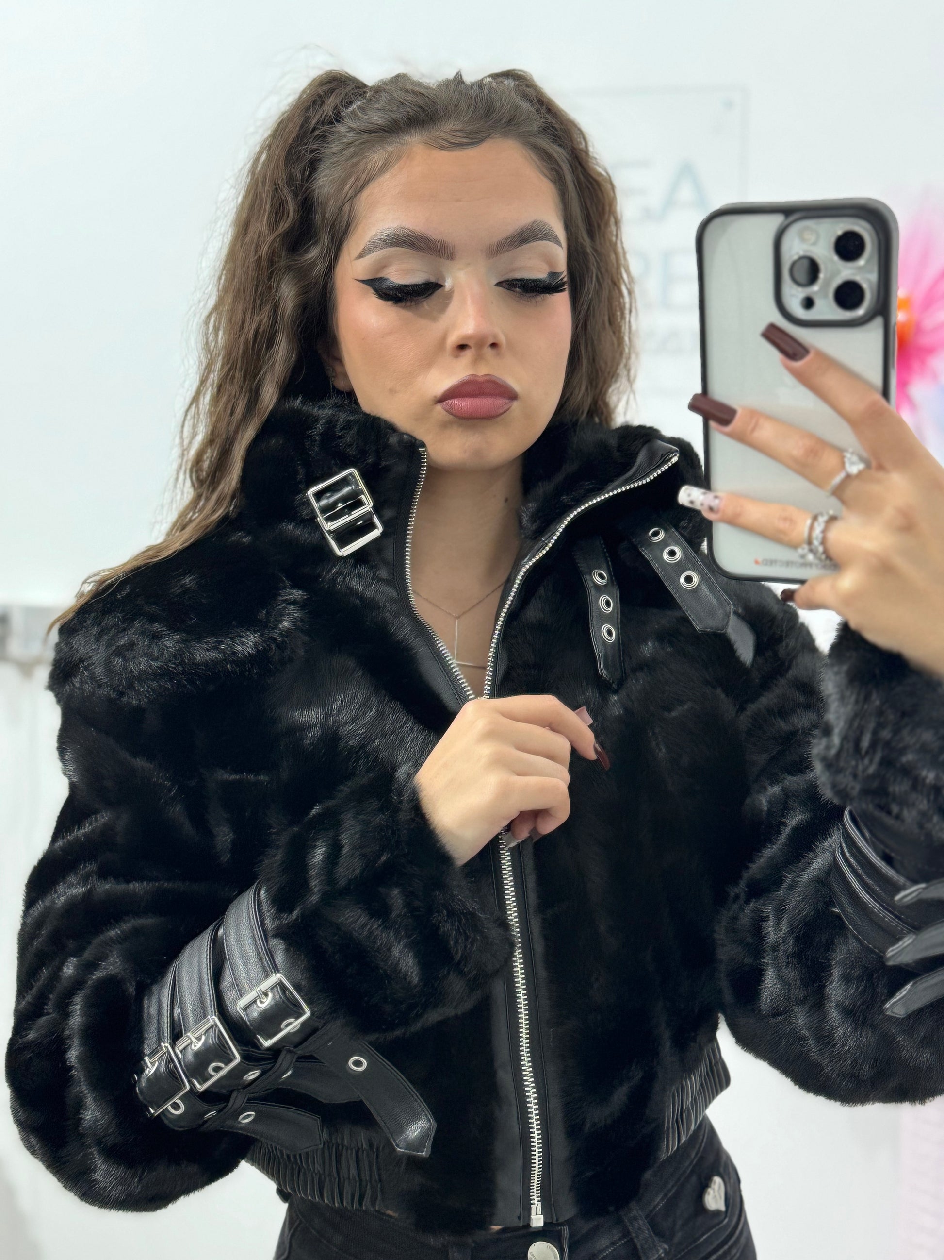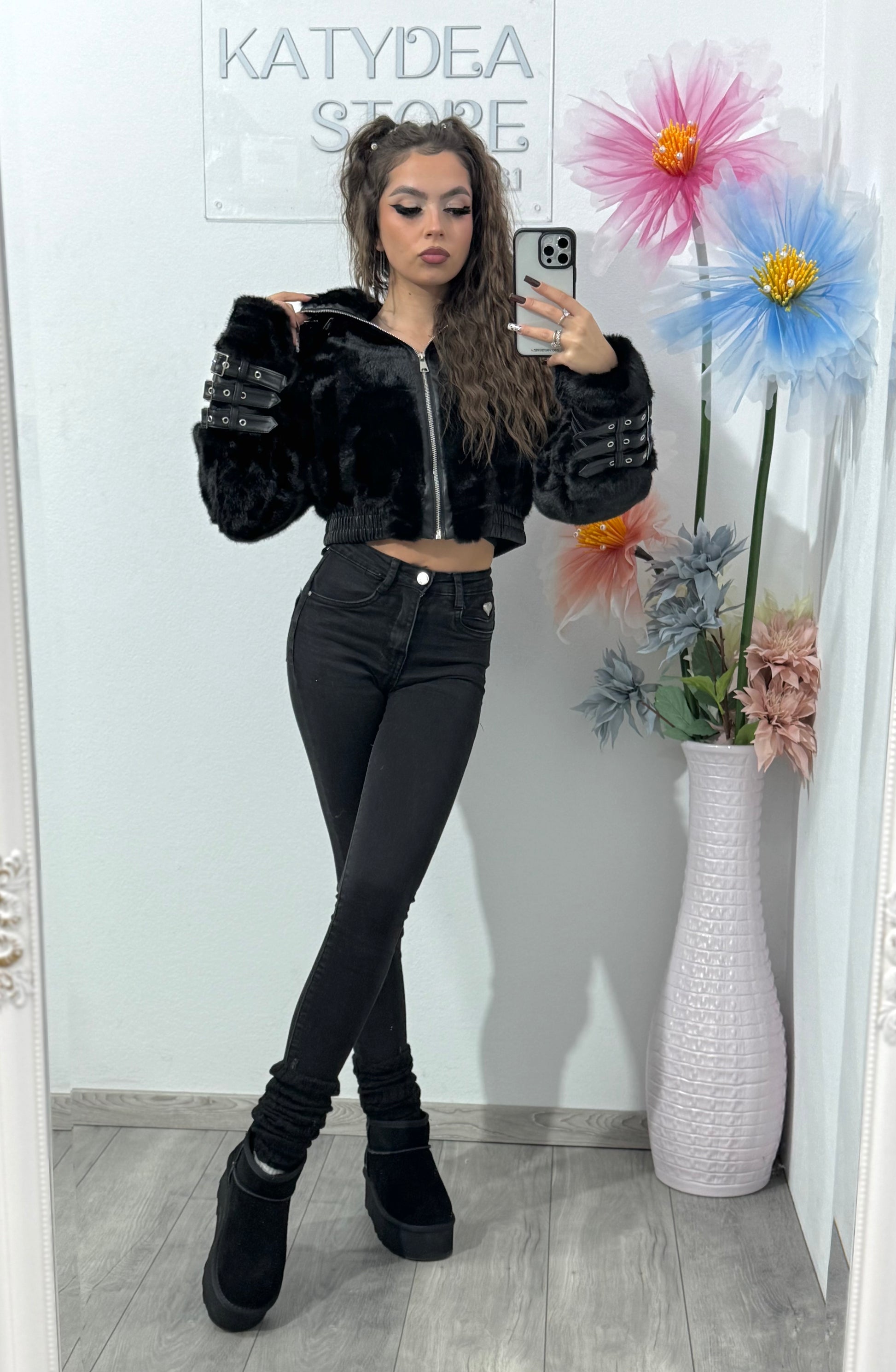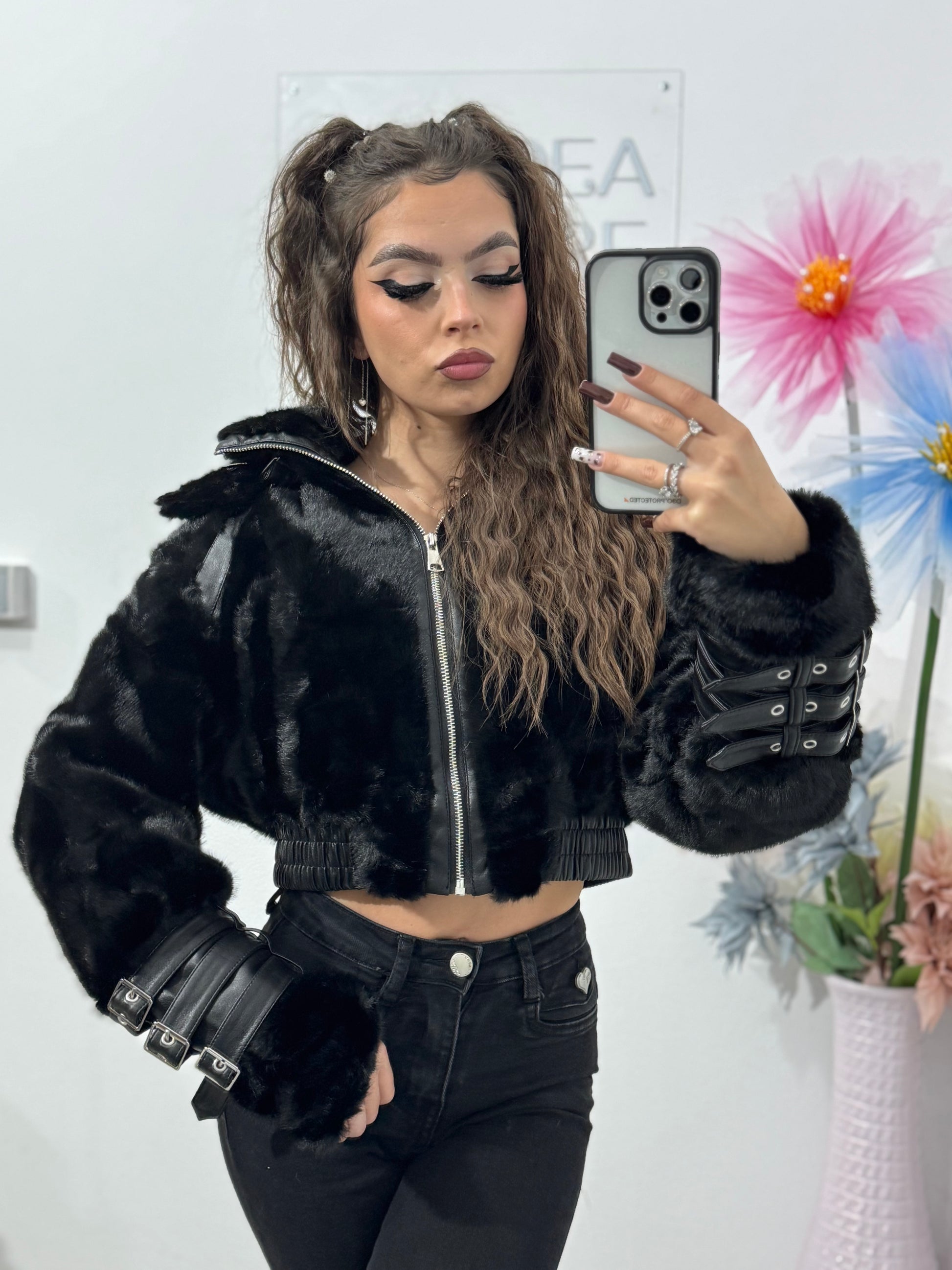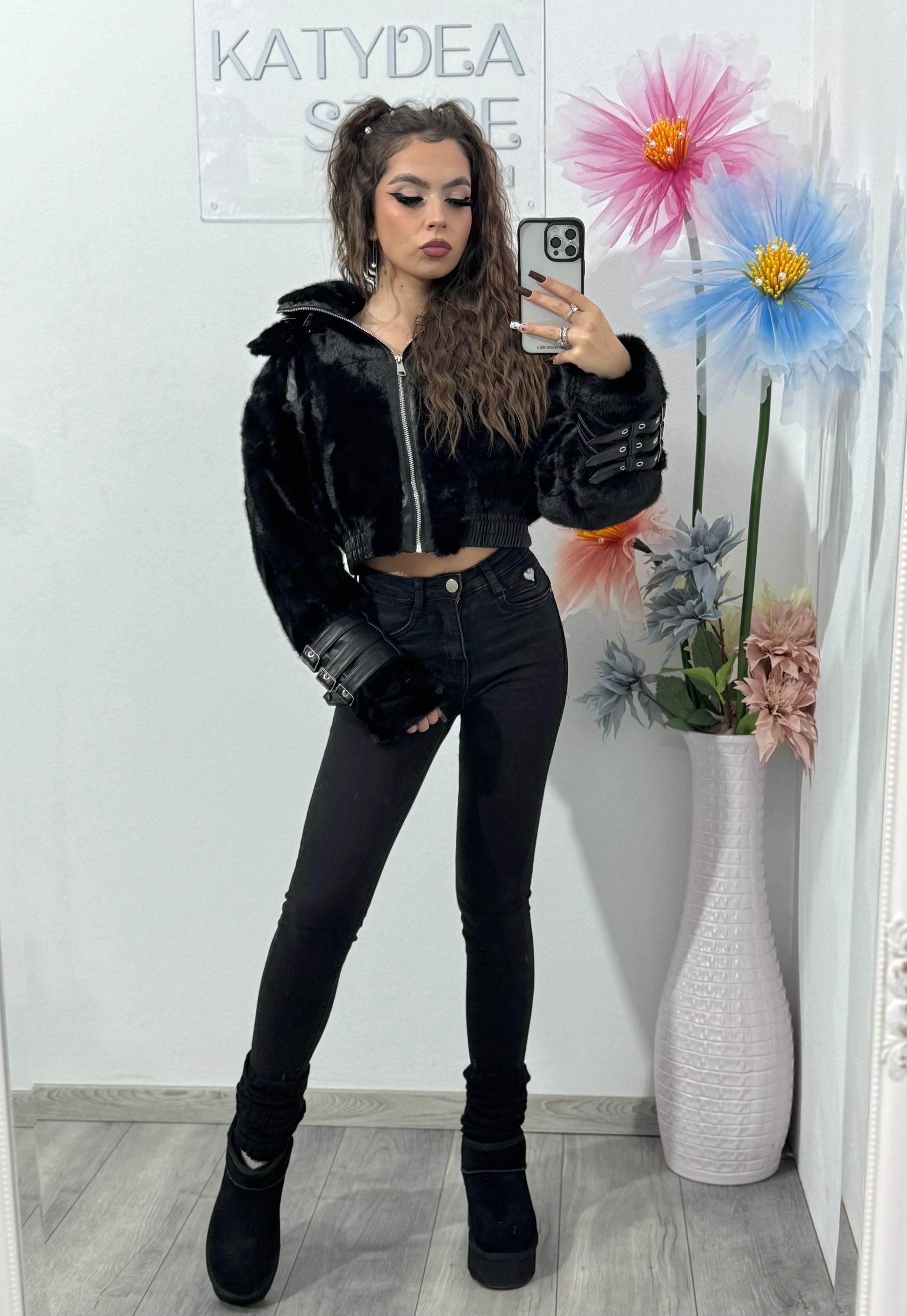 Adaugă un plus de glamour și atitudine ținutelor tale cu această geacă scurtă din blană artificială neagră, perfectă pentru un look modern, stylish și ușor edgy.