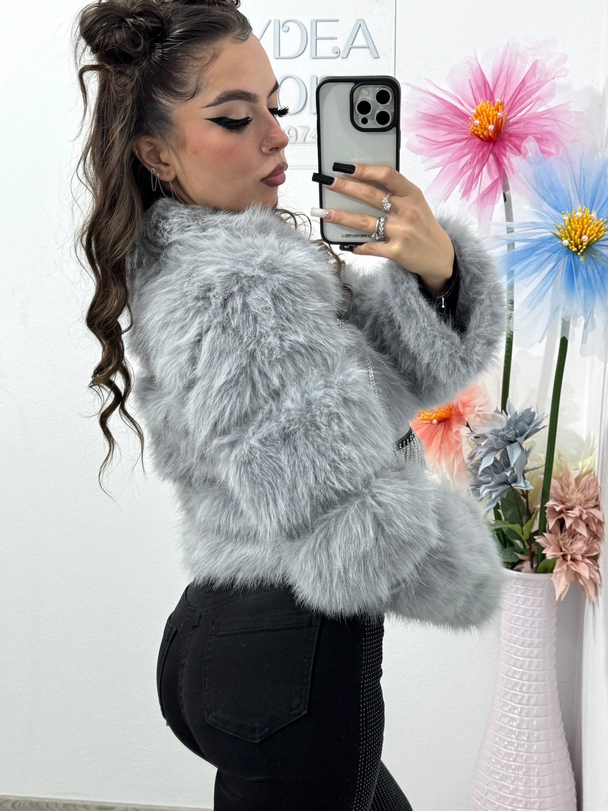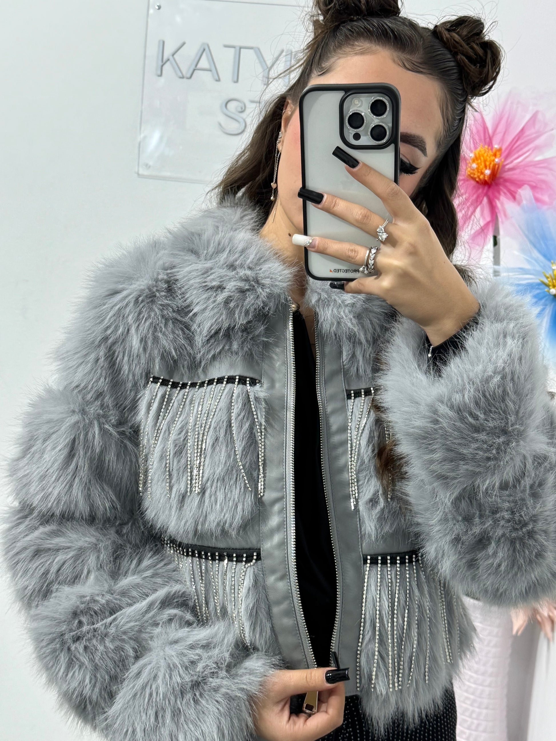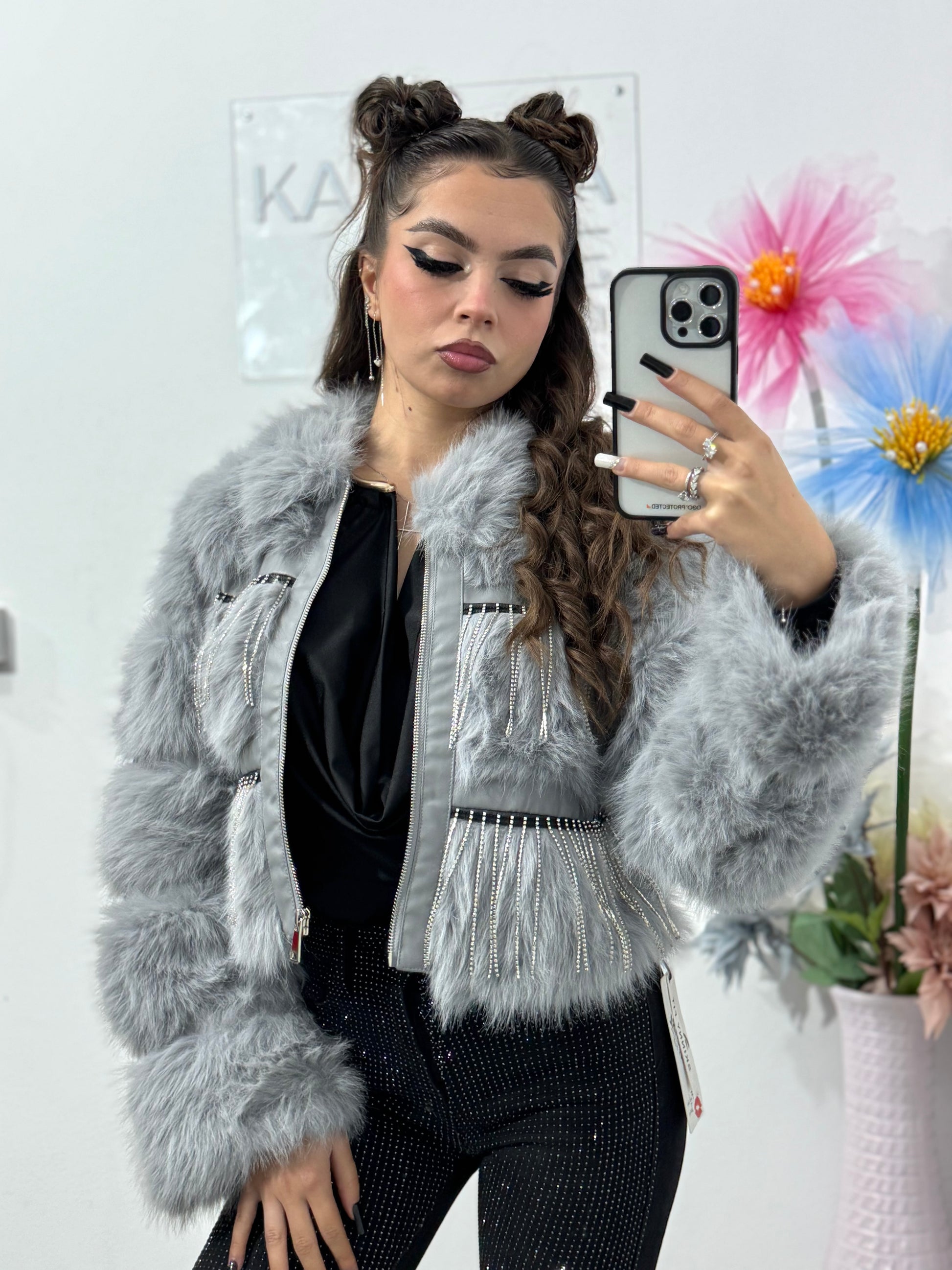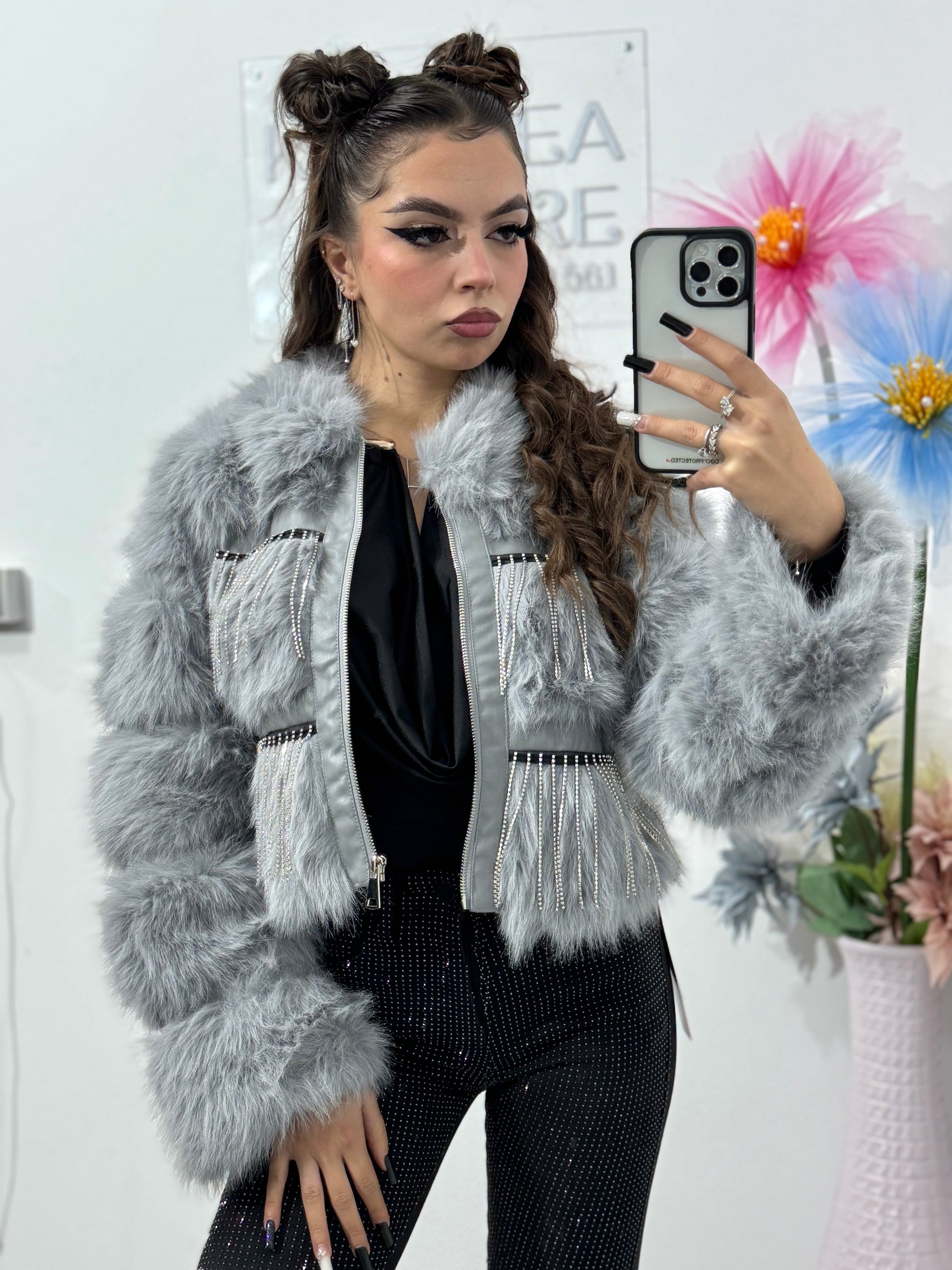 Geacă elegantă, confecționată din blană artificială neagră de calitate, foarte fină la atingere și cu aspect sofisticat. Piesa este accesorizată cu 4 lanțuri ornamentale decorate cu cristale strălucitoare, care îi oferă un plus de rafinament și un aer glam, perfect pentru evenimente speciale sau ținute statement.