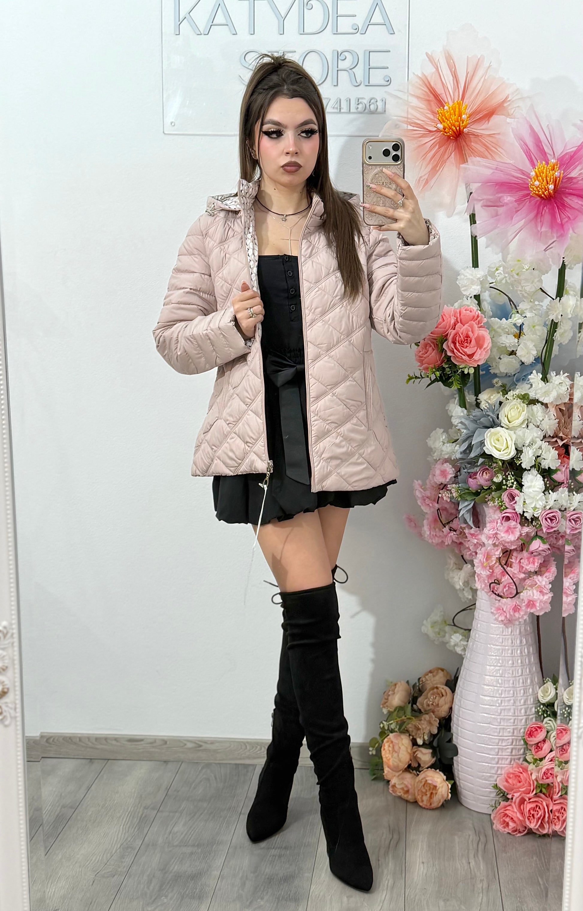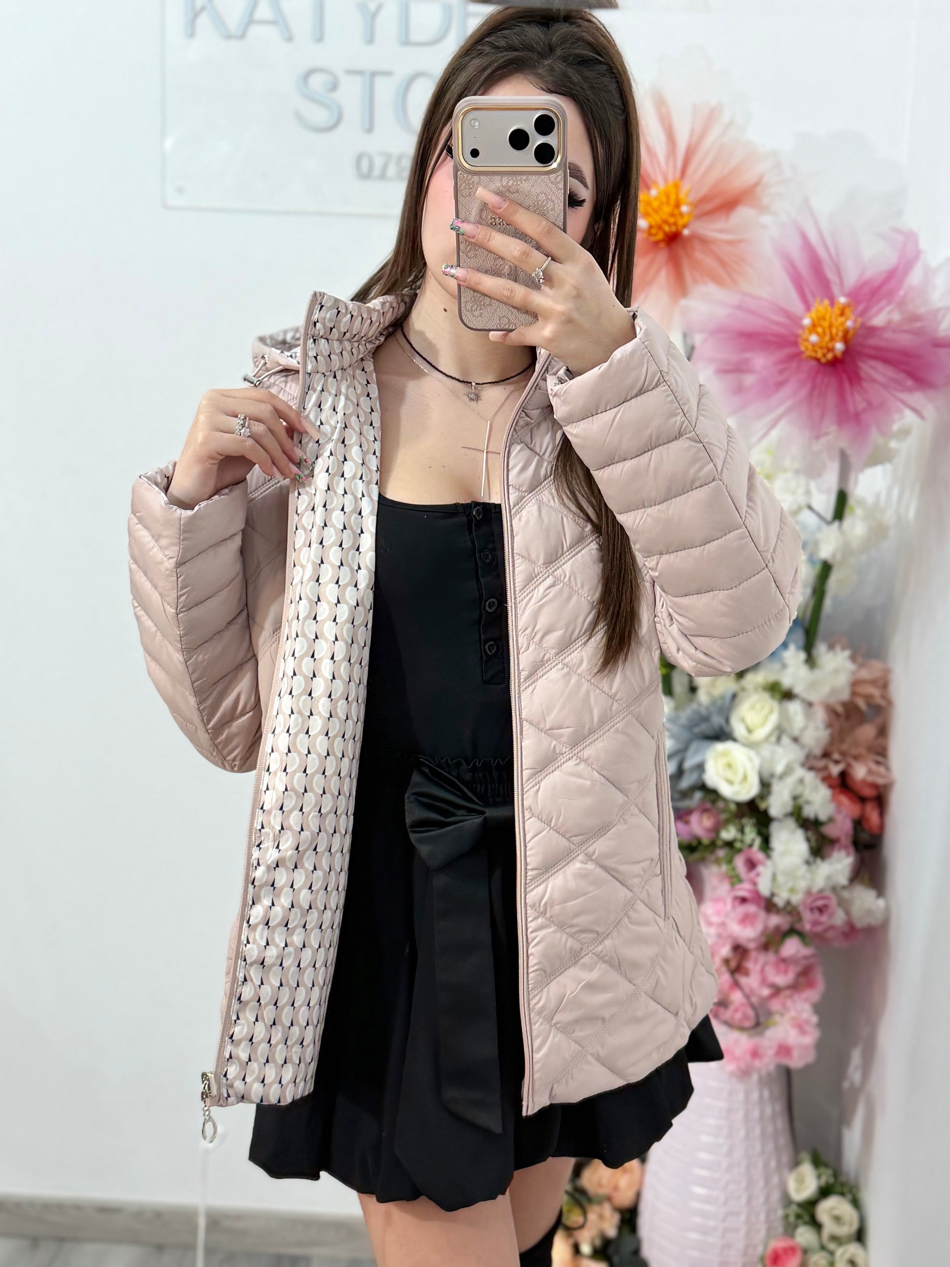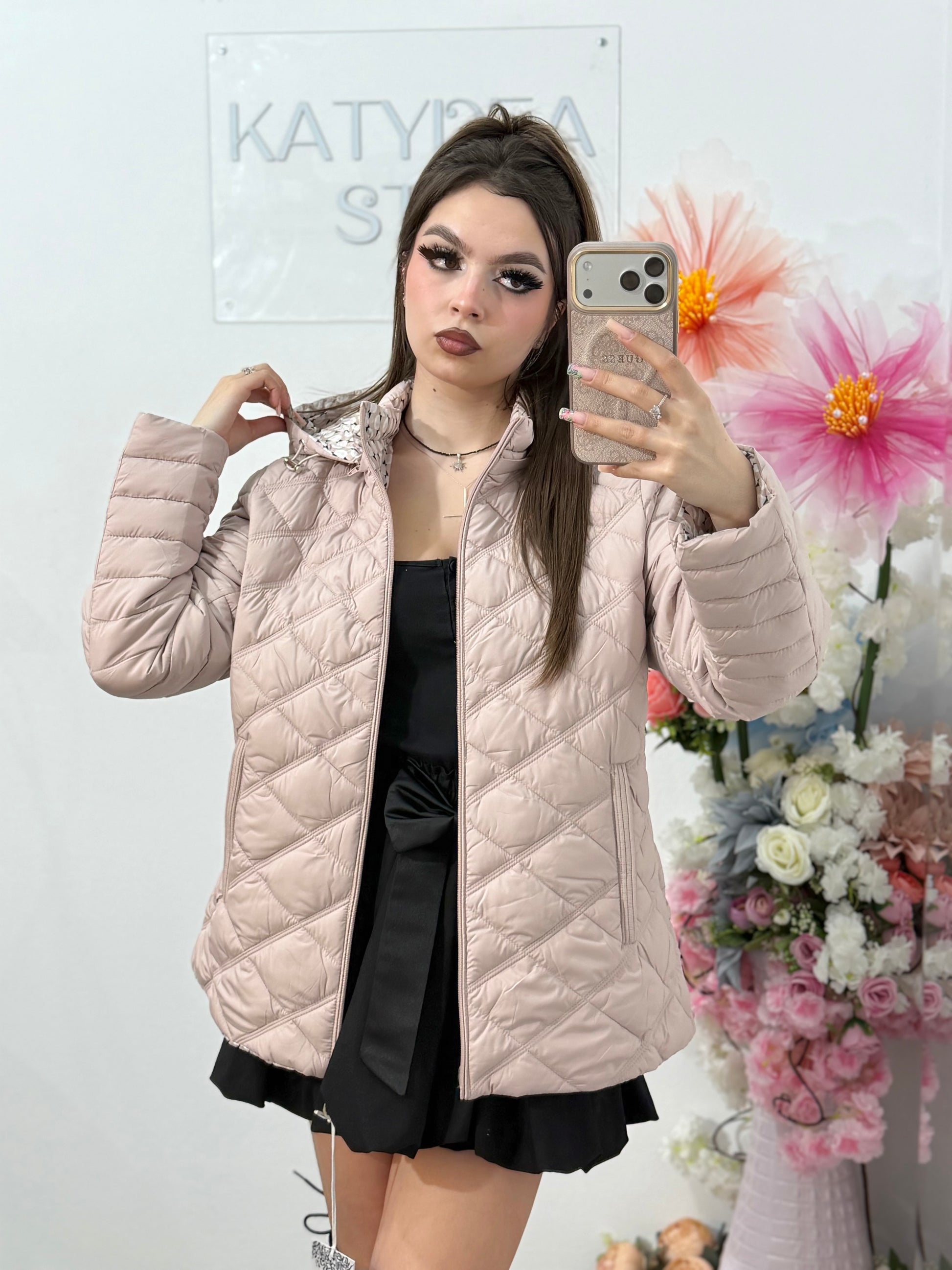 - oferă două stiluri într-o singură geacă: unul minimalist (bej simplu) și unul cu imprimeu modern.
