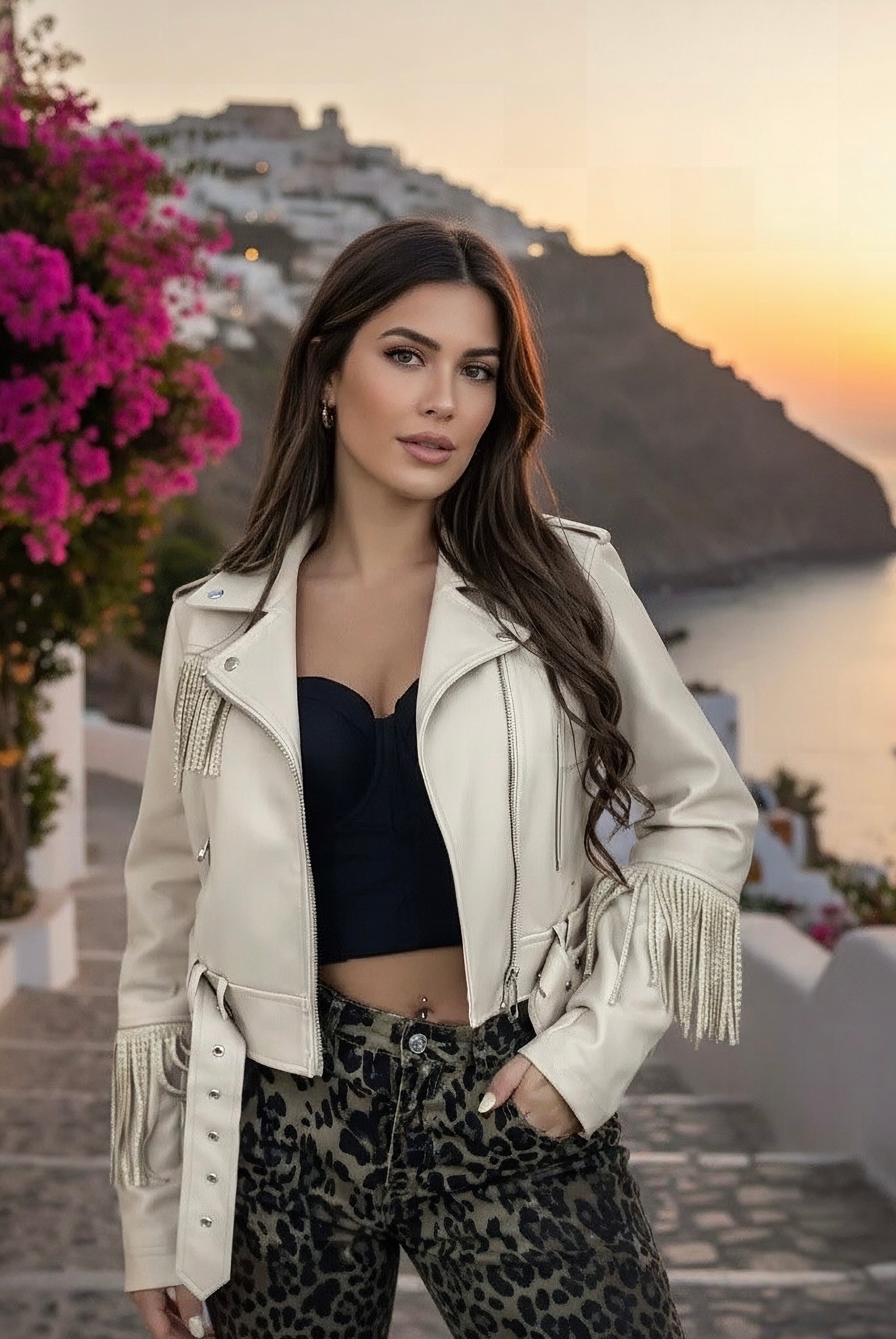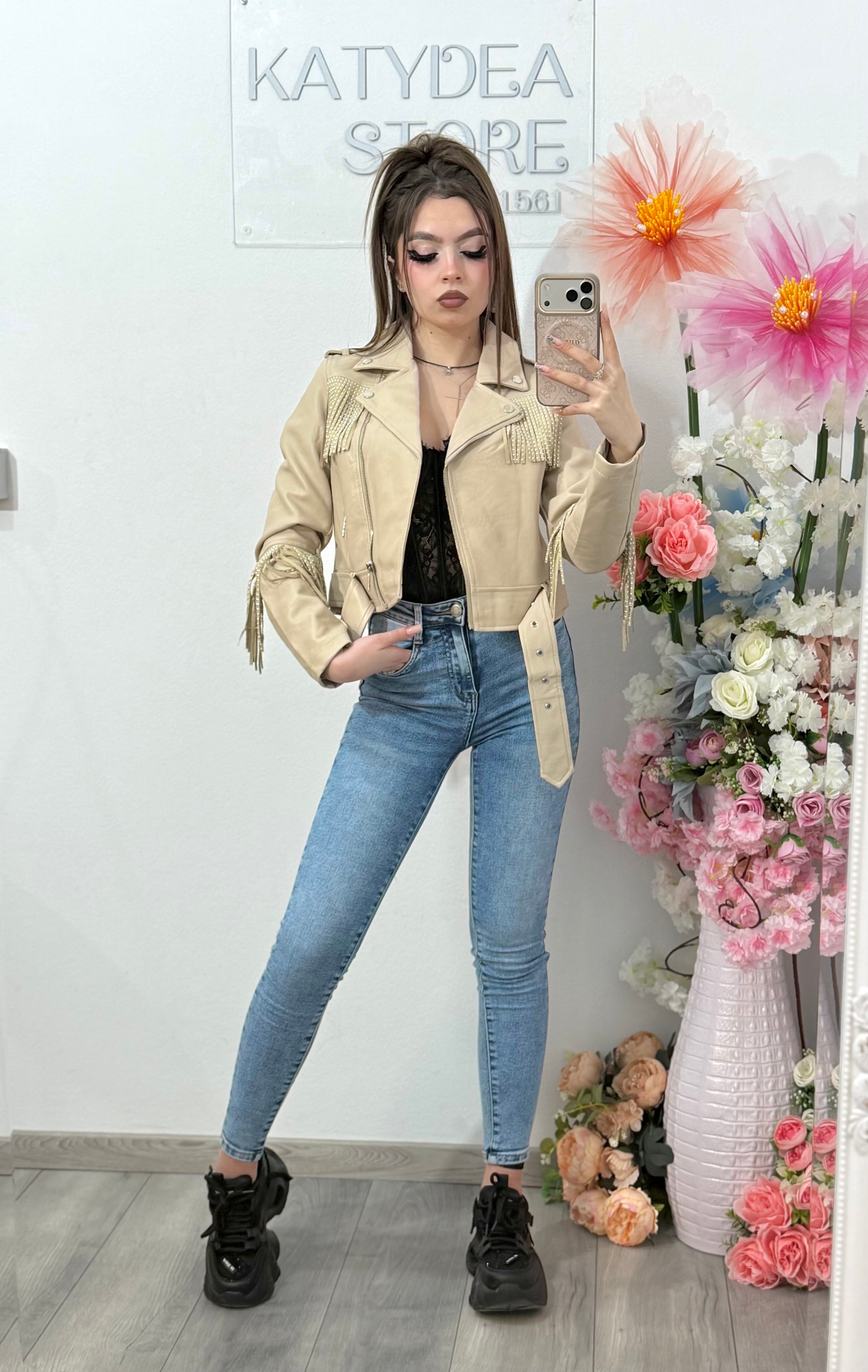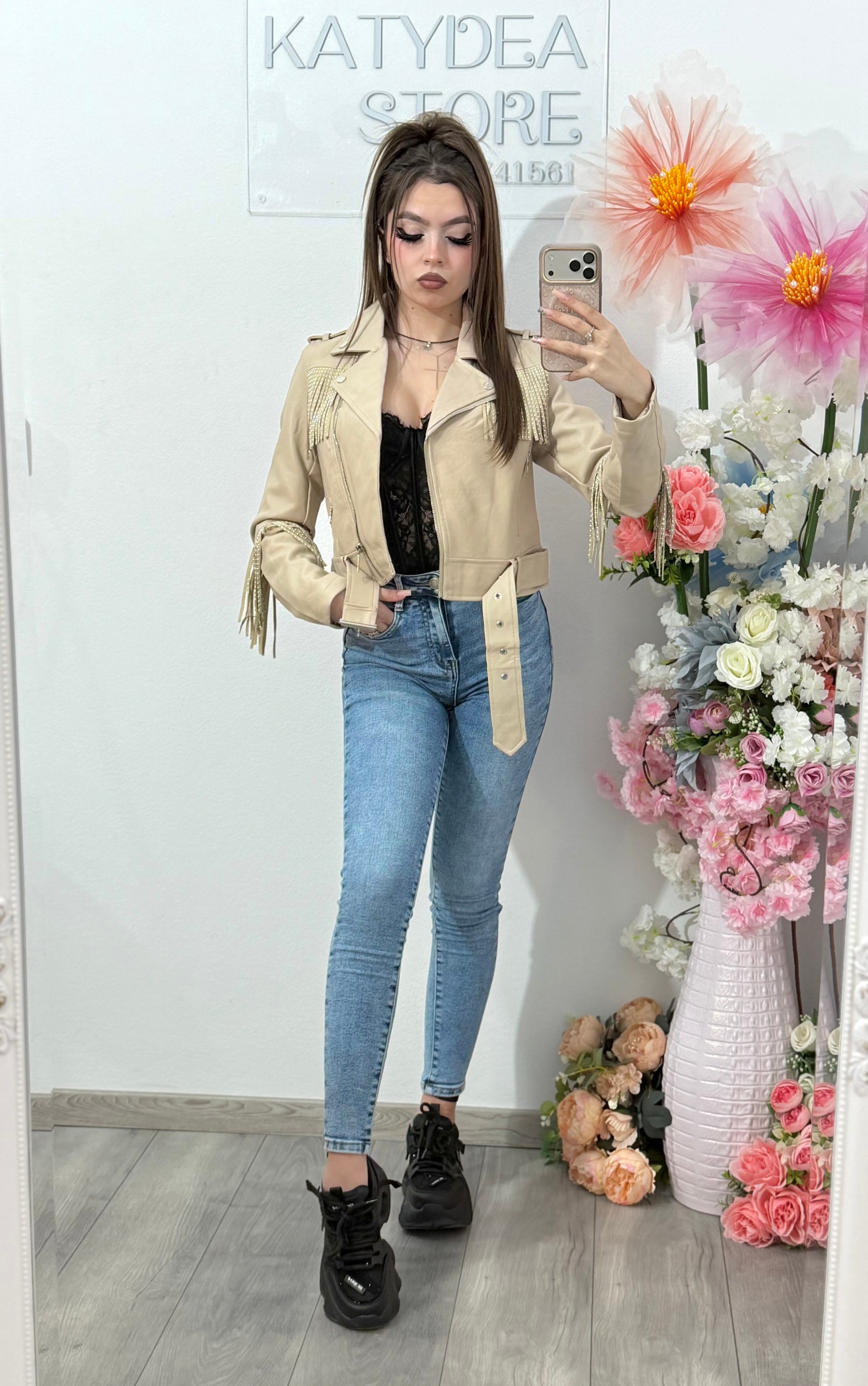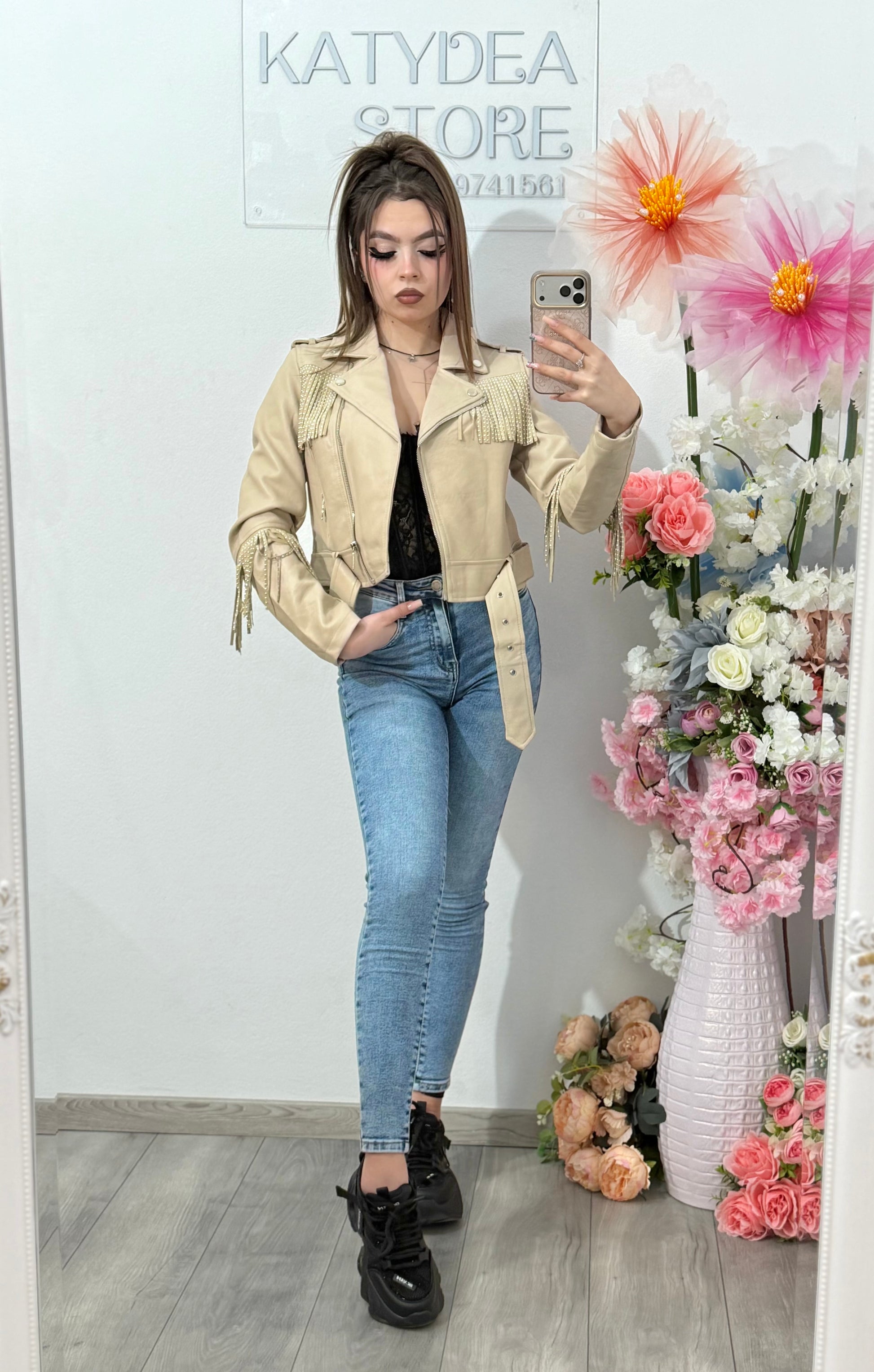 Geacă scurtă de damă în stil biker, cu franjuri decorative strălucitoare aplicate pe umeri și mâneci. Designul îmbină eleganța cu stilul rock, fiind perfect pentru outfituri moderne și îndrăznețe. Croiala scurtă și talia ajustabilă cu curea oferă o siluetă feminină și bine definită.