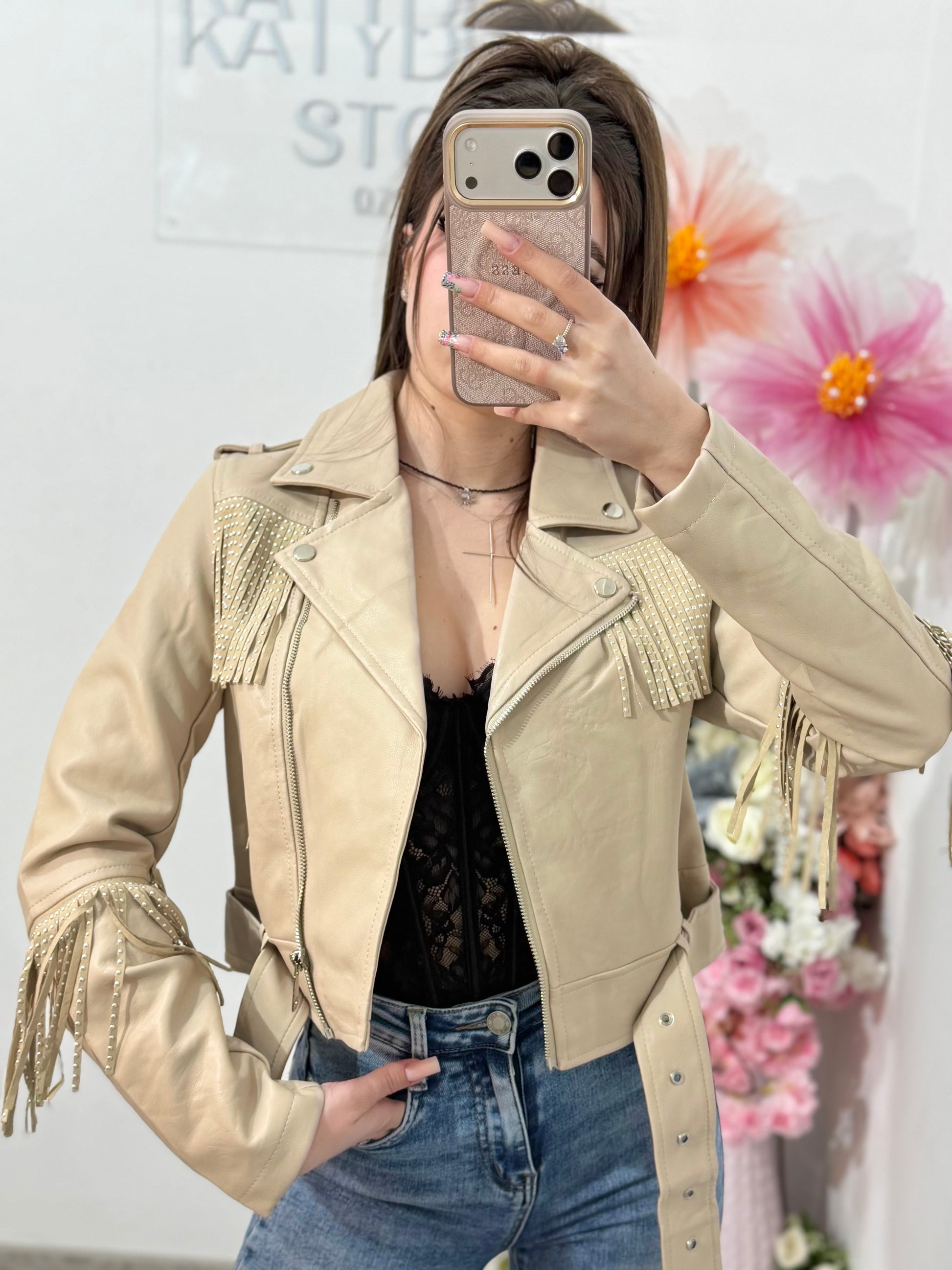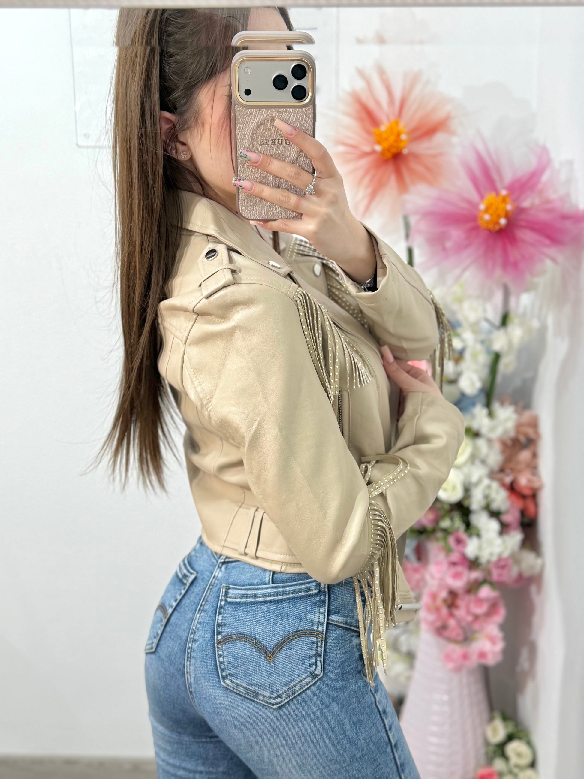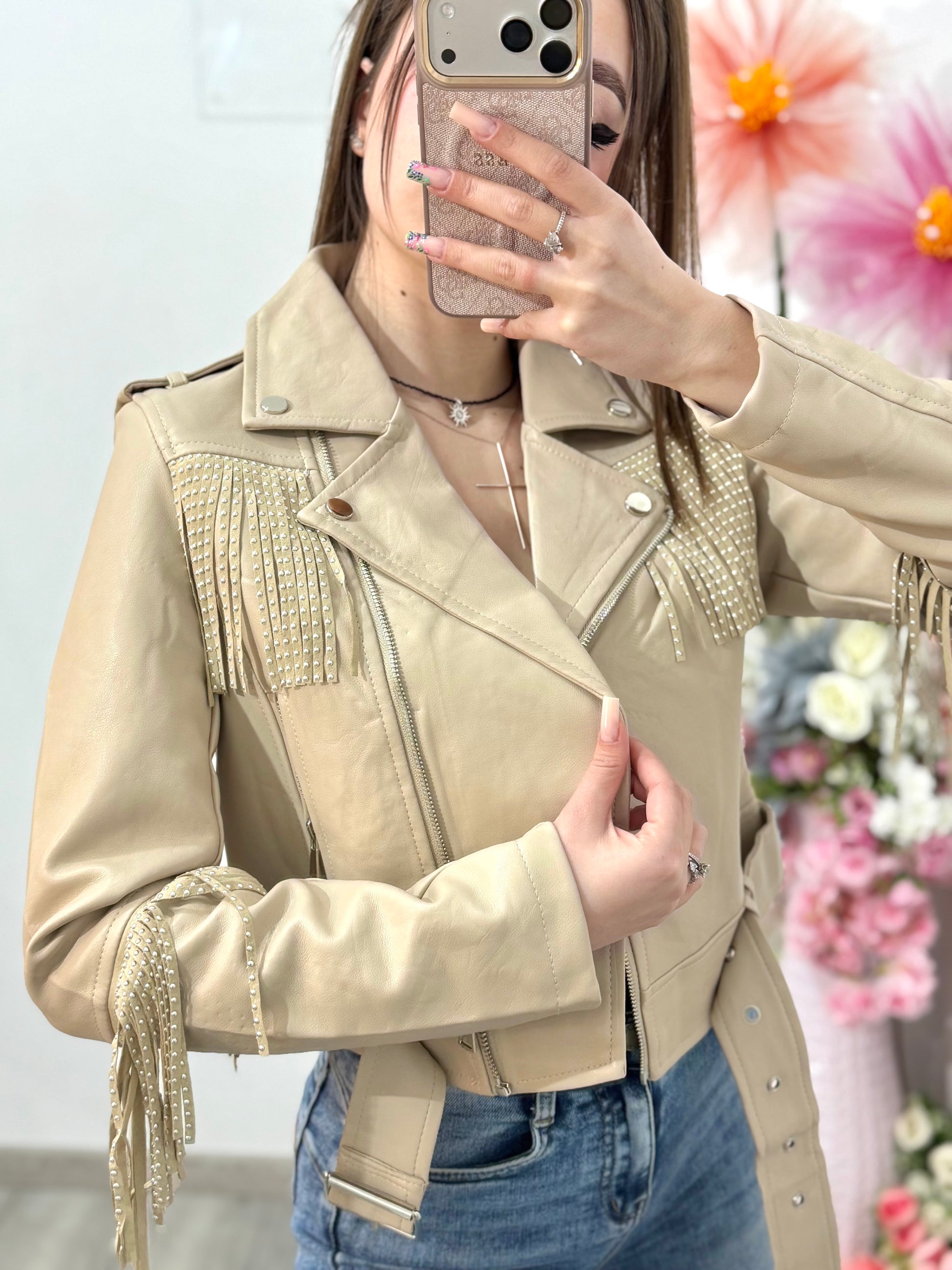 Geacă din imitație de piele cu franjuri bej MARA