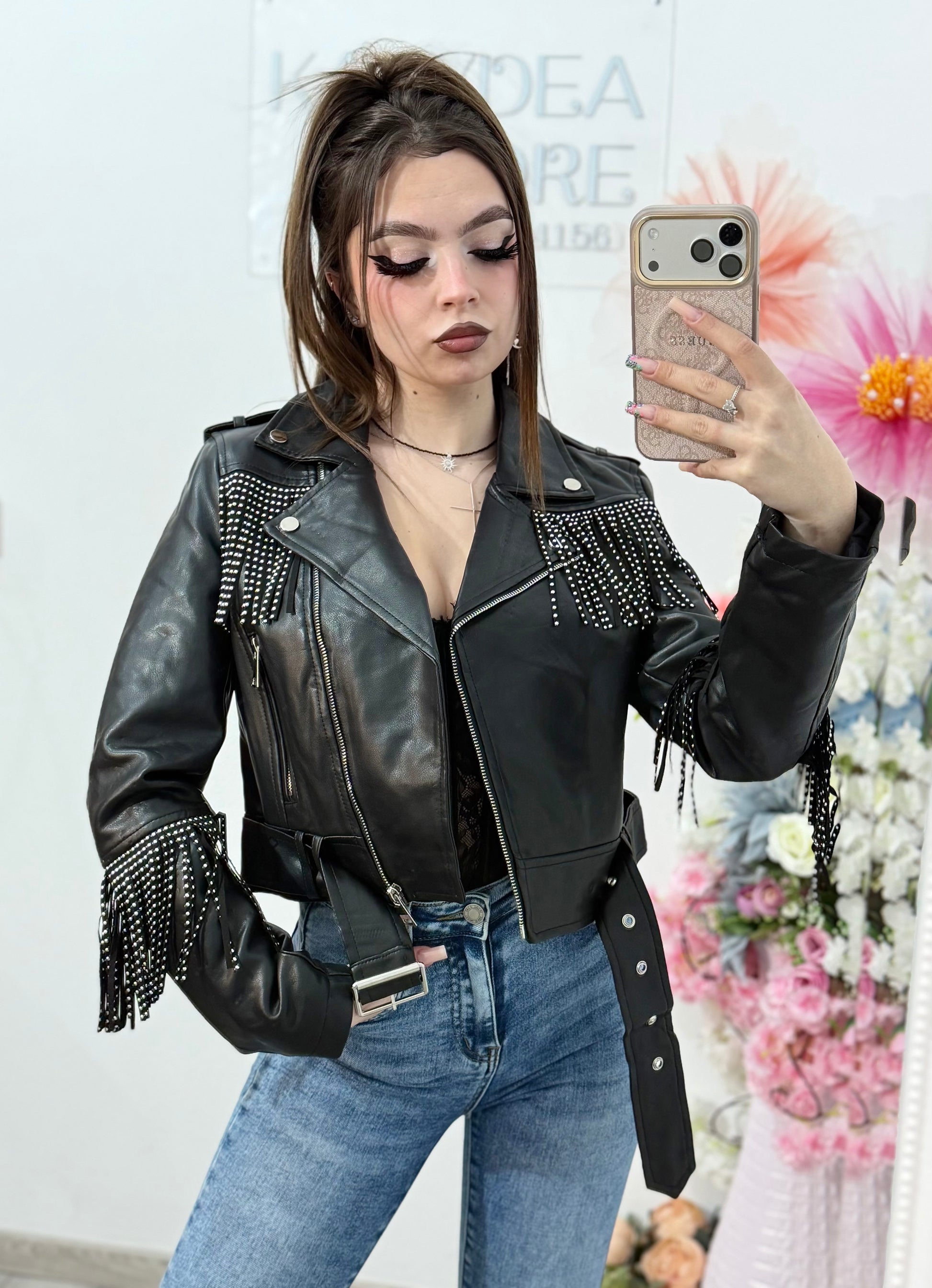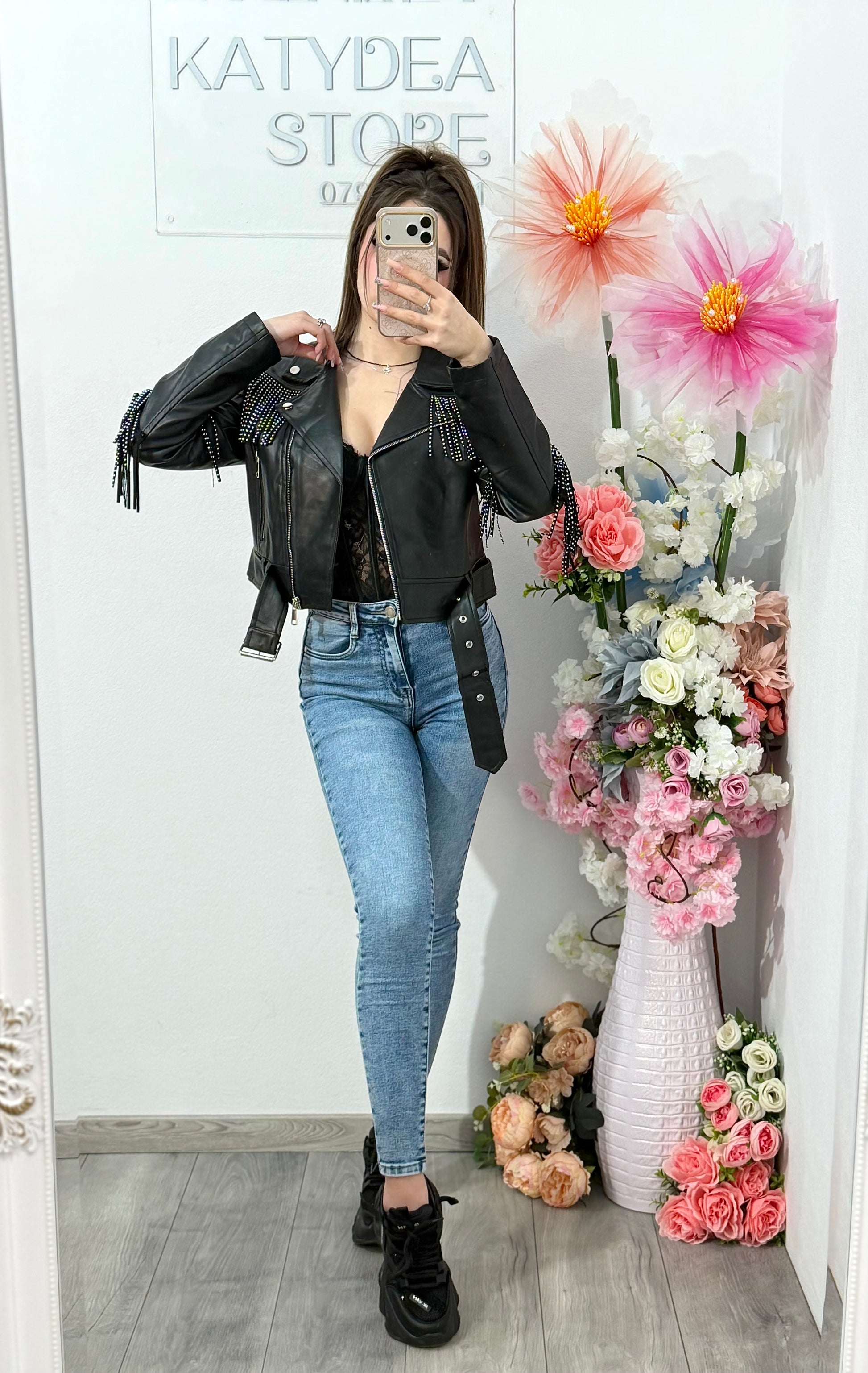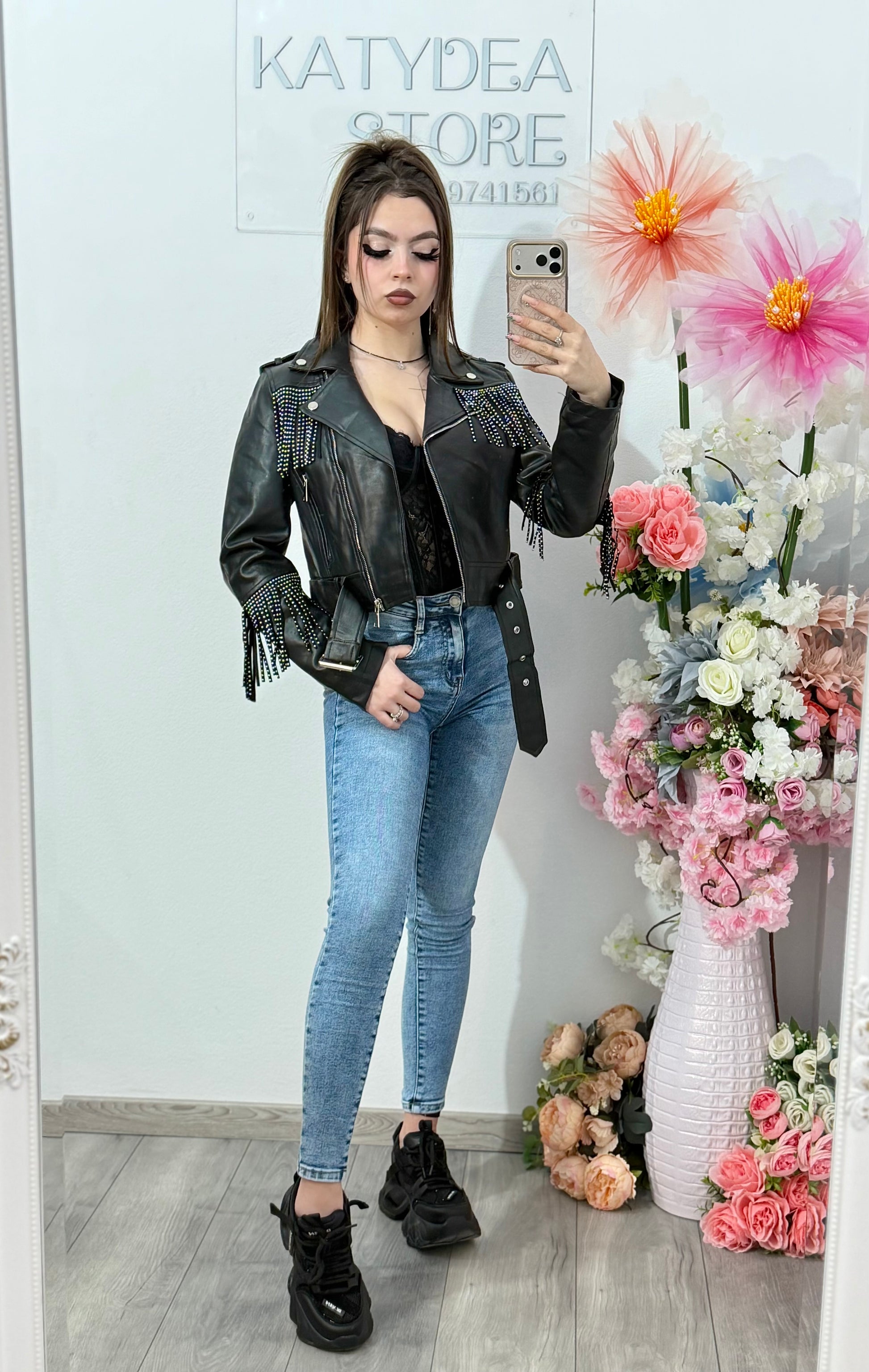 Geacă scurtă de damă în stil biker, cu franjuri decorative strălucitoare aplicate pe umeri și mâneci. Designul îmbină eleganța cu stilul rock, fiind perfect pentru outfituri moderne și îndrăznețe. Croiala scurtă și talia ajustabilă cu curea oferă o siluetă feminină și bine definită.
