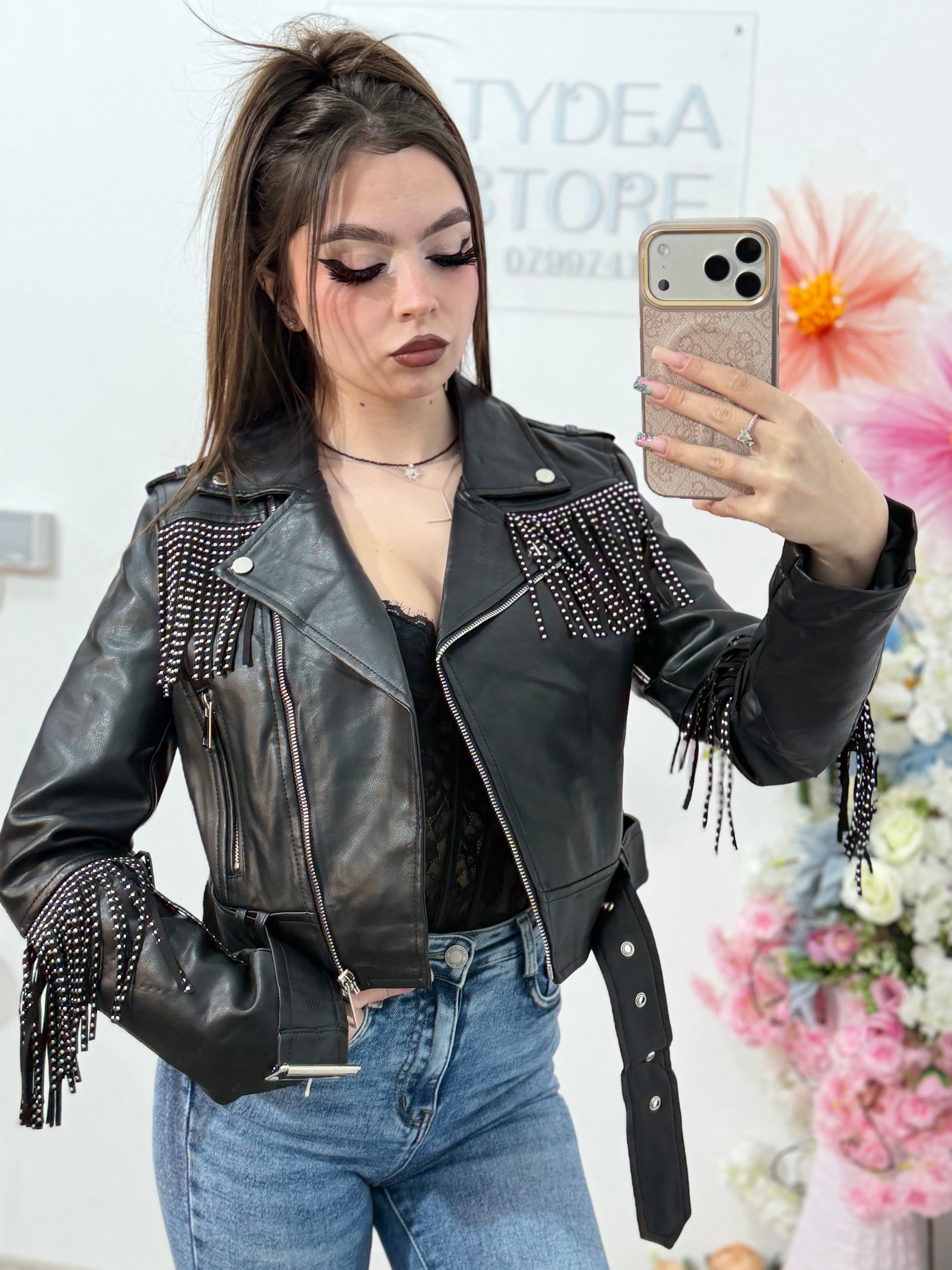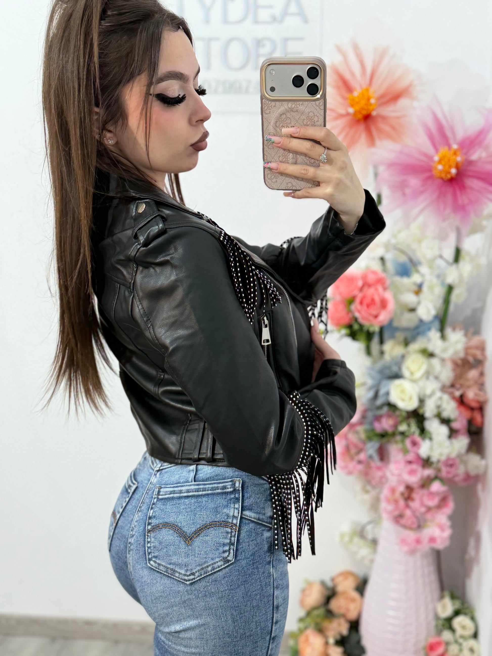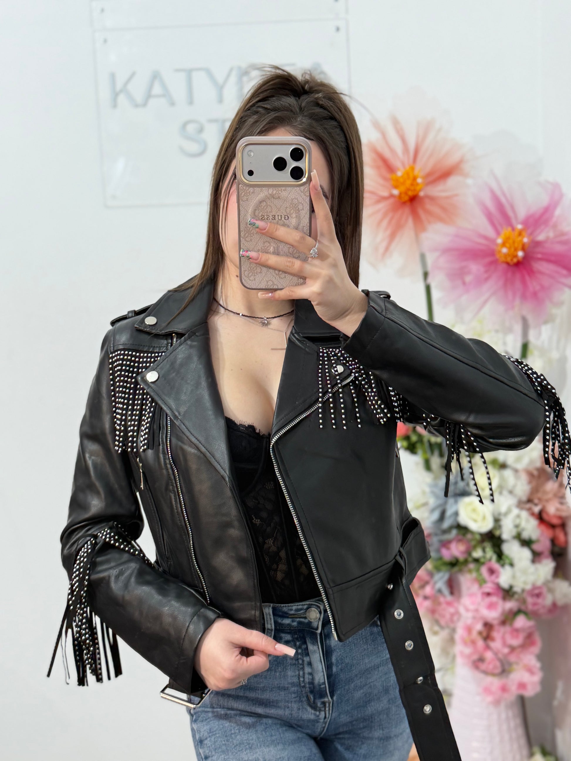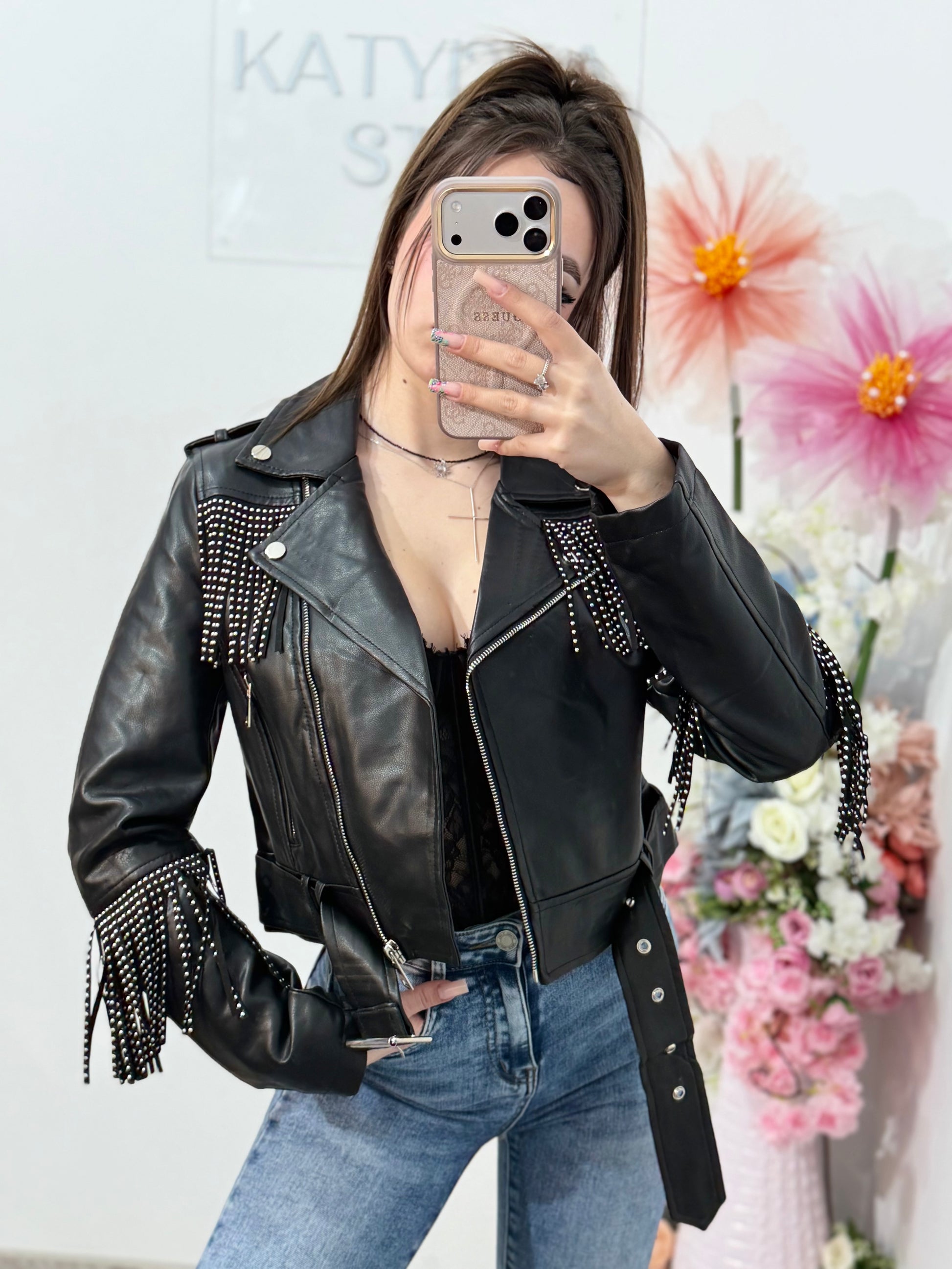 Geacă scurtă de damă în stil biker, cu franjuri decorative strălucitoare aplicate pe umeri și mâneci. Designul îmbină eleganța cu stilul rock, fiind perfect pentru outfituri moderne și îndrăznețe. Croiala scurtă și talia ajustabilă cu curea oferă o siluetă feminină și bine definită.