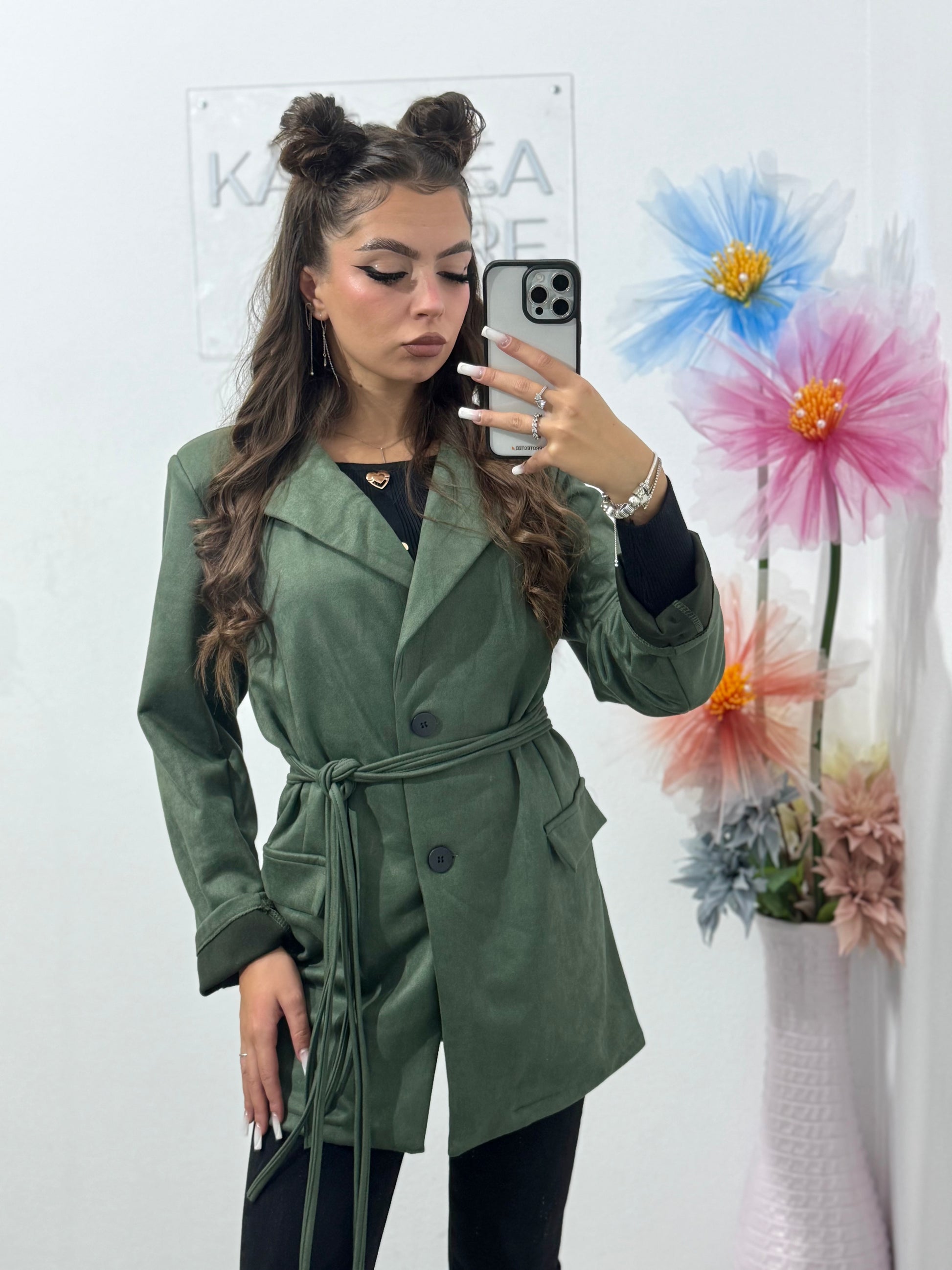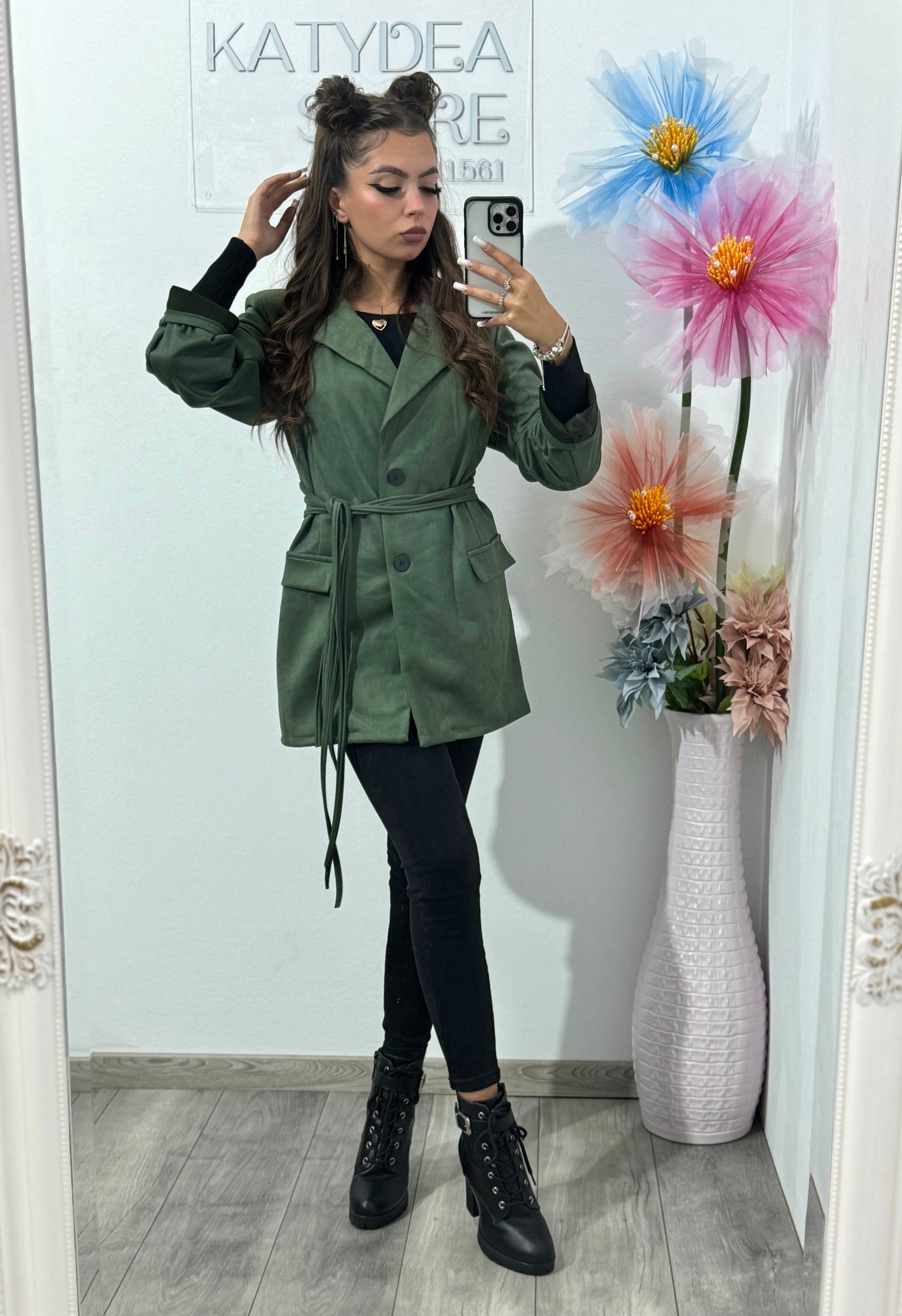 Palton elegant din material tip suede vernil, cu un design modern și versatil.