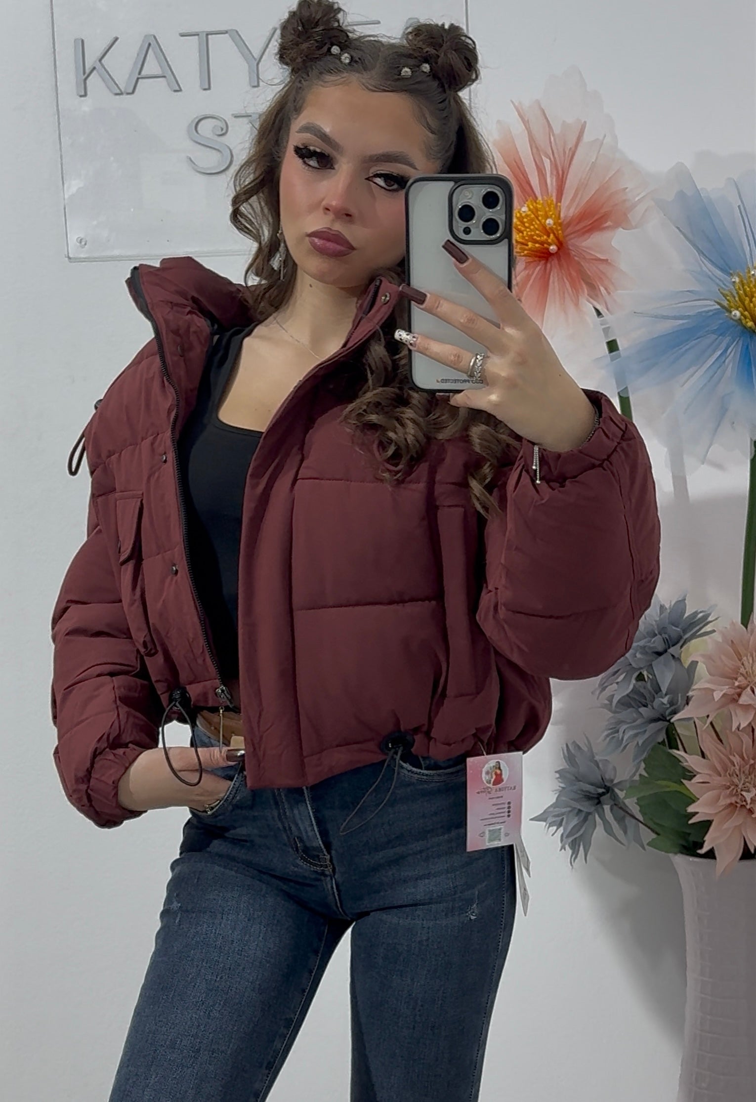 Geaca din imagine este o geacă scurtă, tip puffer, de culoare bordo.Are un design modern și călduros, perfect pentru sezonul rece.