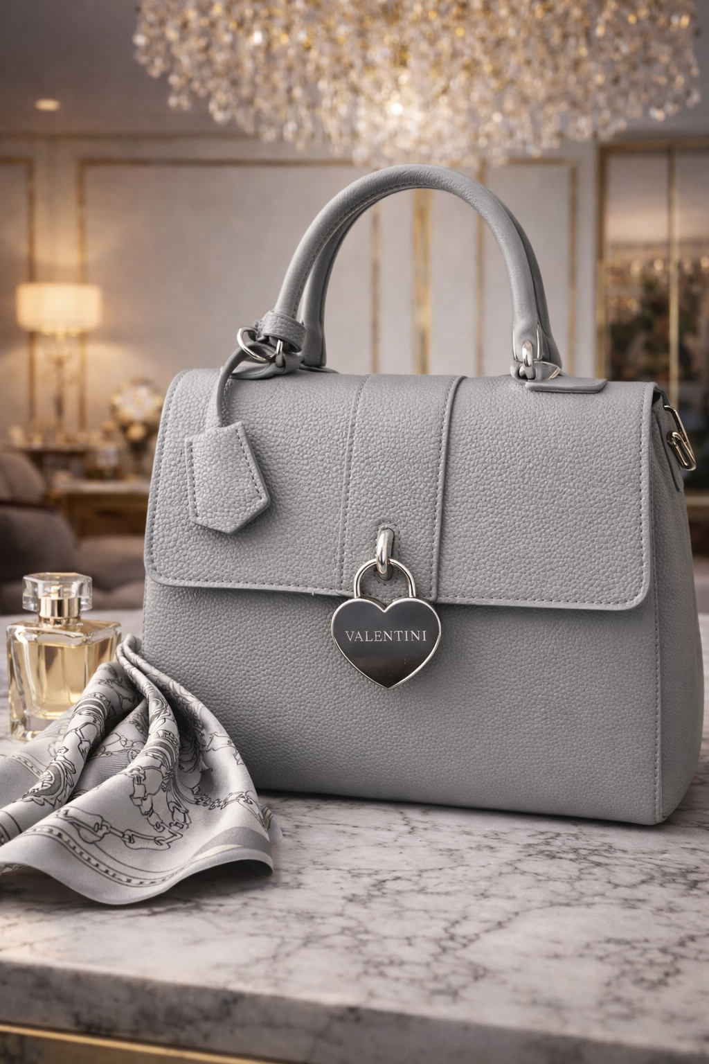 🔹 Accente metalice: în partea frontală se remarcă un lacăt decorativ în formă de inimă, cu inscripția VALENTINI, care adaugă un aer feminin și elegant.