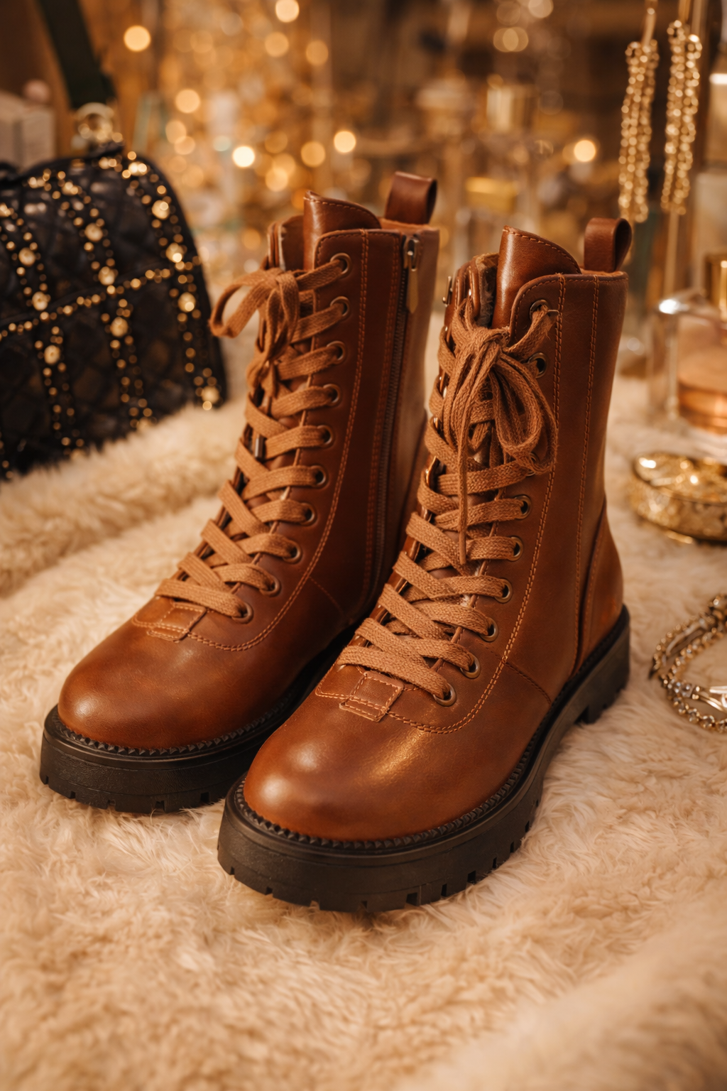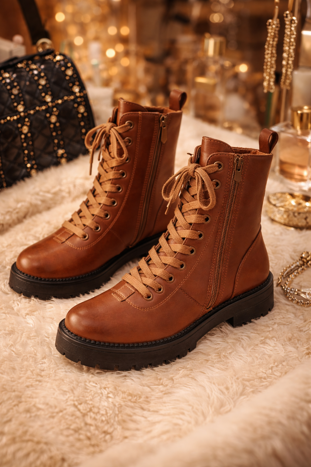Acest model de ghete damă impresionează printr-un design modern și versatil, ideal pentru sezonul rece. Realizate din piele ecologică de calitate, într-o nuanță elegantă de maro cognac, ghetele oferă un aspect rafinat și ușor de asortat.