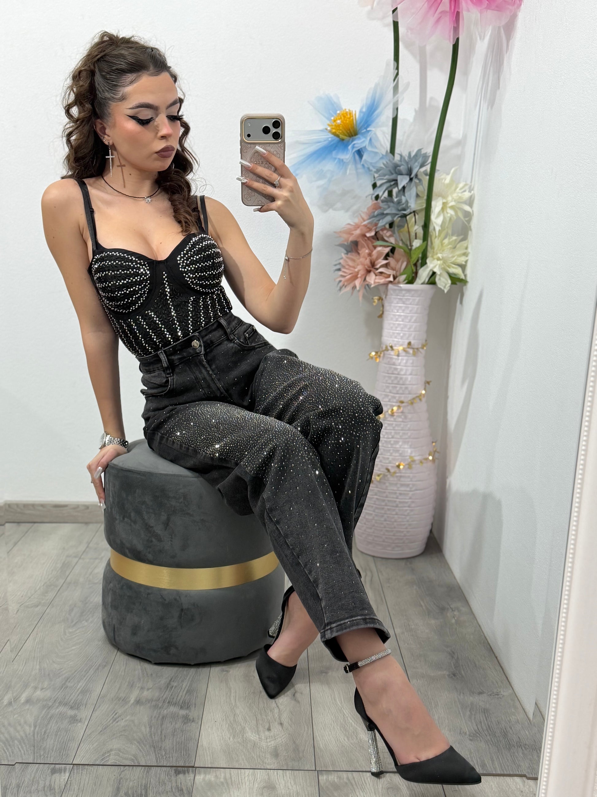Blugi negri cu talie înaltă și croială conică, realizați din denim elastic pentru confort la purtare. Modelul este decorat integral cu strasuri fine, aplicate atât în față cât și pe spate, oferind un efect glam spectaculos. Croiala evidențiază silueta, iar materialul se așază frumos pe picior. Ideal pentru ținute de seară, party, evenimente sau outfituri statement.