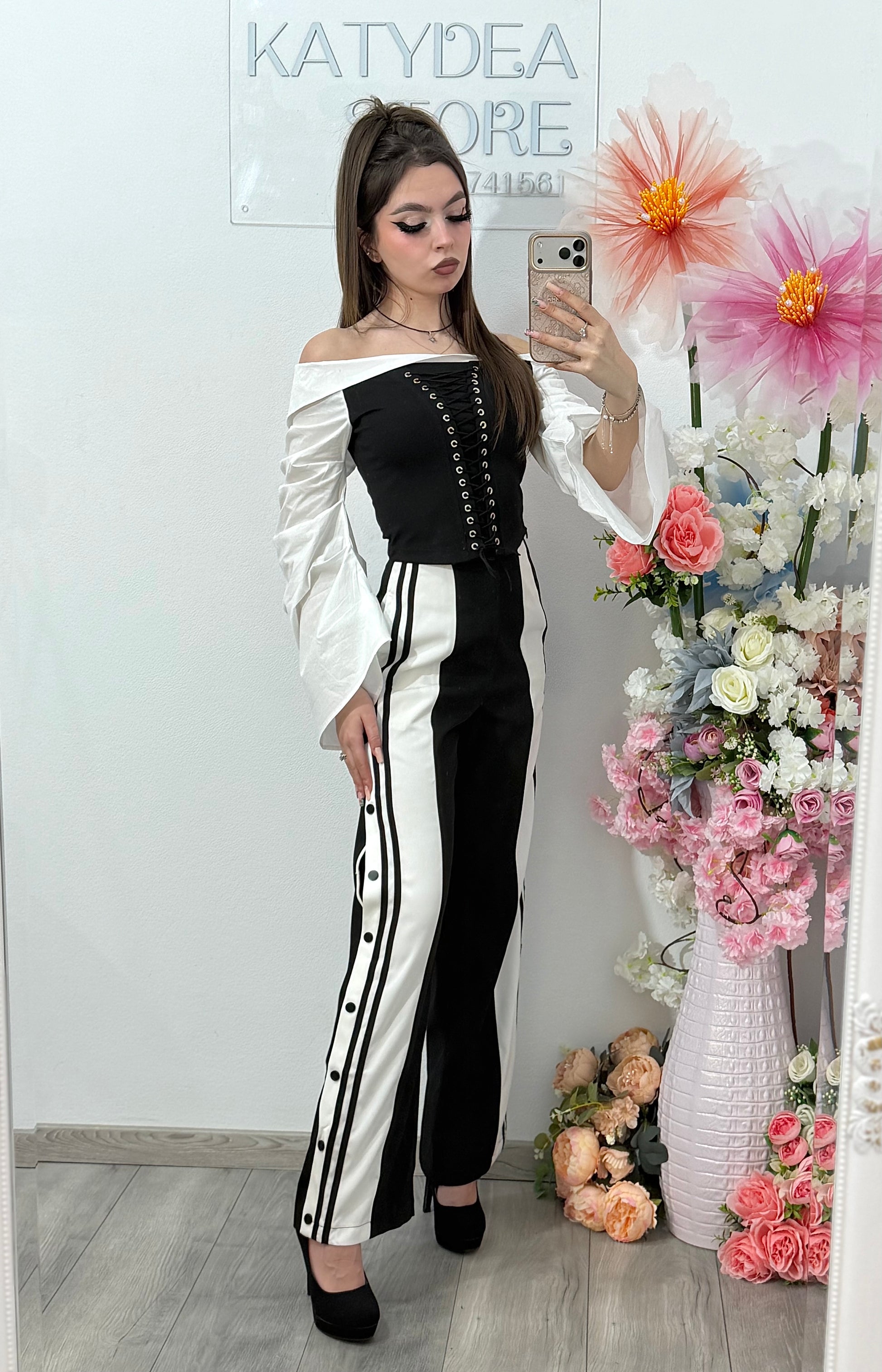 Pantaloni moderni, cu design contrastant alb-negru, perfecți pentru un look îndrăzneț și elegant. Modelul este cu talie înaltă și croială dreaptă, care alungește vizual silueta și oferă un efect foarte stilat.