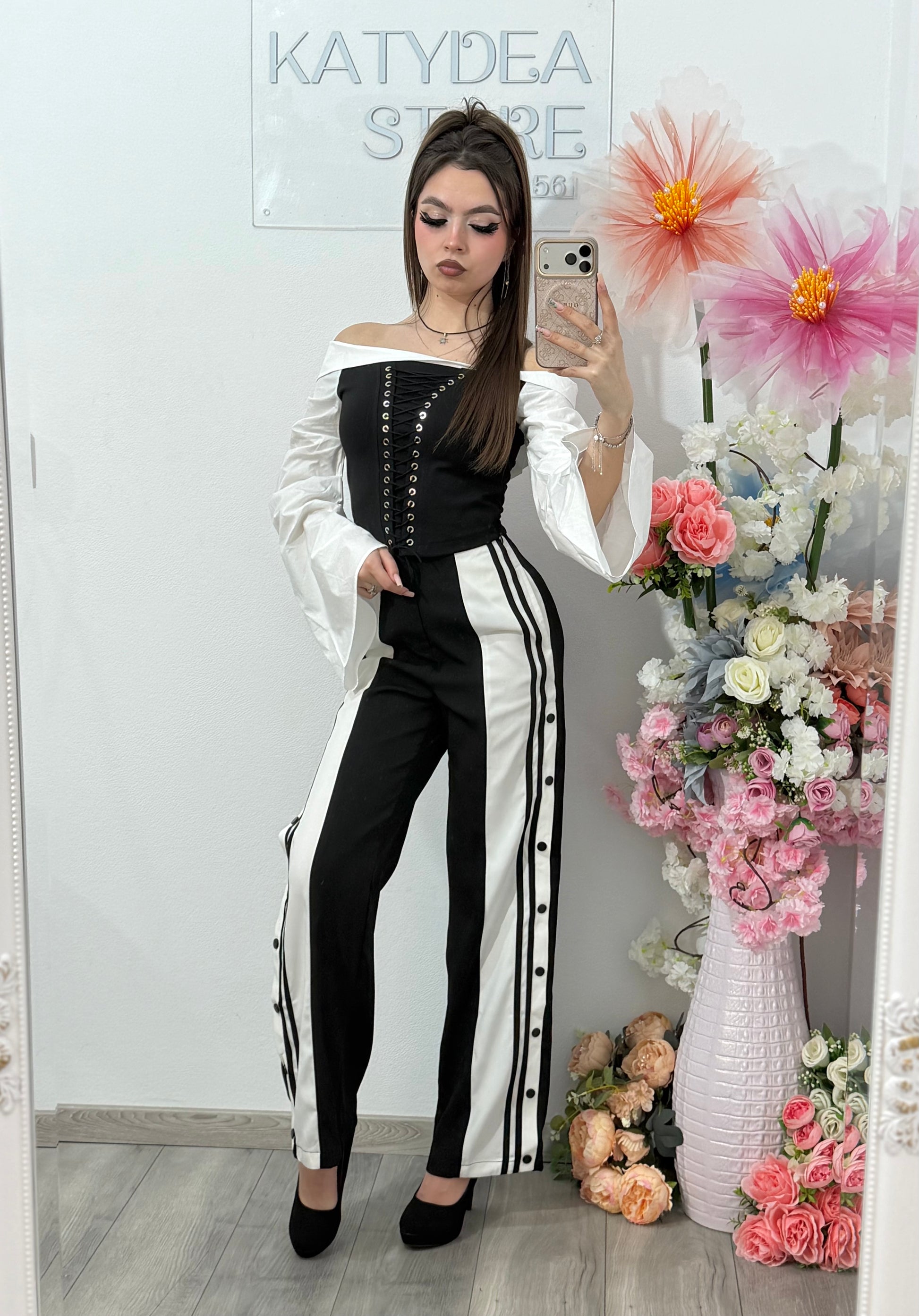 Pantaloni eleganți alb-negru cu capse laterale 🤍🖤