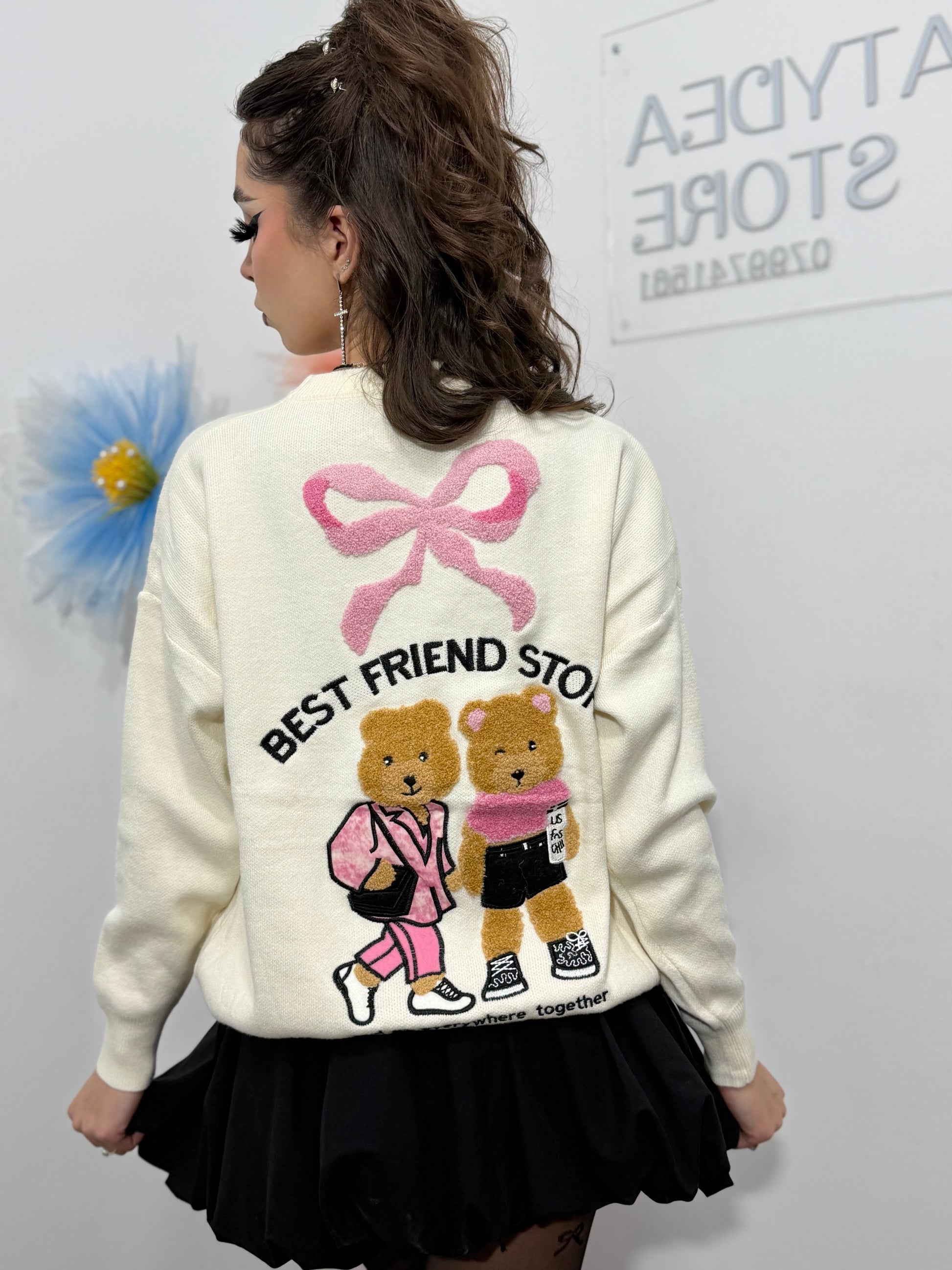 Pulover deosebit accesorizat cu 2 ursuleți simpatici împreună cu textul BEST FRIEND