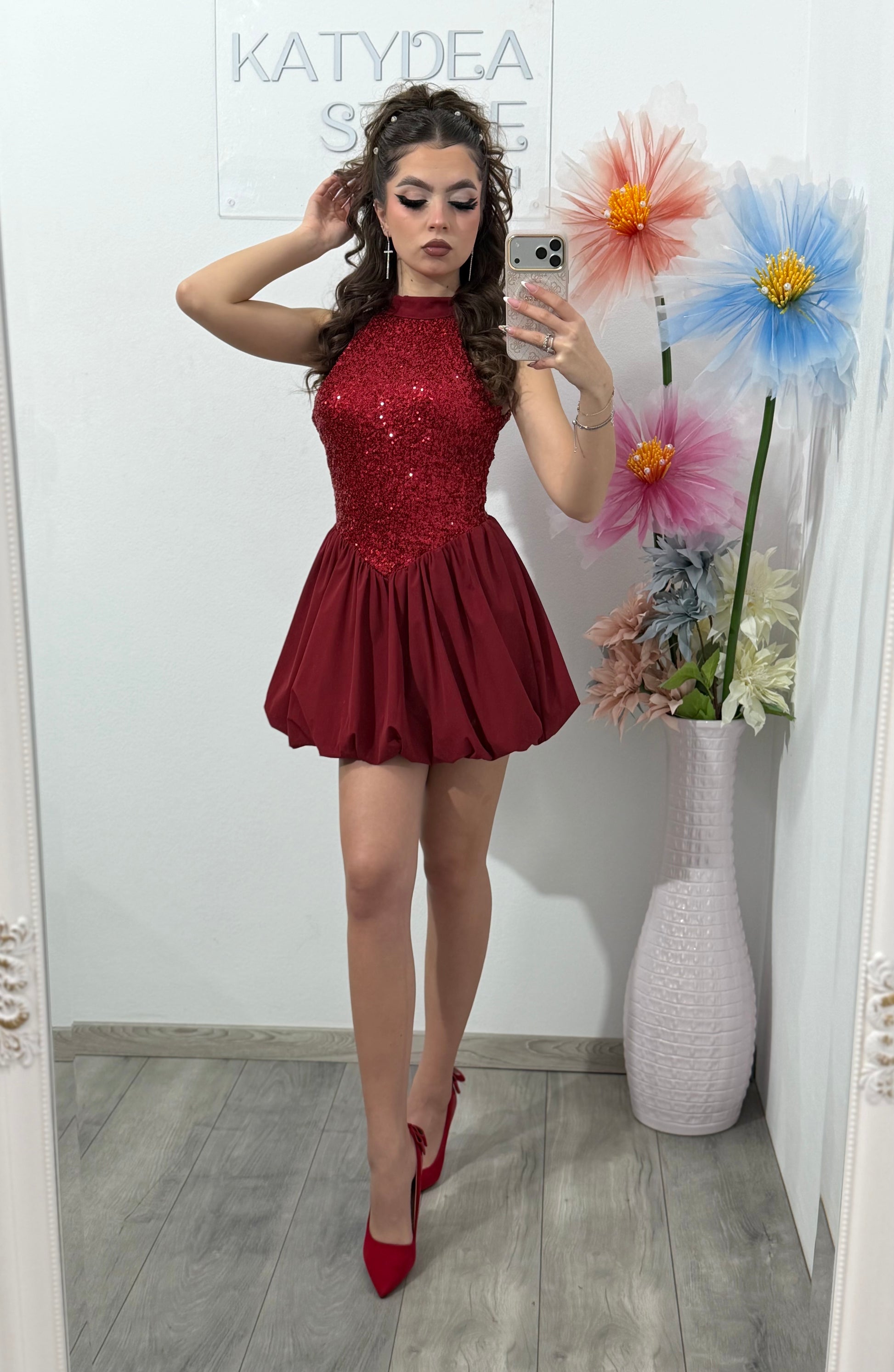 Rochie elegantă de ocazie, într-o nuanță intensă de bordo, ideală pentru evenimente speciale. Partea superioară este realizată din material cu paiete fine, care oferă un efect strălucitor și sofisticat, iar croiala tip halter evidențiază frumos umerii și talia. Fusta este scurtă, vaporoasă, din material lejer, cu volum delicat, ce oferă un aspect feminin și jucăuș. Rochia are o croială cambrată pe talie, punând în valoare silueta.