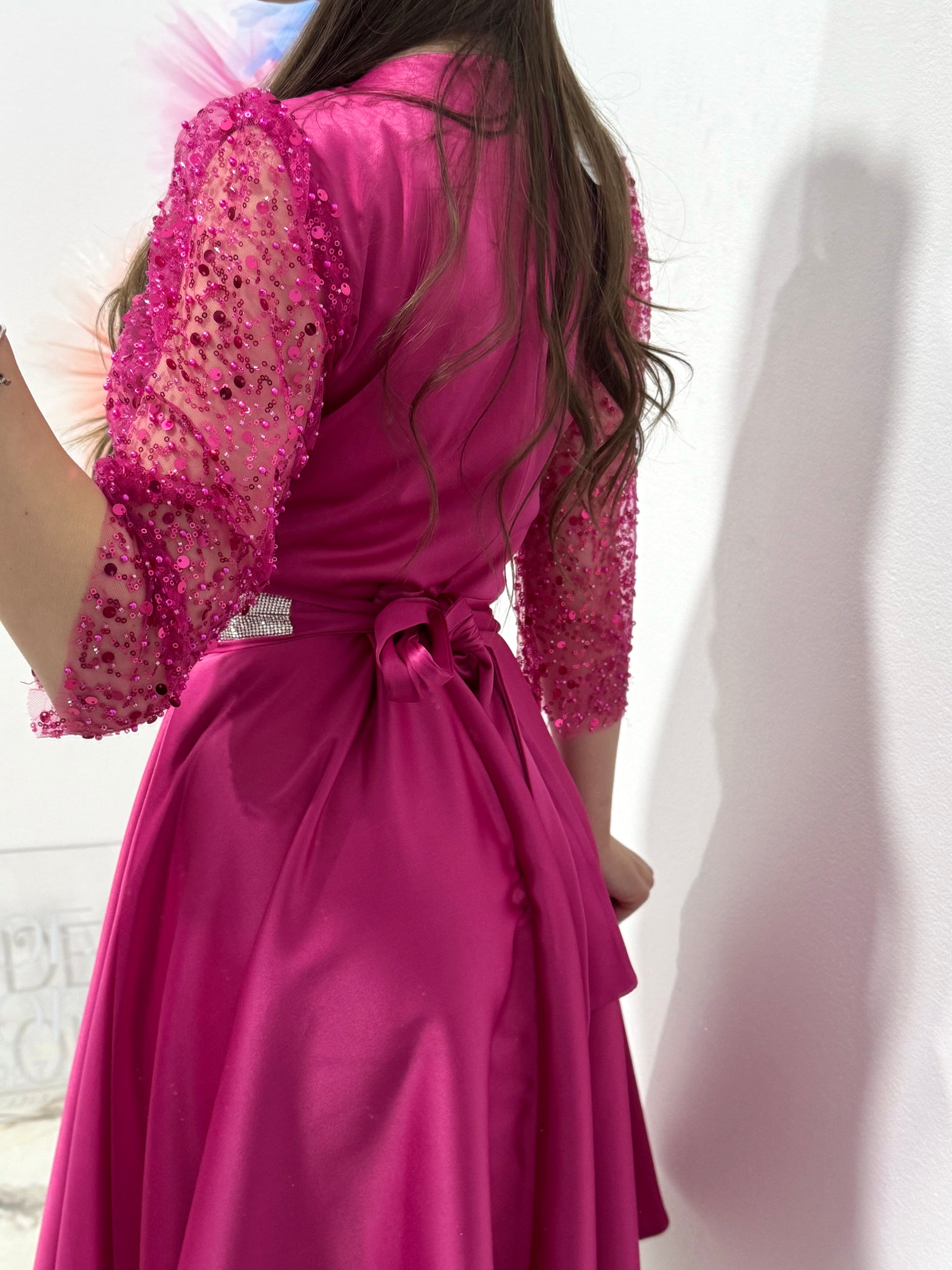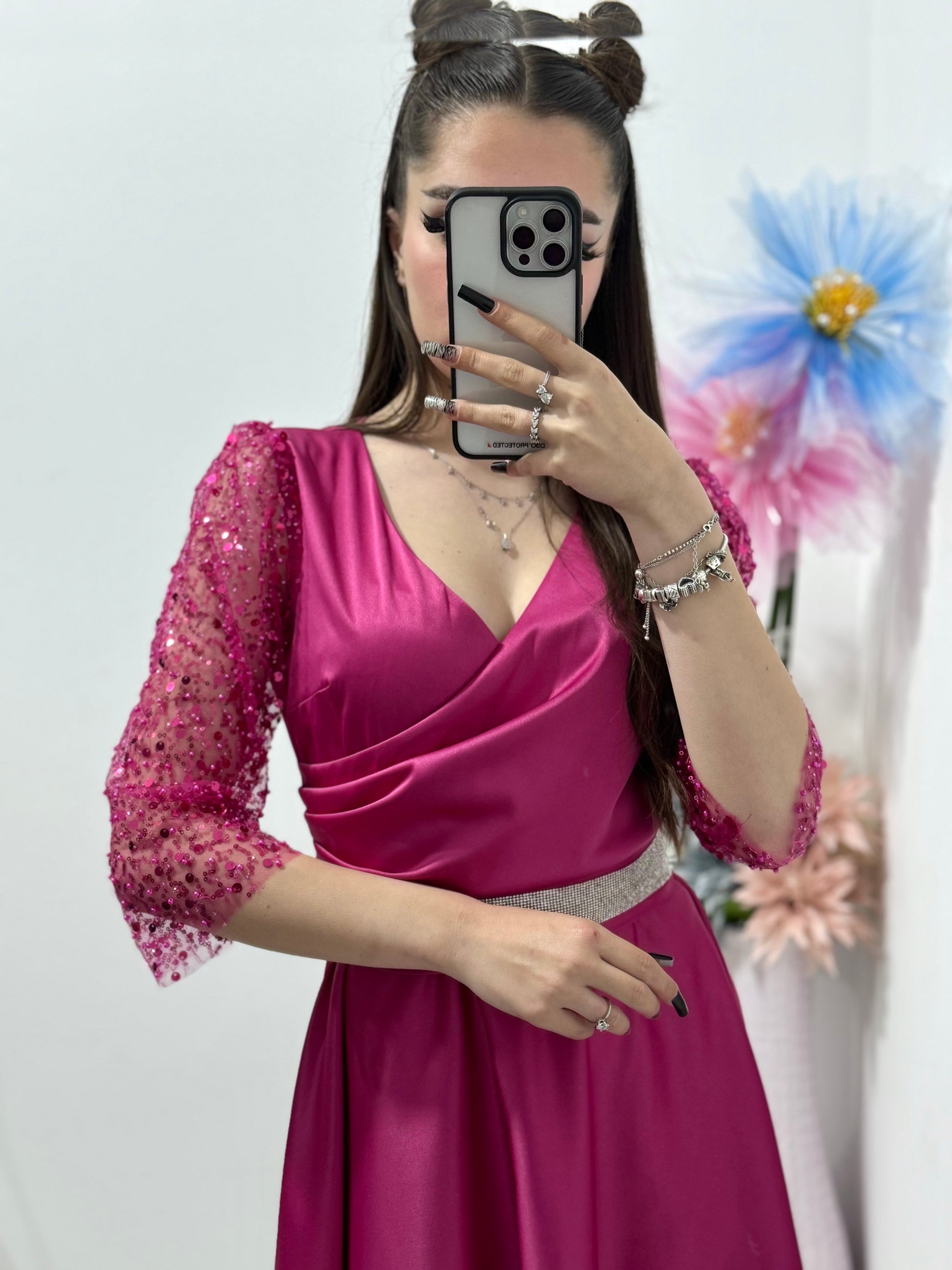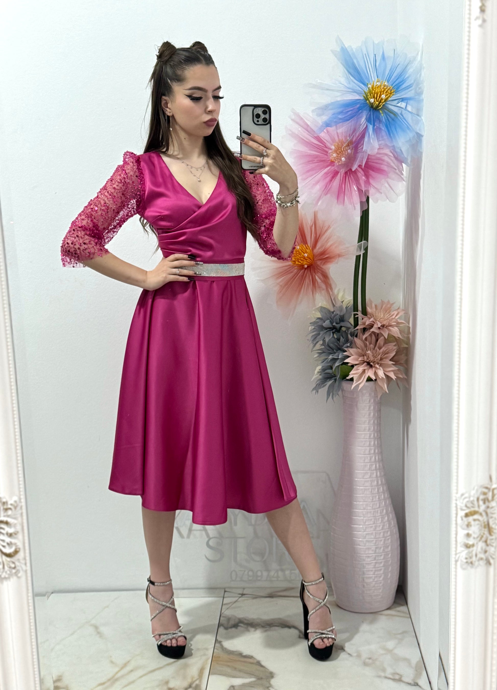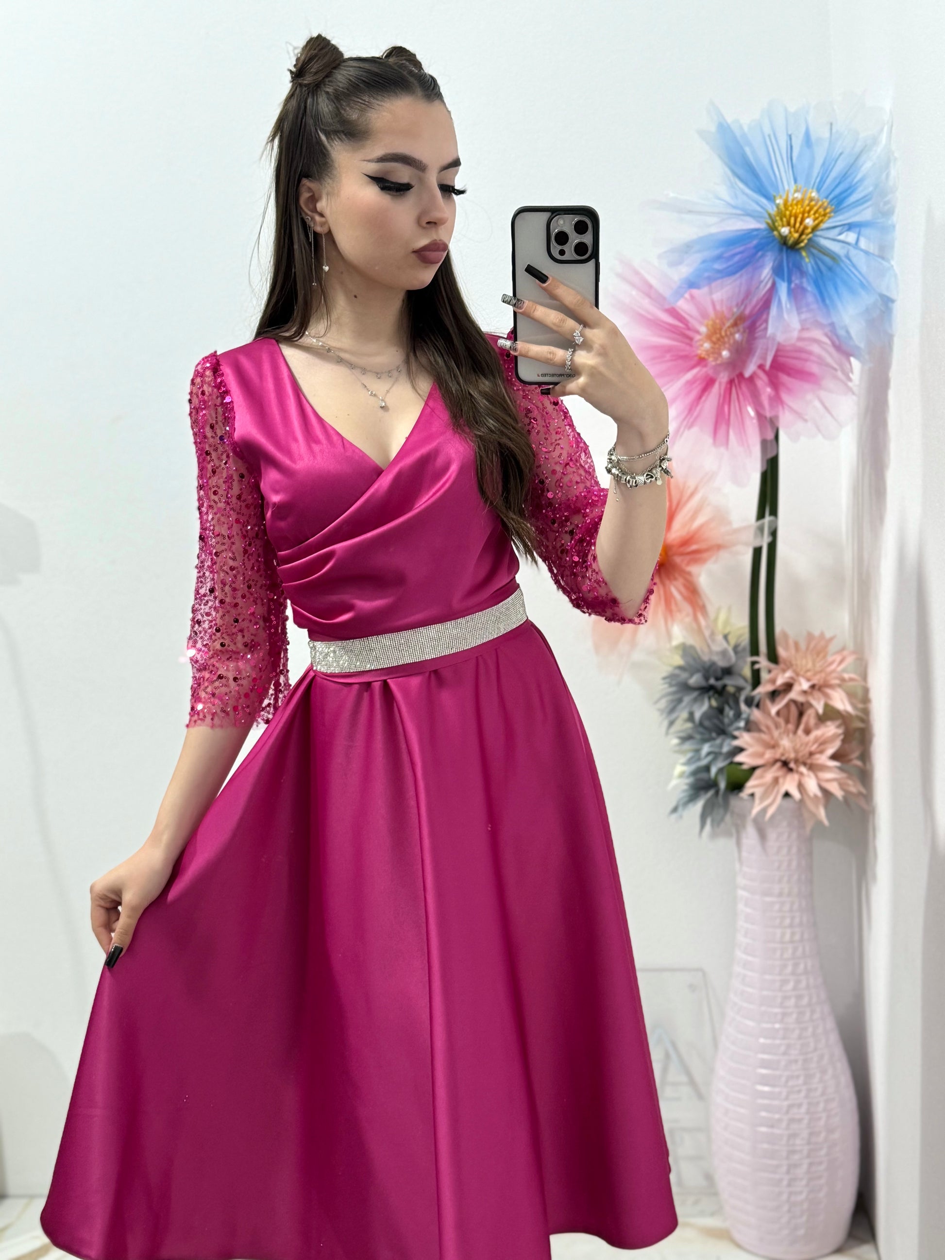 Rochie eleganta confectionata din tafta si maneci din paiete. Fusta este in clos, se Inchide cu fermoar la spate si are bustul petrecut, in forma de V. Compozitie: 60% Poliester, 40% Elastan.