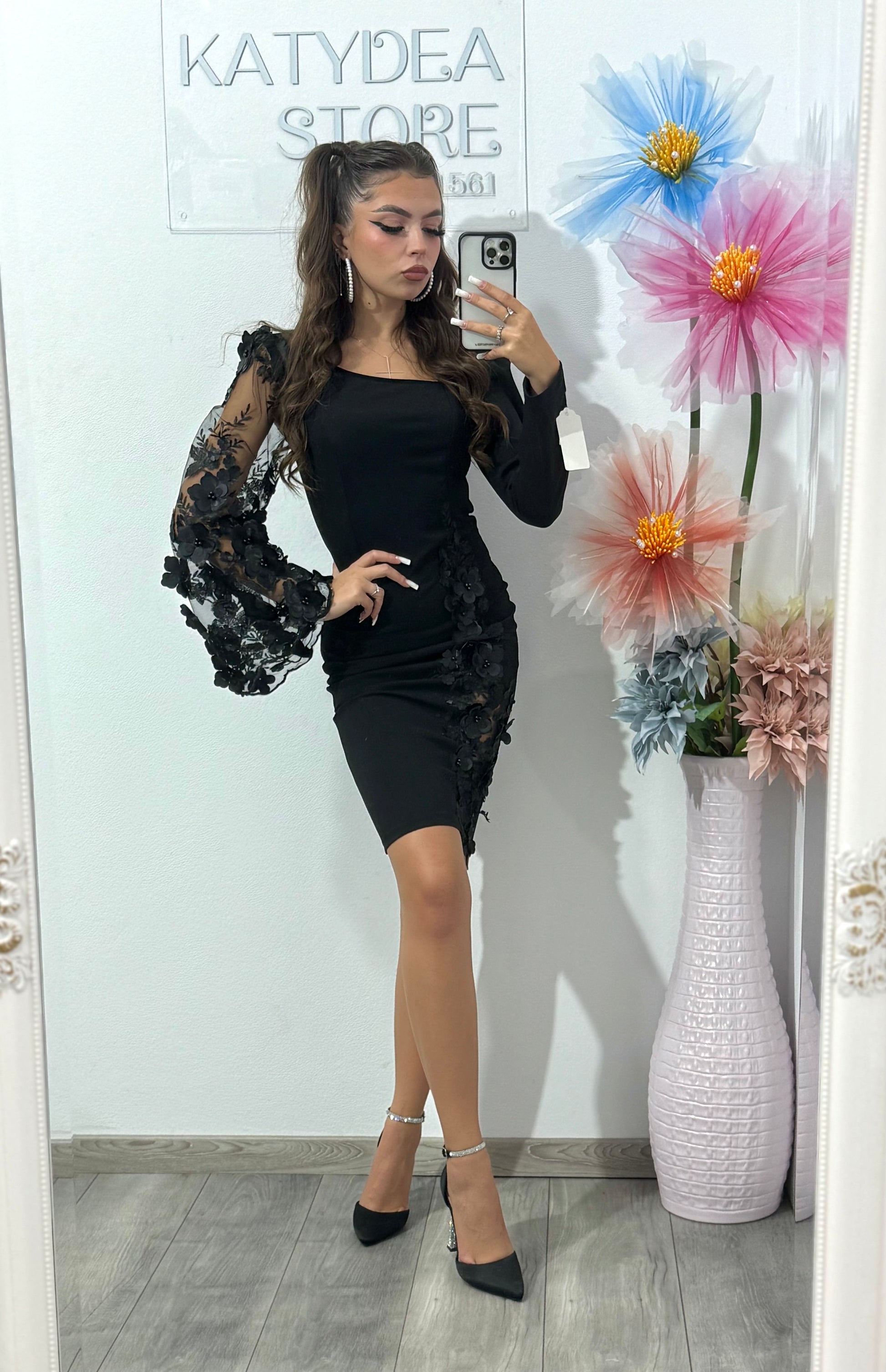 Rochie elegantă damă neagră, cu aplicații florale 3D și mânecă din tull