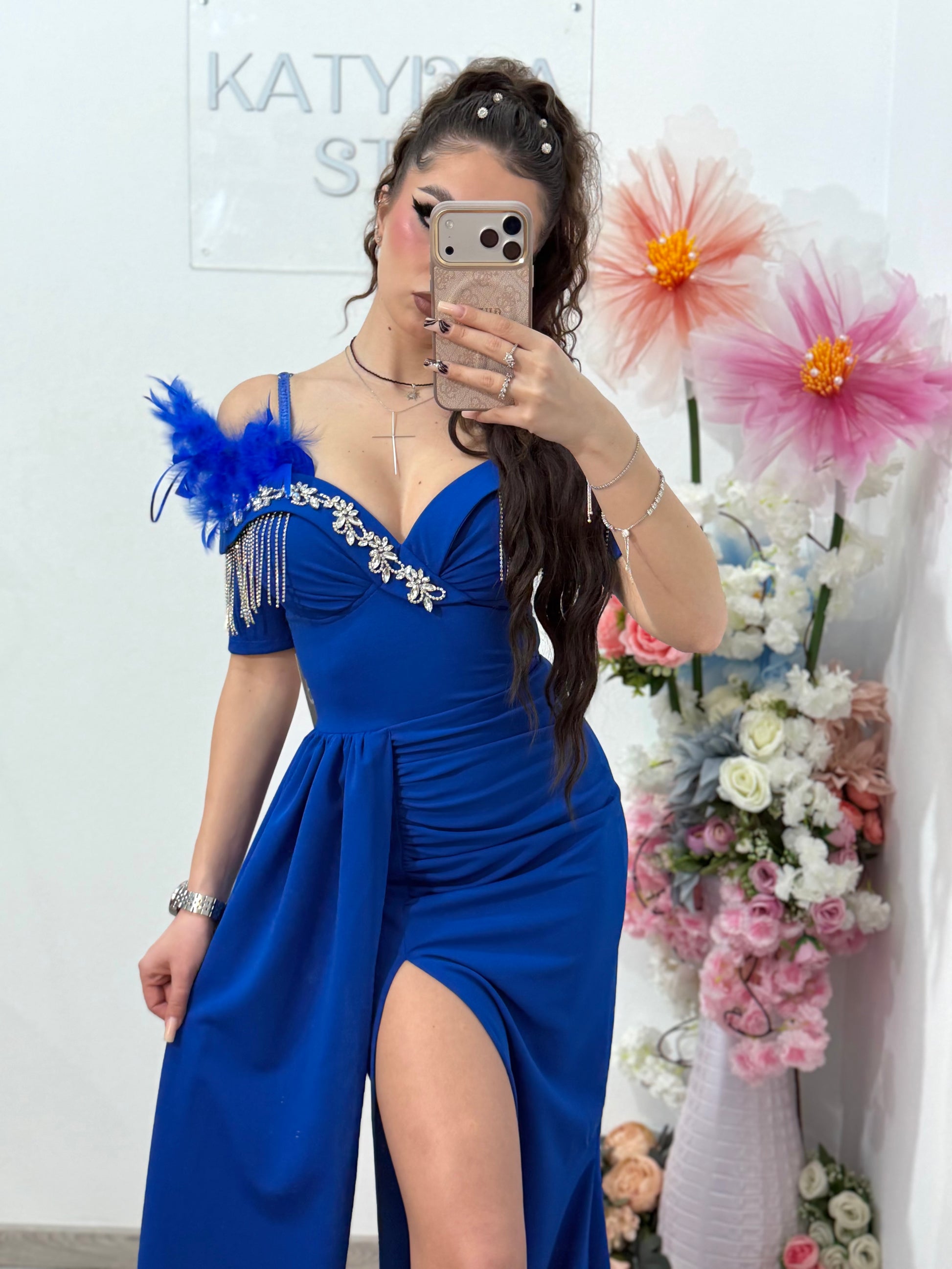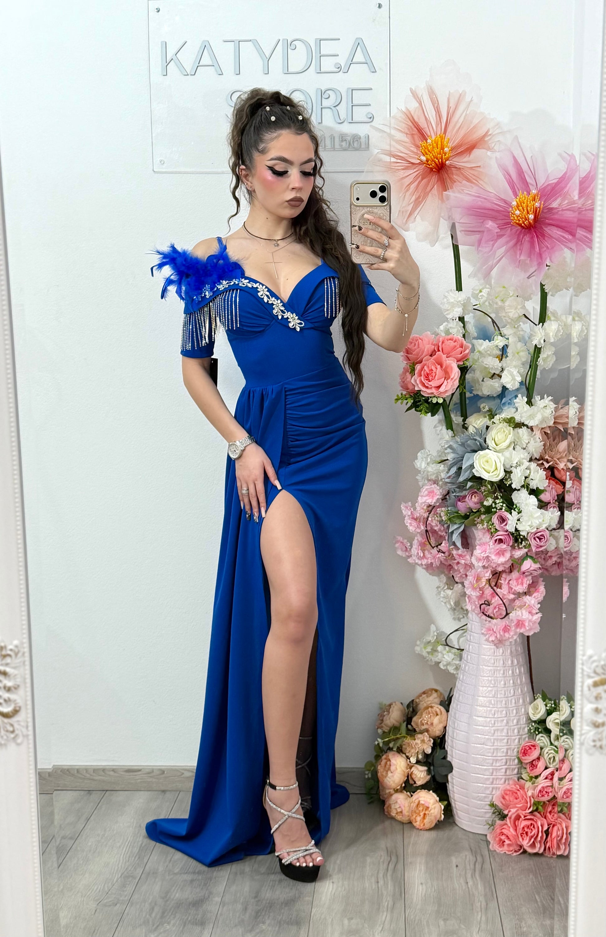 Rochie elegantă off-shoulder cu slit și detalii luxury albastra