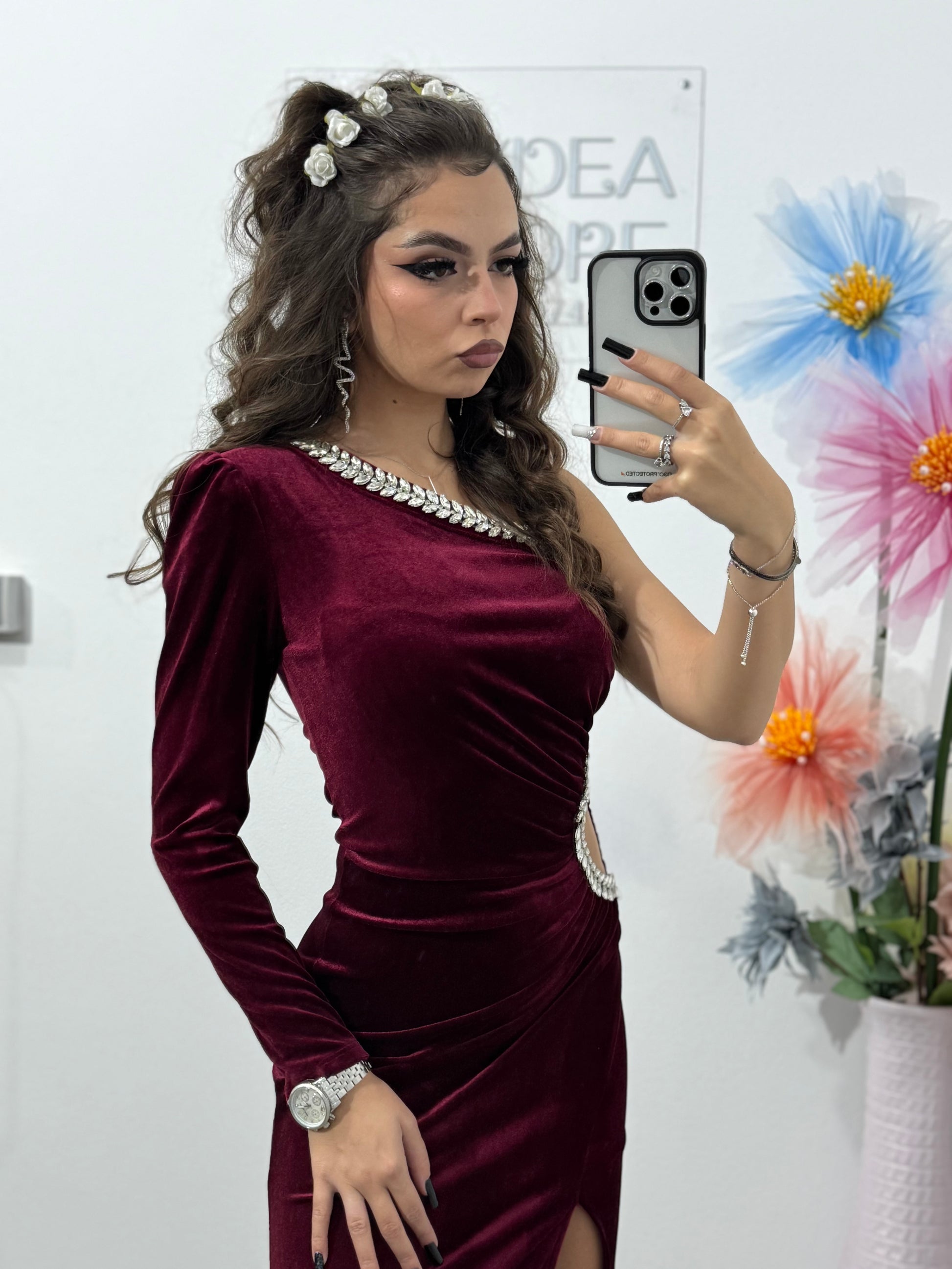 Rochie de seară elegantă, din catifea roșu-burgund, perfectă pentru evenimente speciale.