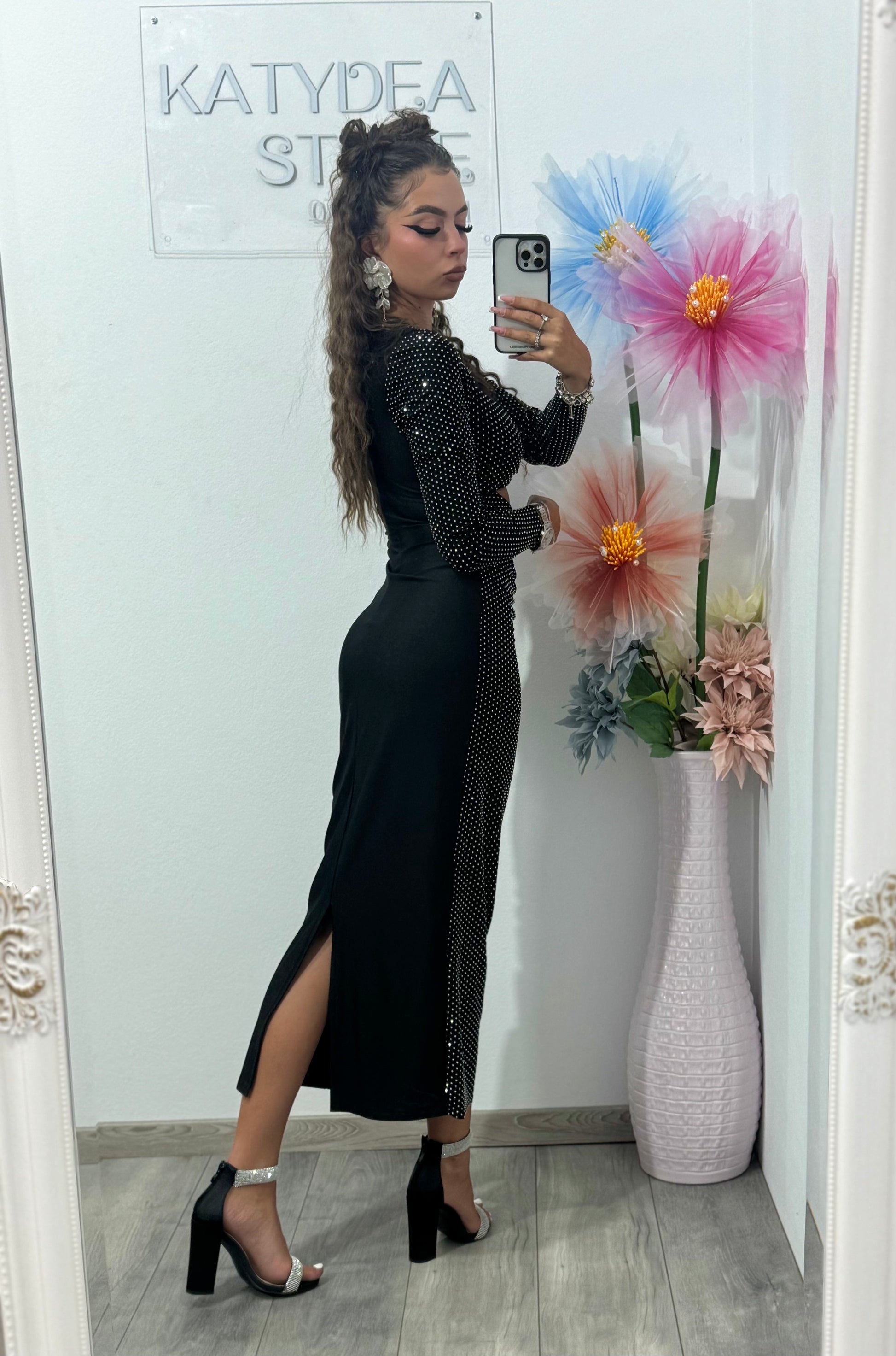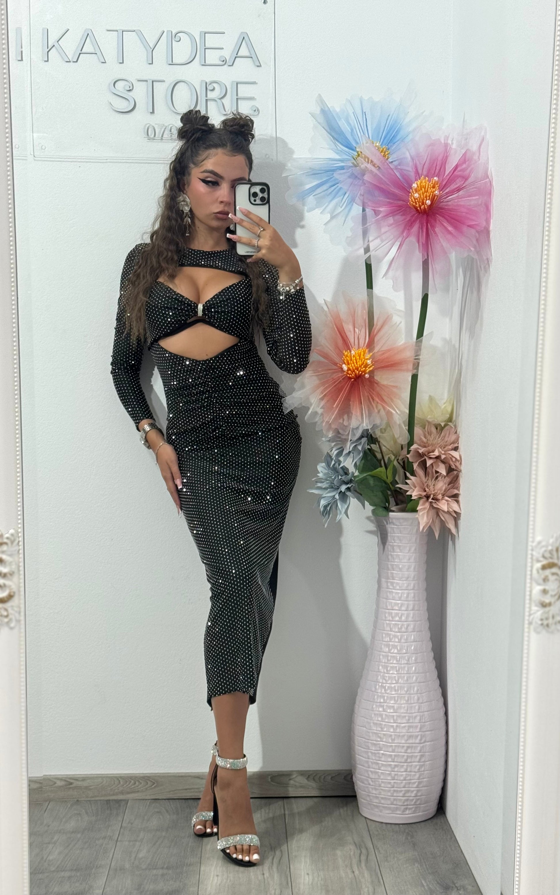 Rochie midi neagra cu cristale argintii ștanțate Glam